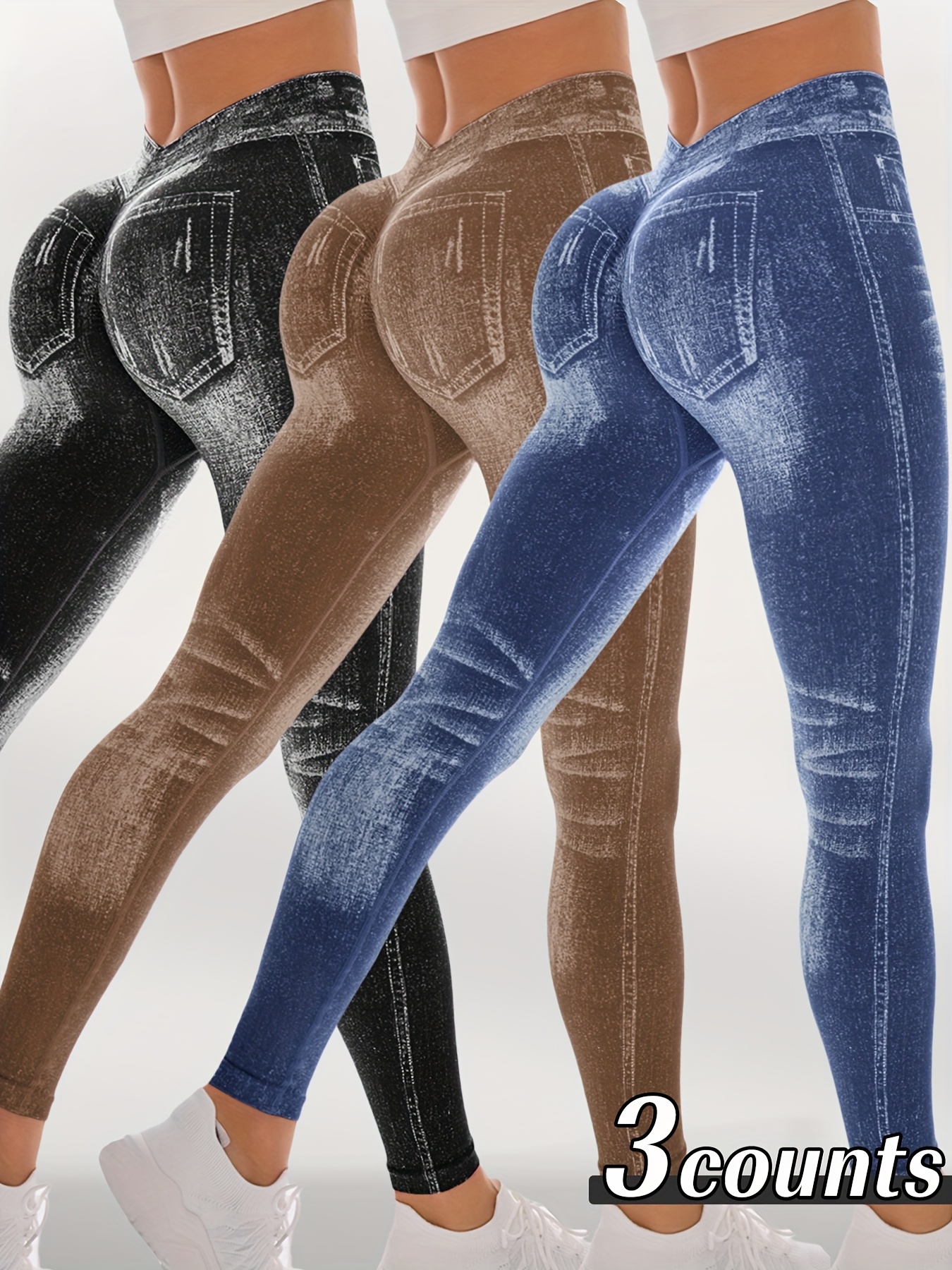 【imitation denim】[Denim Print/Imitation Denim] Women’S 3pcs Set High-Waist Tummy Control Yoga Leggings – Seamless Denim Print Stretchy Workout Pants with Multi-Color Options (, Brown, Grey, ) | All-Season Gym, Casual & Casual Attire | Slim-Fit Shapi