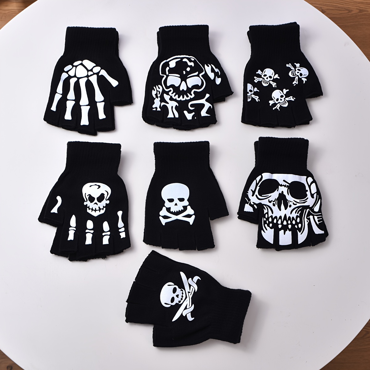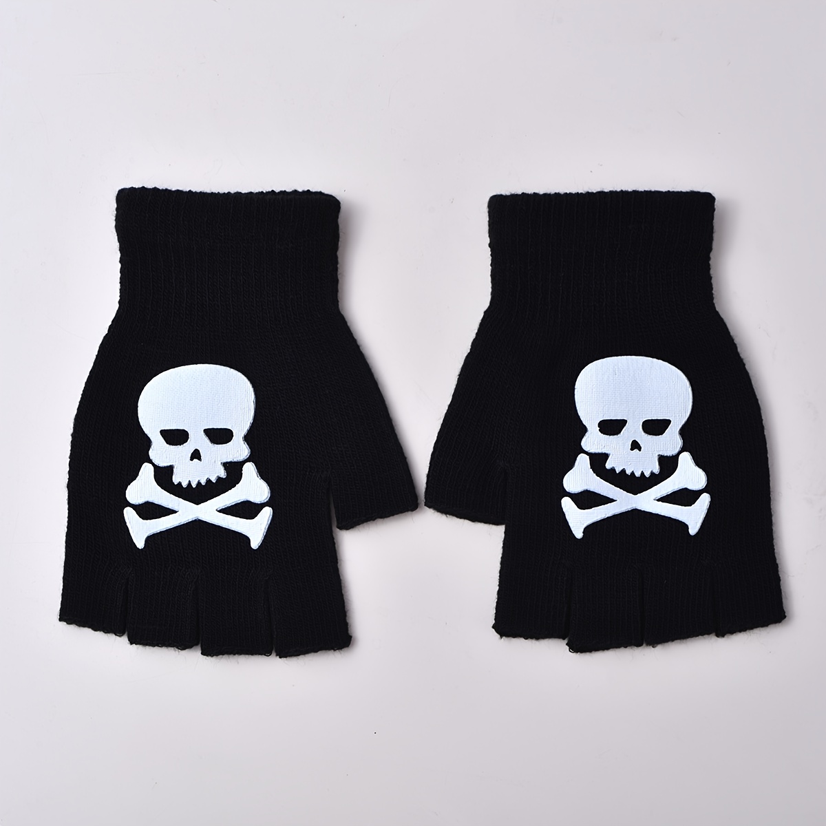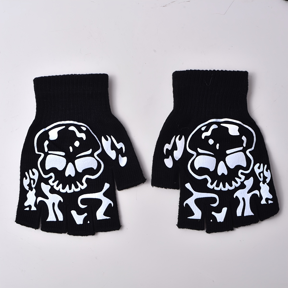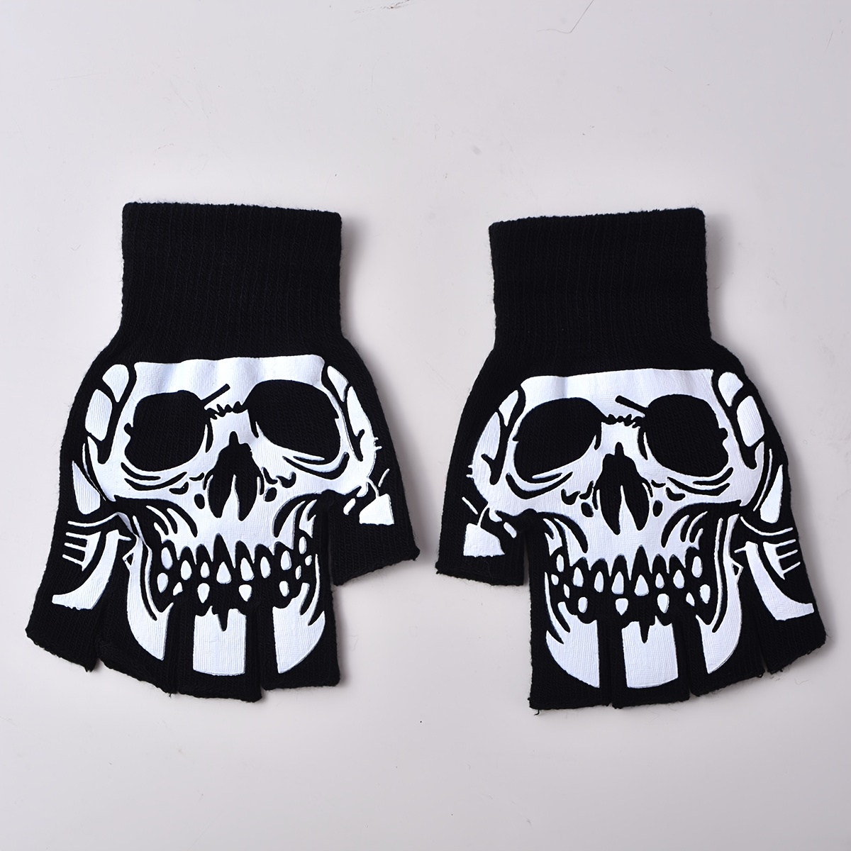 1 Pair Acrylic Halloween Skull Fingerless Gloves | Lightweight, Funky Style, Knit Fabric, Machine Washable