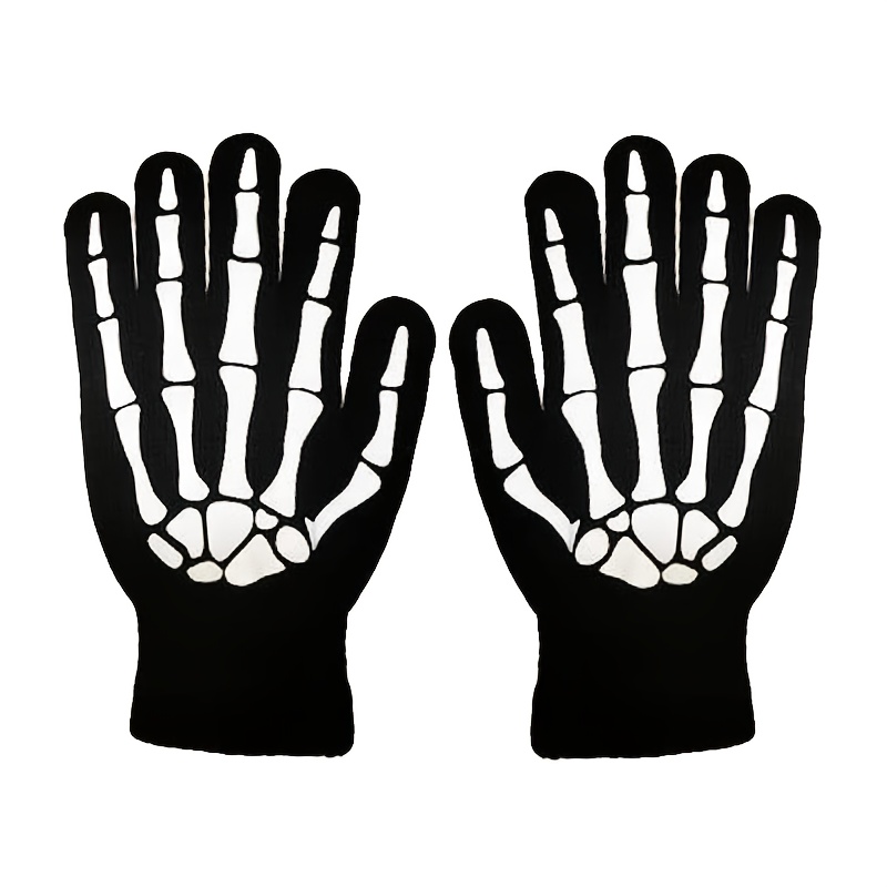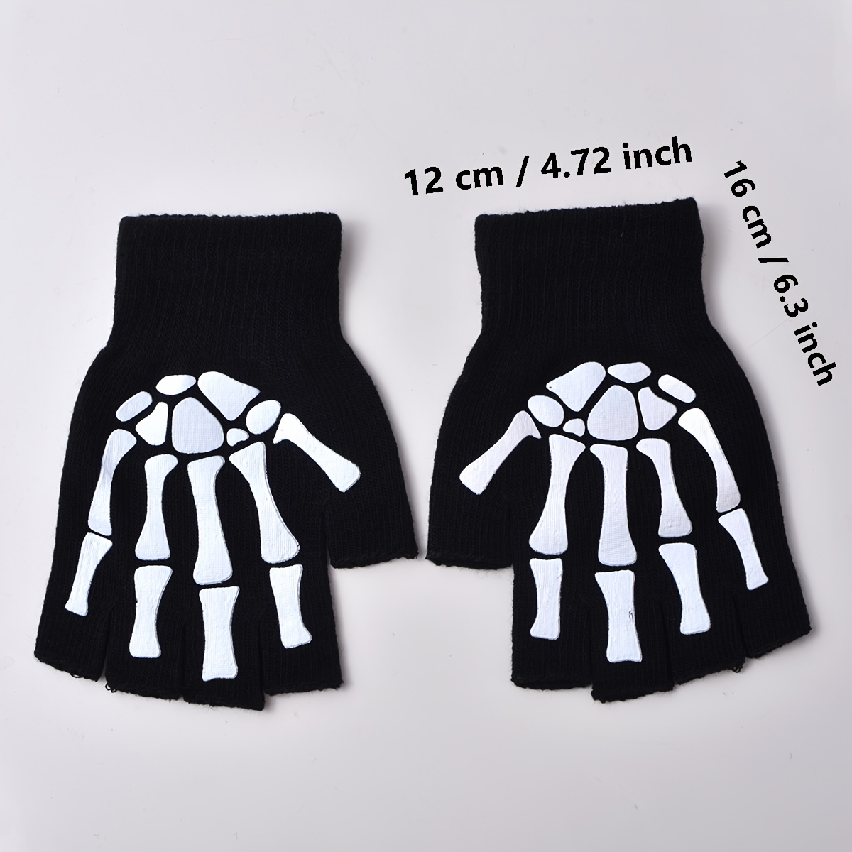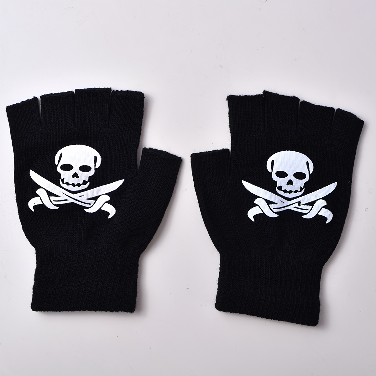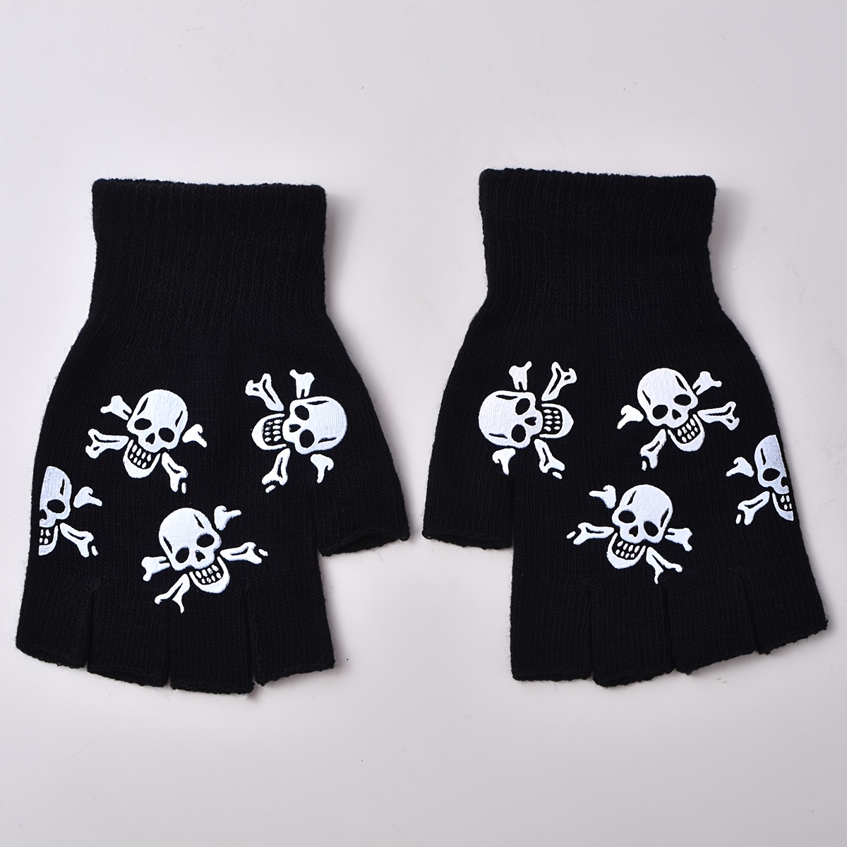 1 Pair Acrylic Halloween Skull Fingerless Gloves | Lightweight, Funky Style, Knit Fabric, Machine Washable