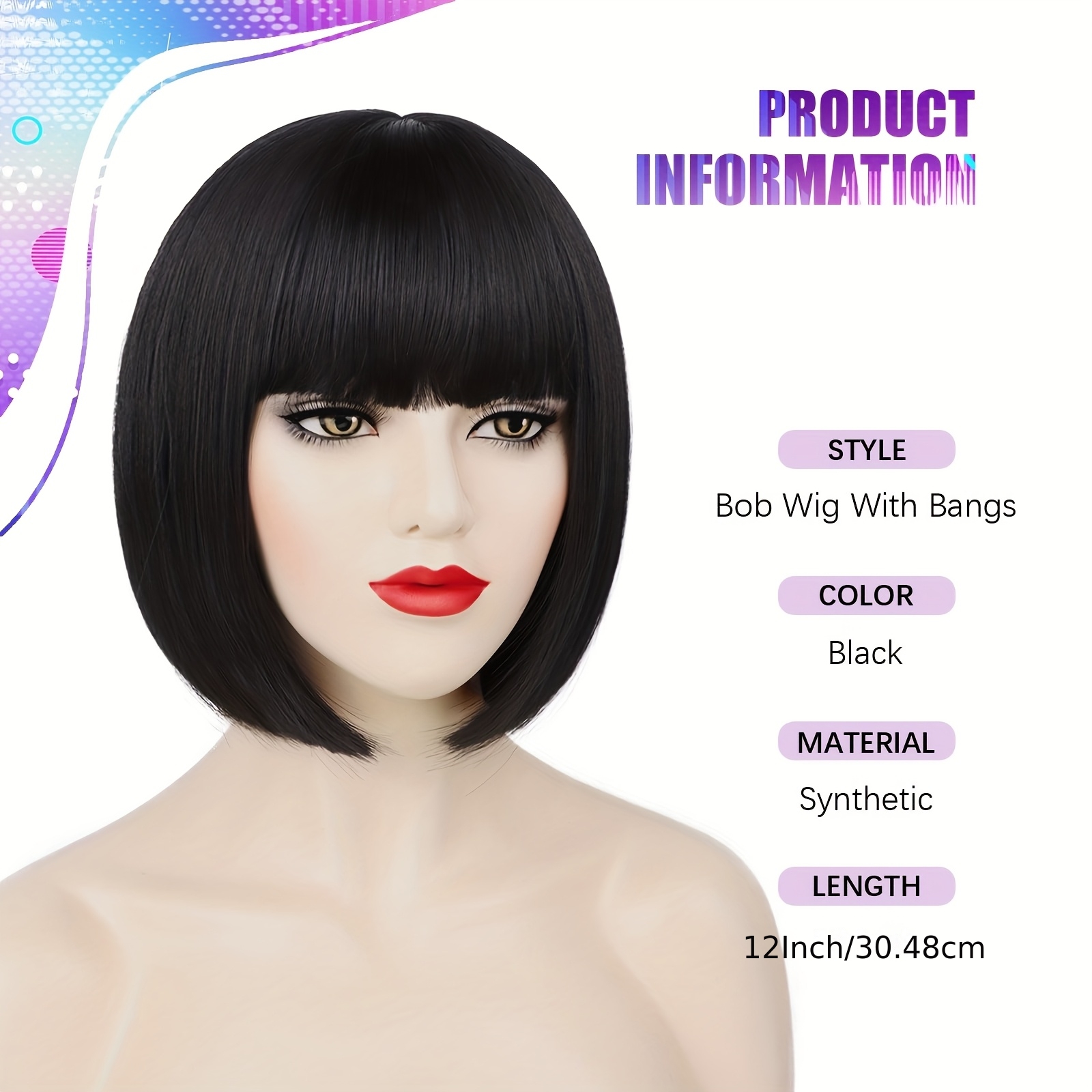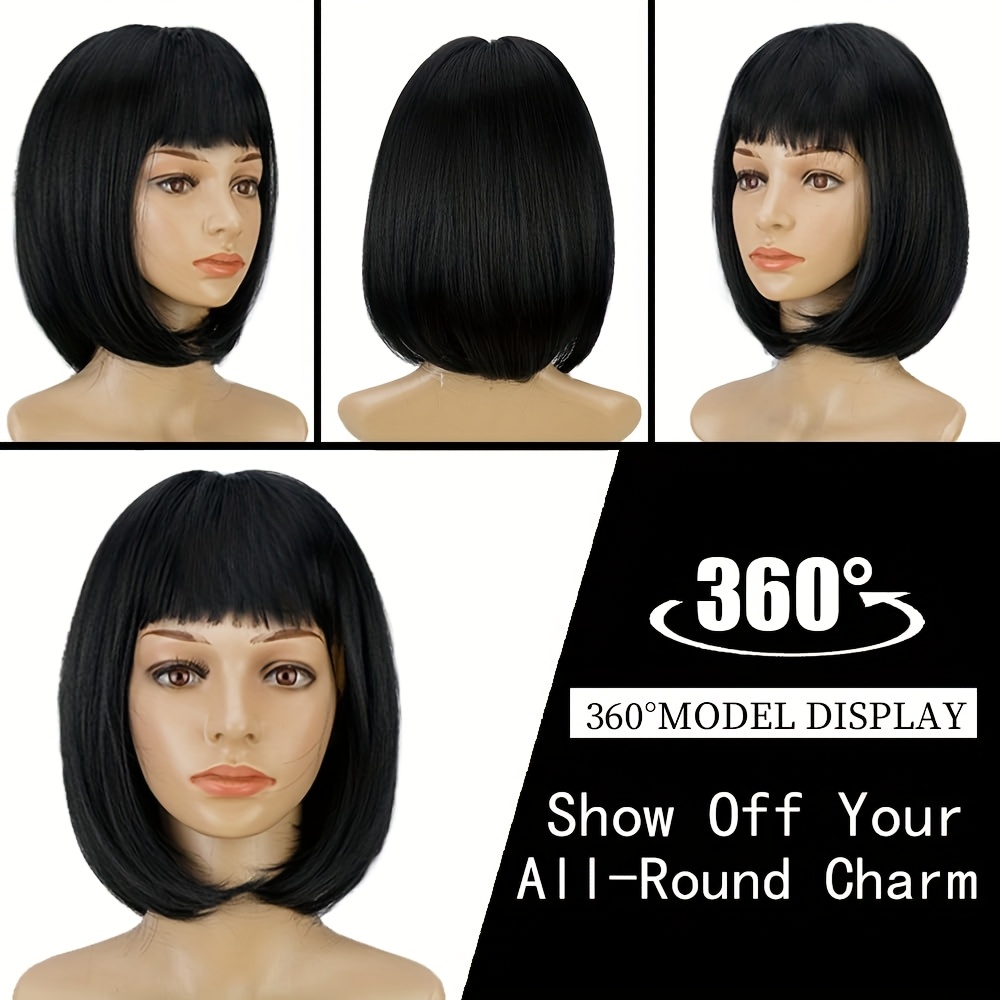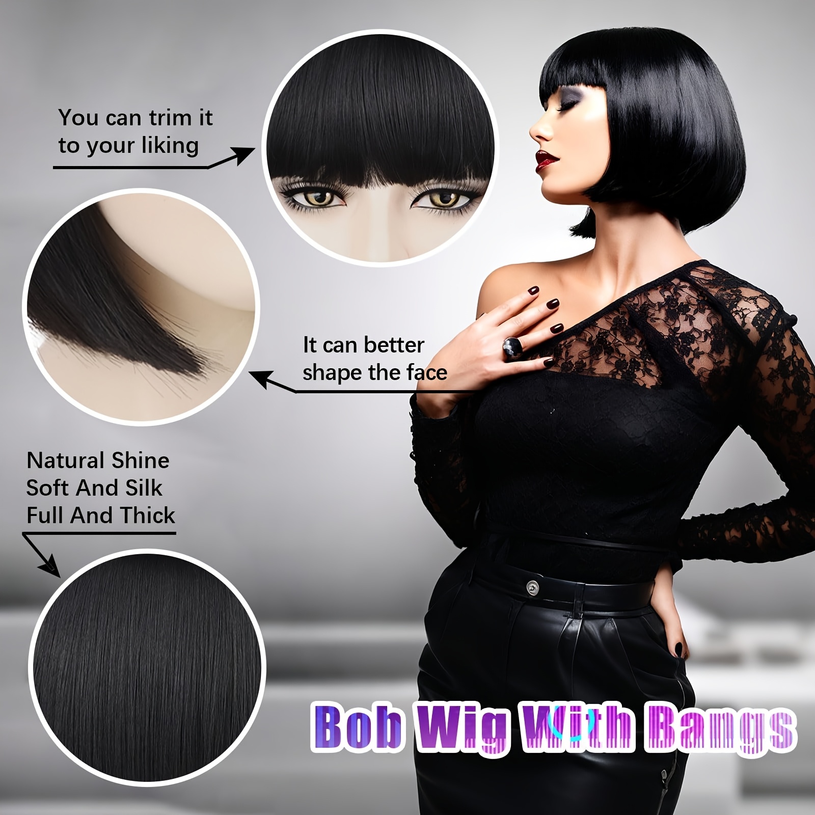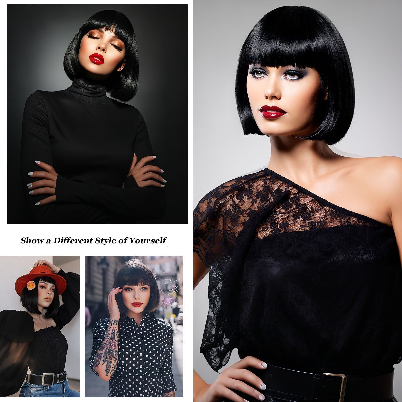 12” Straight Heat Resistant Short Bob Hair Wigs with Flat Bangs, Black Flapper Short Straight Hair Wig, 1920s Flapper Women Costume, for Women Cosplay Daily Party