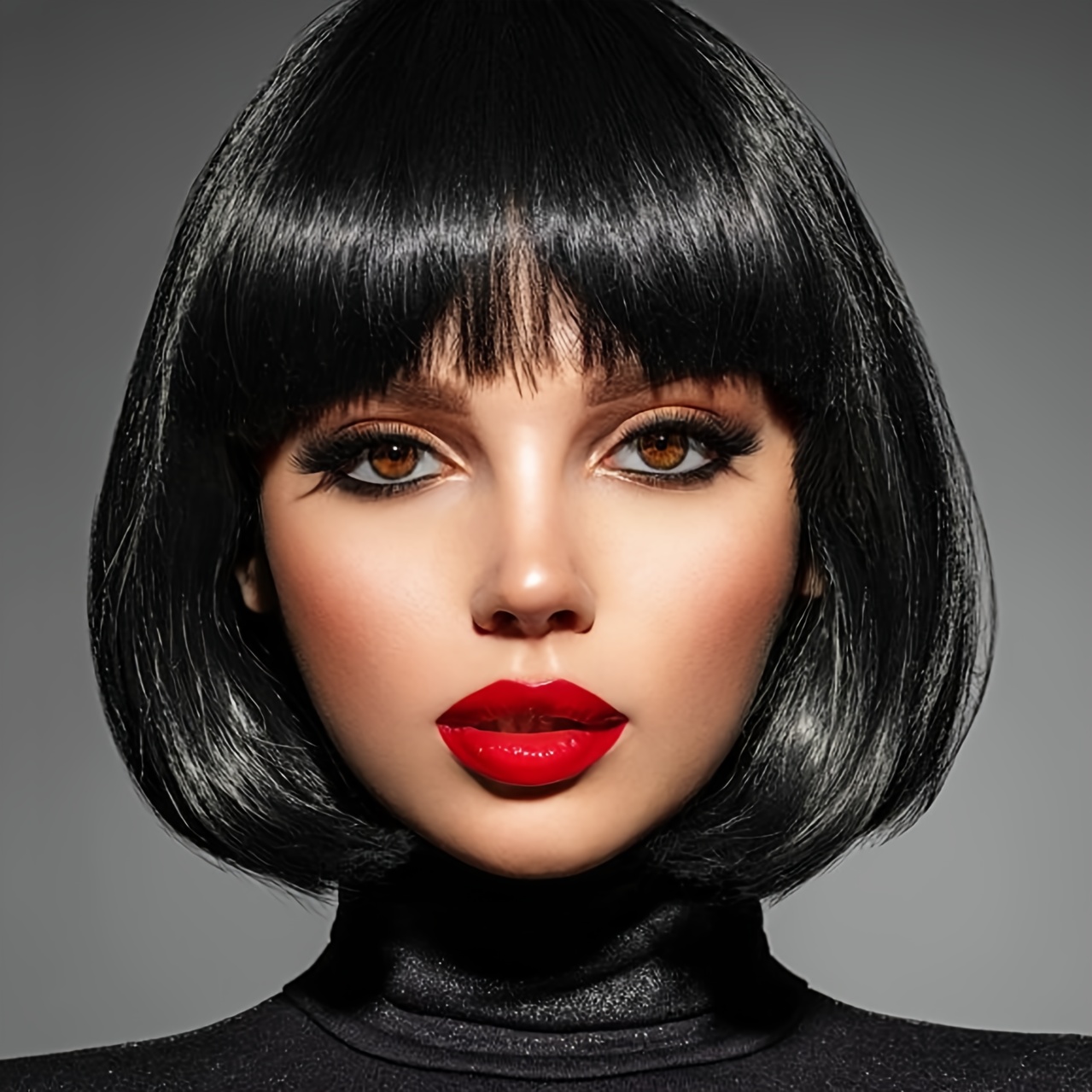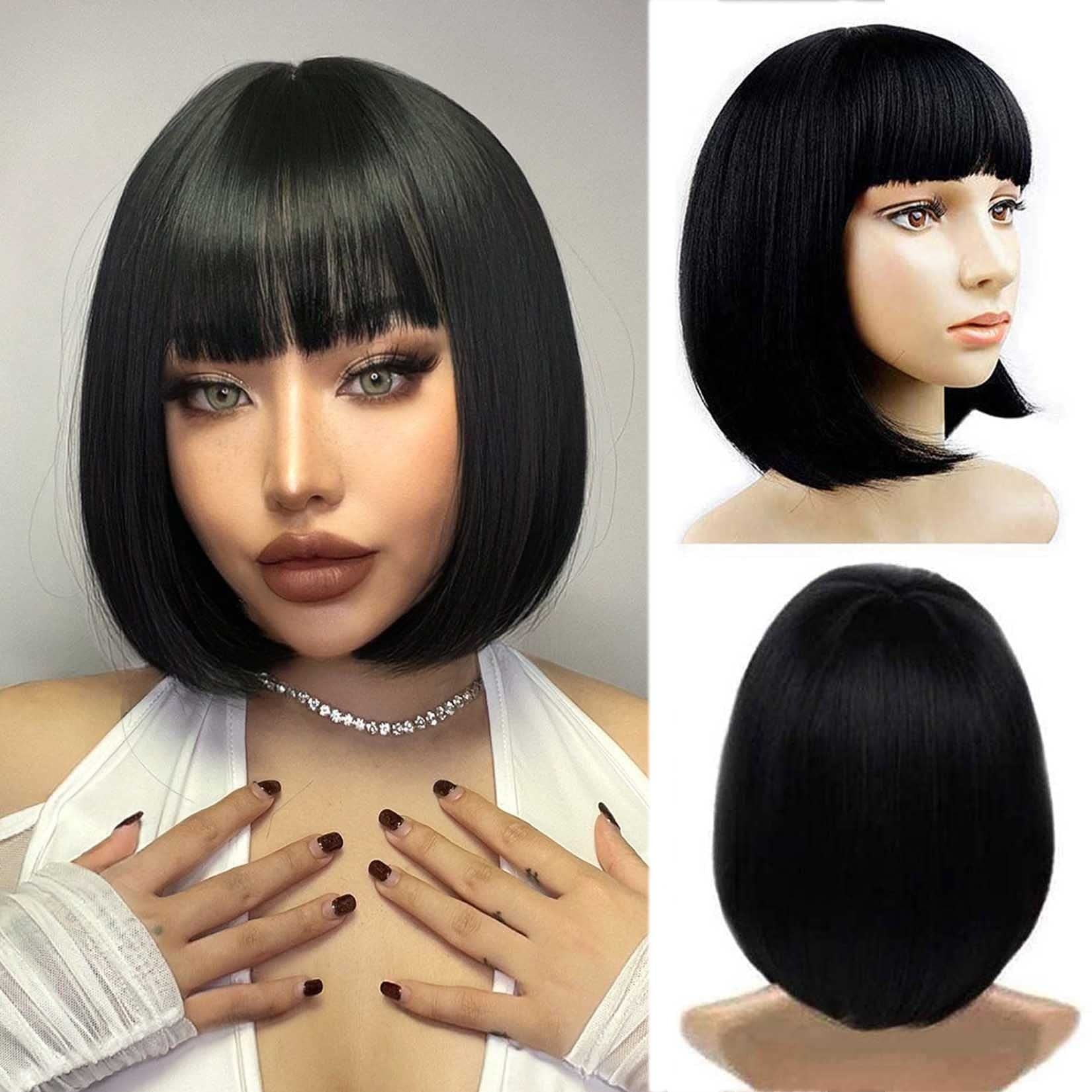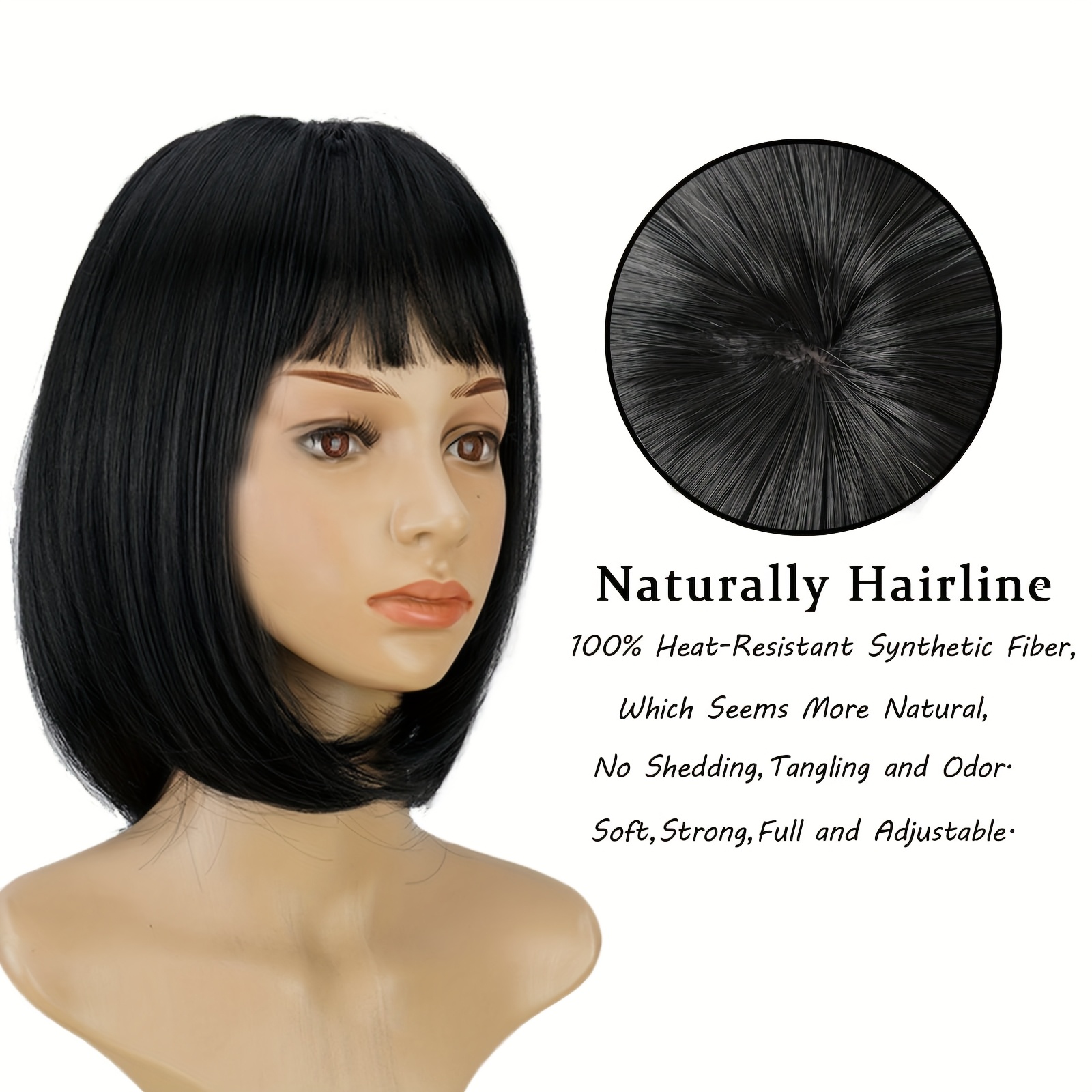 12” Straight Heat Resistant Short Bob Hair Wigs with Flat Bangs, Black Flapper Short Straight Hair Wig, 1920s Flapper Women Costume, for Women Cosplay Daily Party