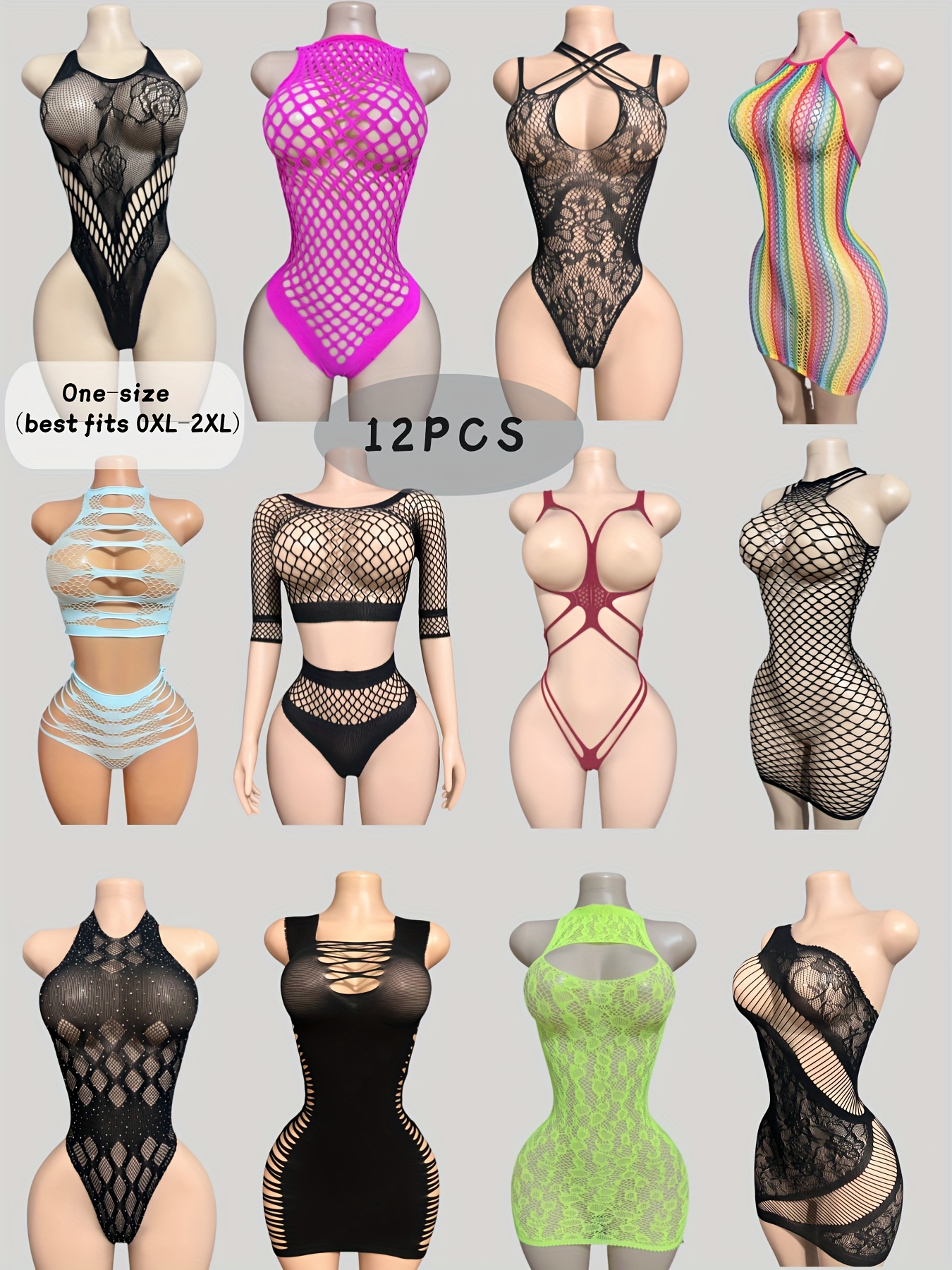 12pcs Set of Women’s Sexy Multi-Style Lace Mesh Bodystockings with Open Crotch, Slim Fit, Suitable for Dating, Holiday Gift