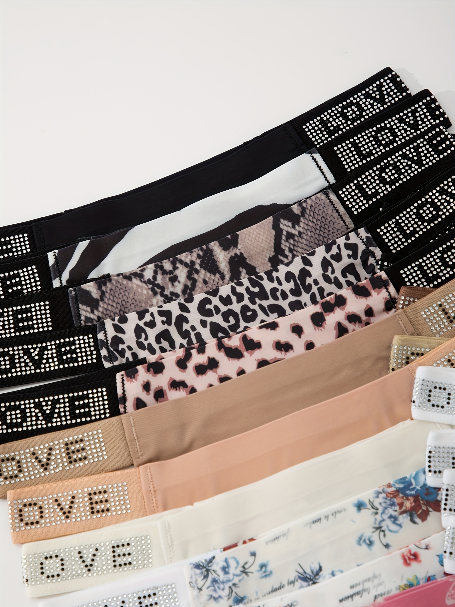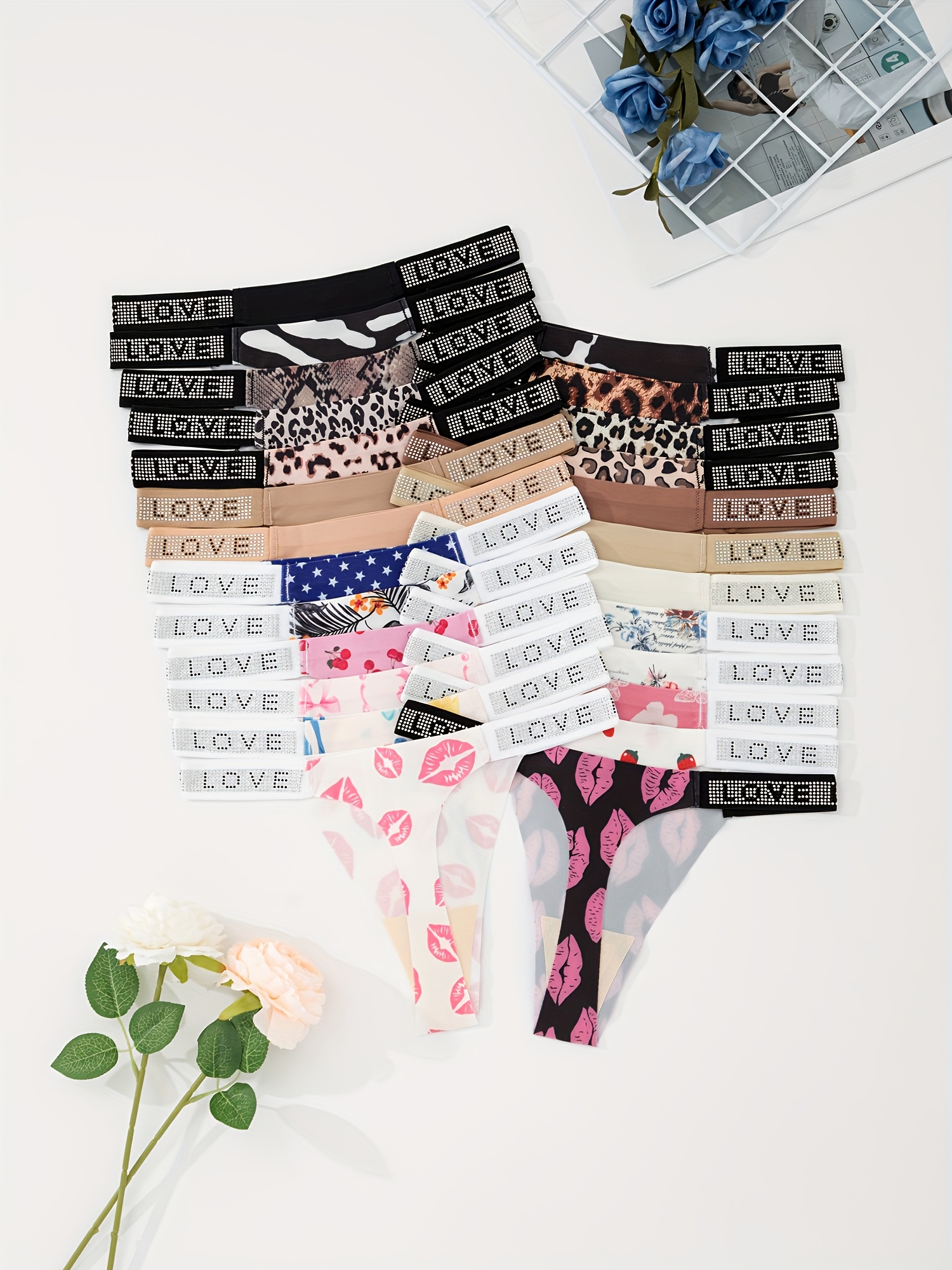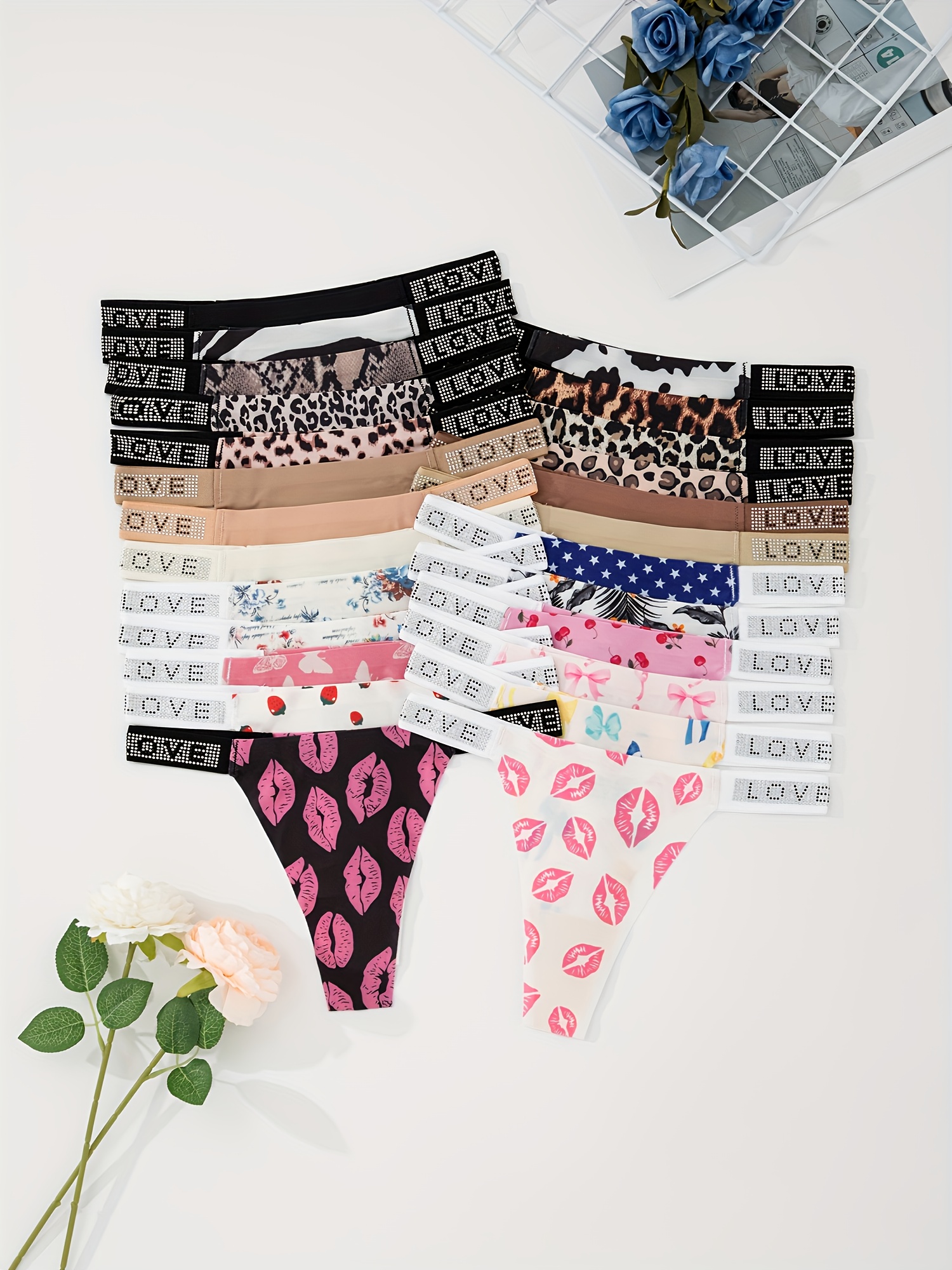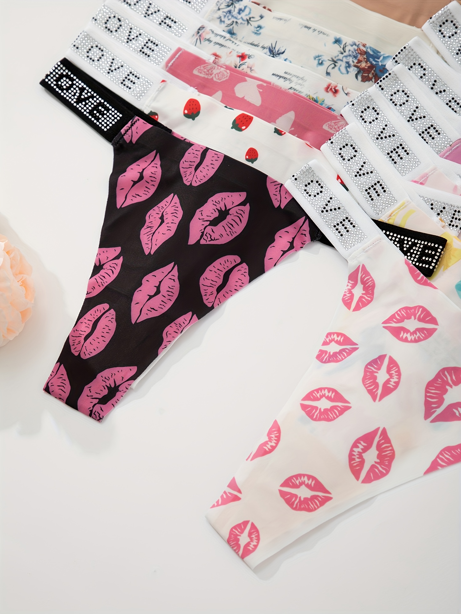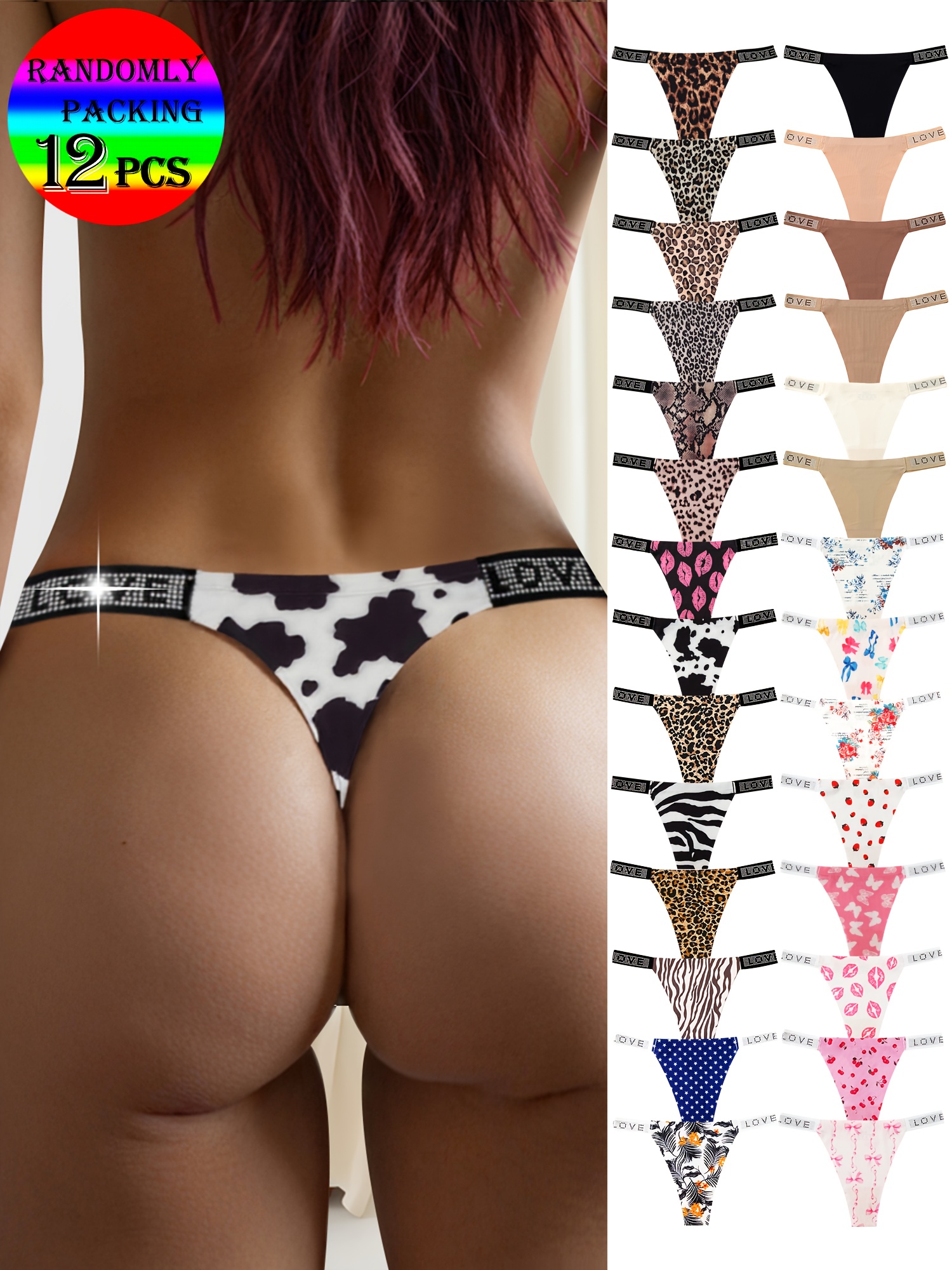 12pcs Women’s Low-Rise Thong Underwear – Sexy -String Panties with LOVE Glitter & Solid Color Styles, Soft Breathable Comfortable Non- Briefs, Random Print for Casual Attire (12pcs)