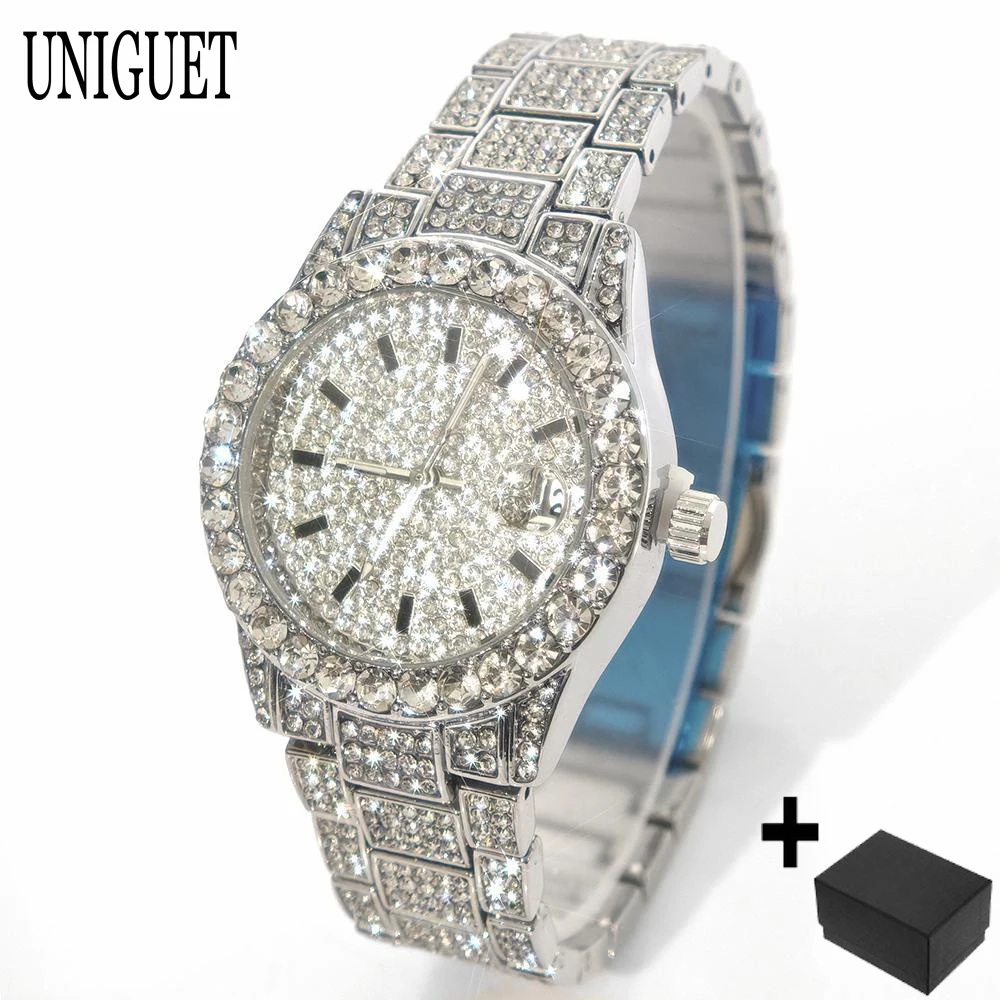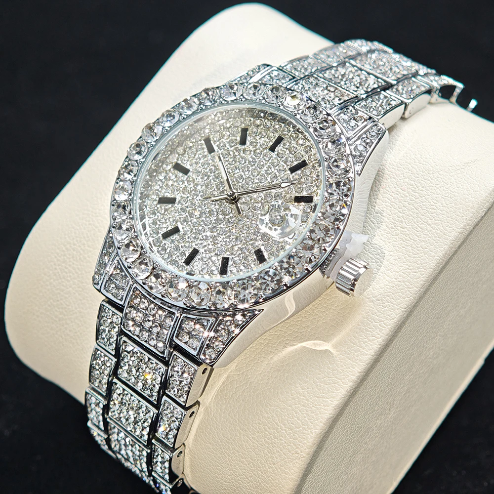 Iced-Out Aesthetic: The bezel and dial are encrusted with high-quality simulated diamonds for maximum brilliance.