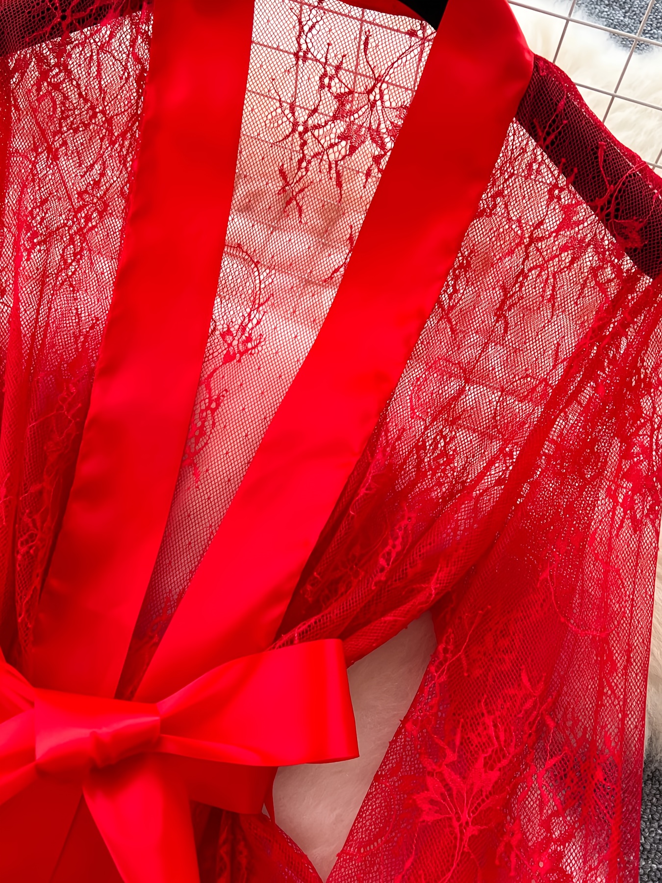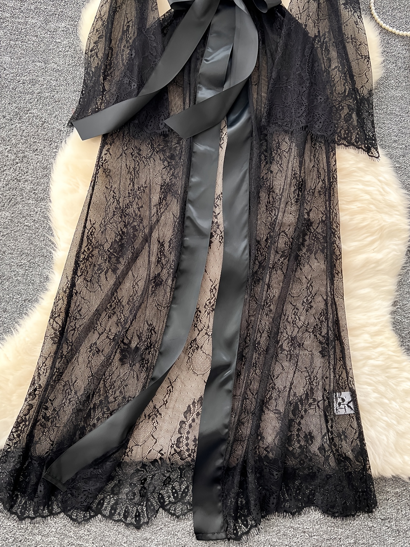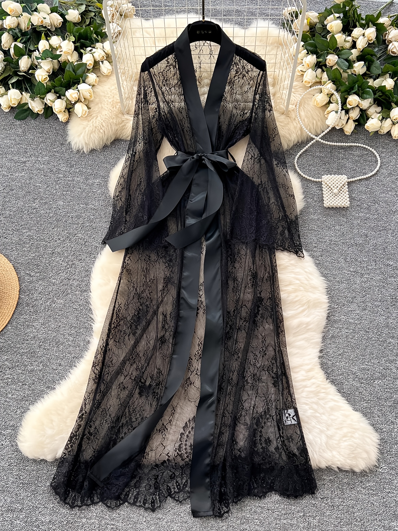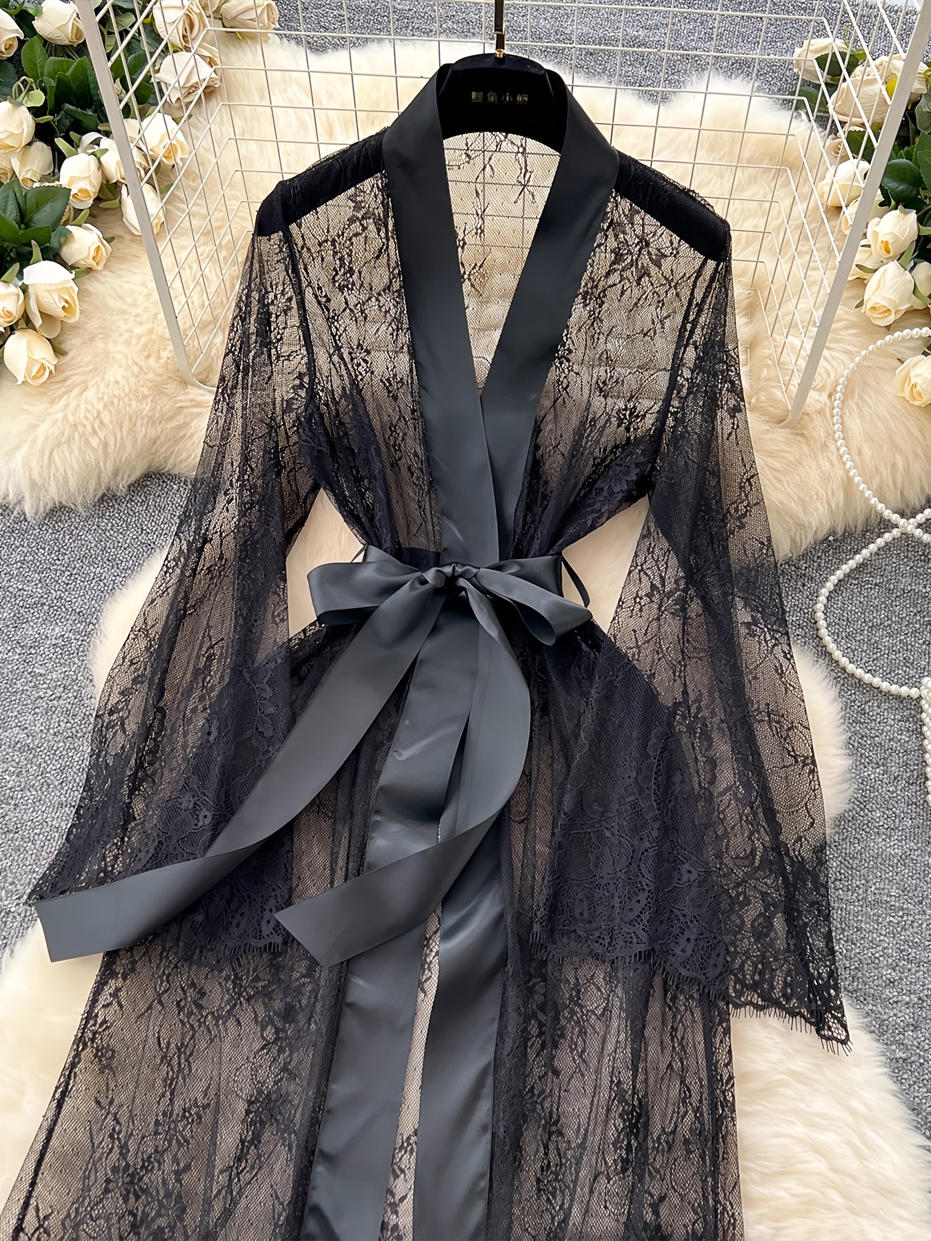 Two-Piece Layering System: Includes a floor-length, long-sleeved transparent kimono and a matching lace-trim belt to cinch the waist for a custom silhouette.