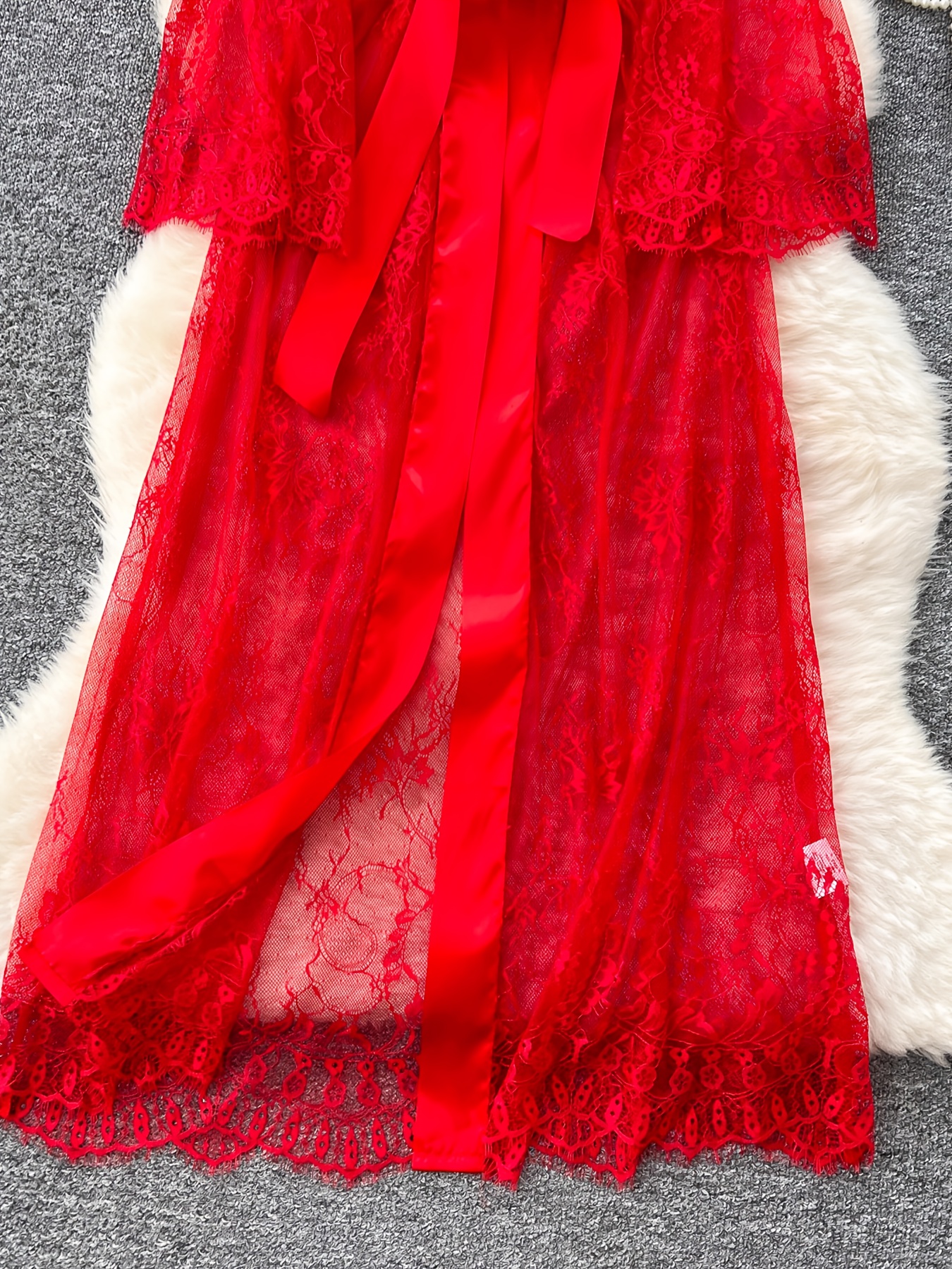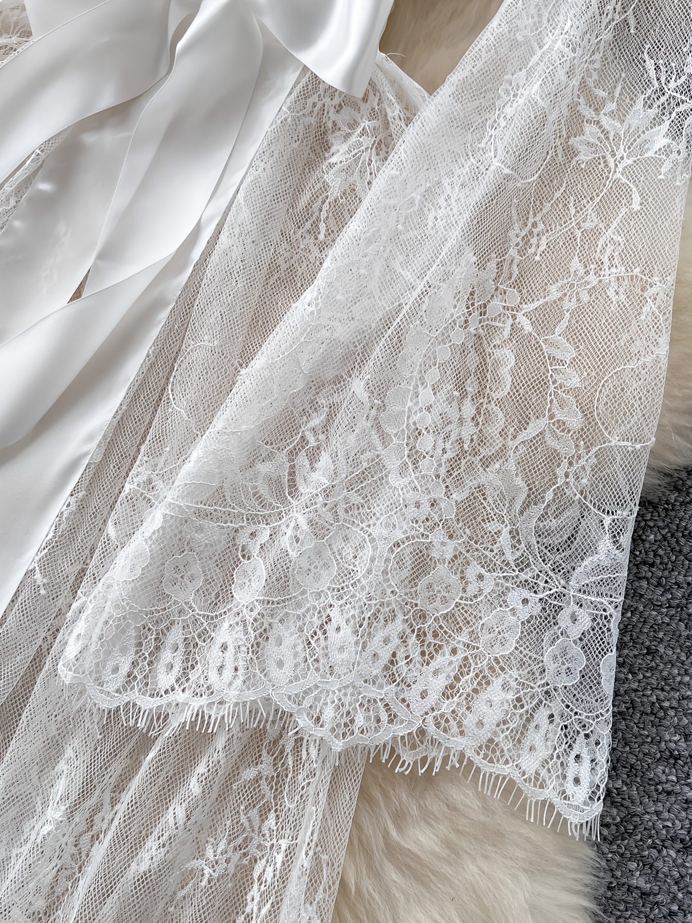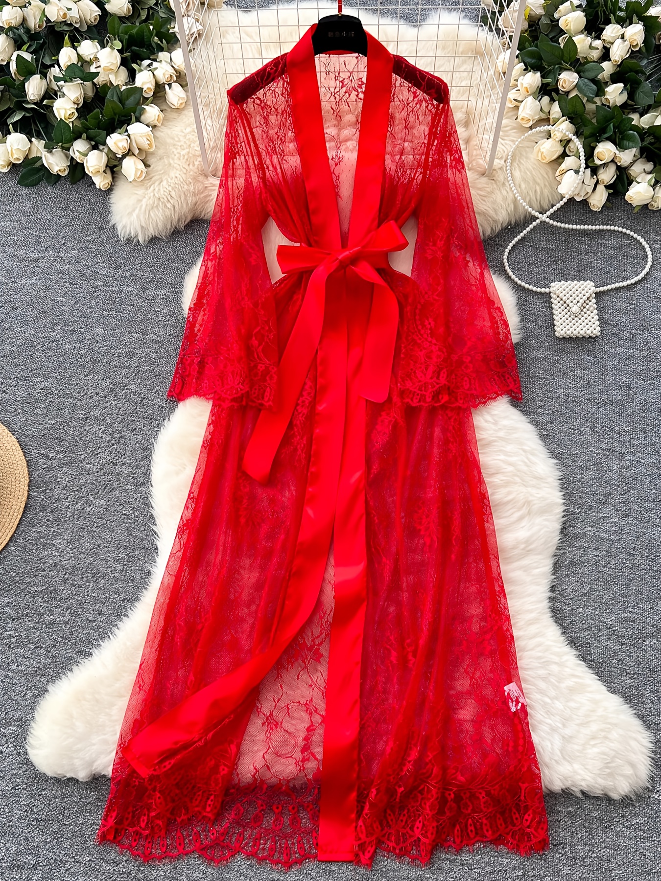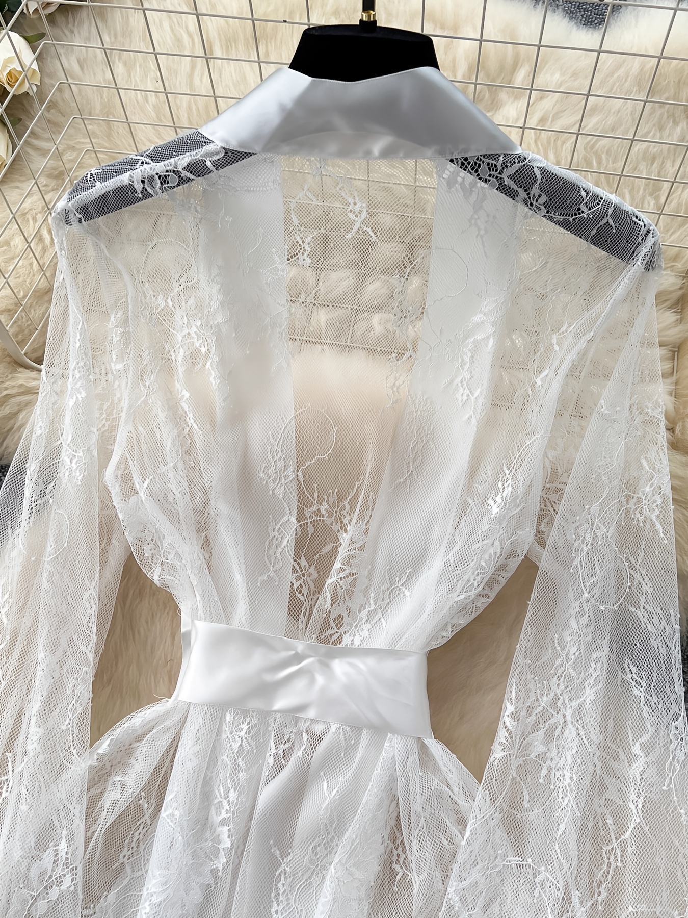 Two-Piece Layering System: Includes a floor-length, long-sleeved transparent kimono and a matching lace-trim belt to cinch the waist for a custom silhouette.