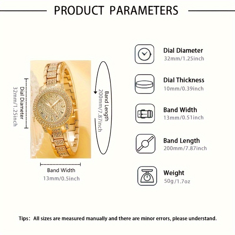2pcs Women’S Sparkling Quartz Watch Set with Hip Hop Bracelet – Golden-Tone Alloy Case, & Sparkling Bezel, Non-Rechargeable Battery