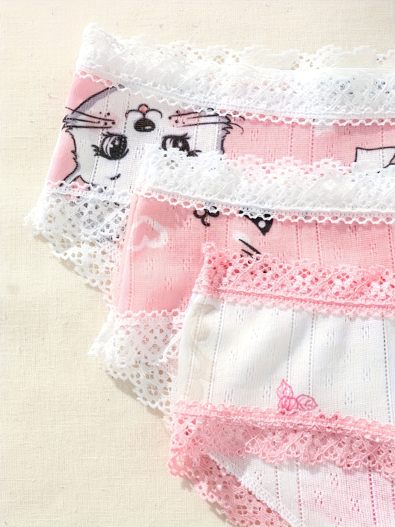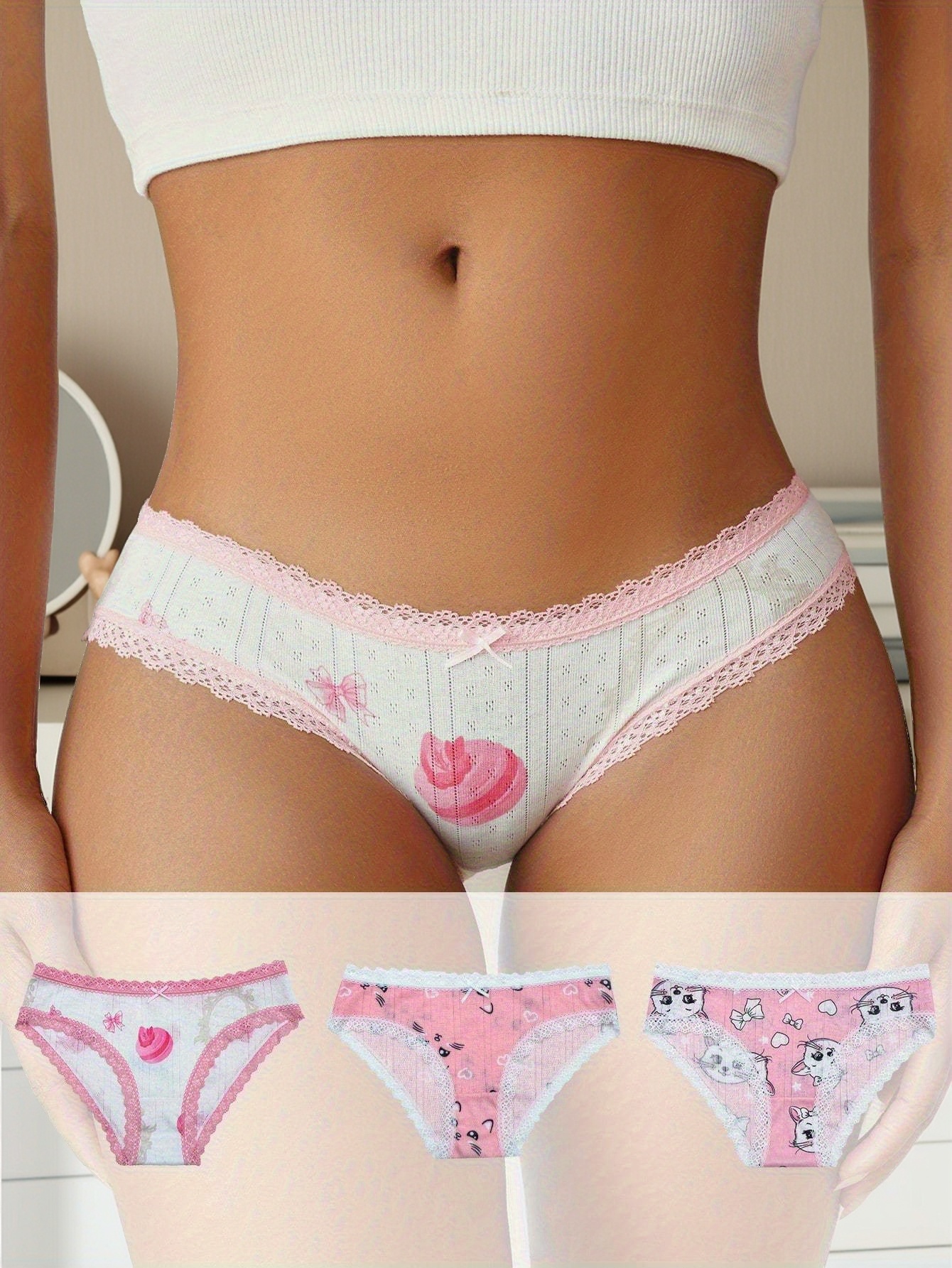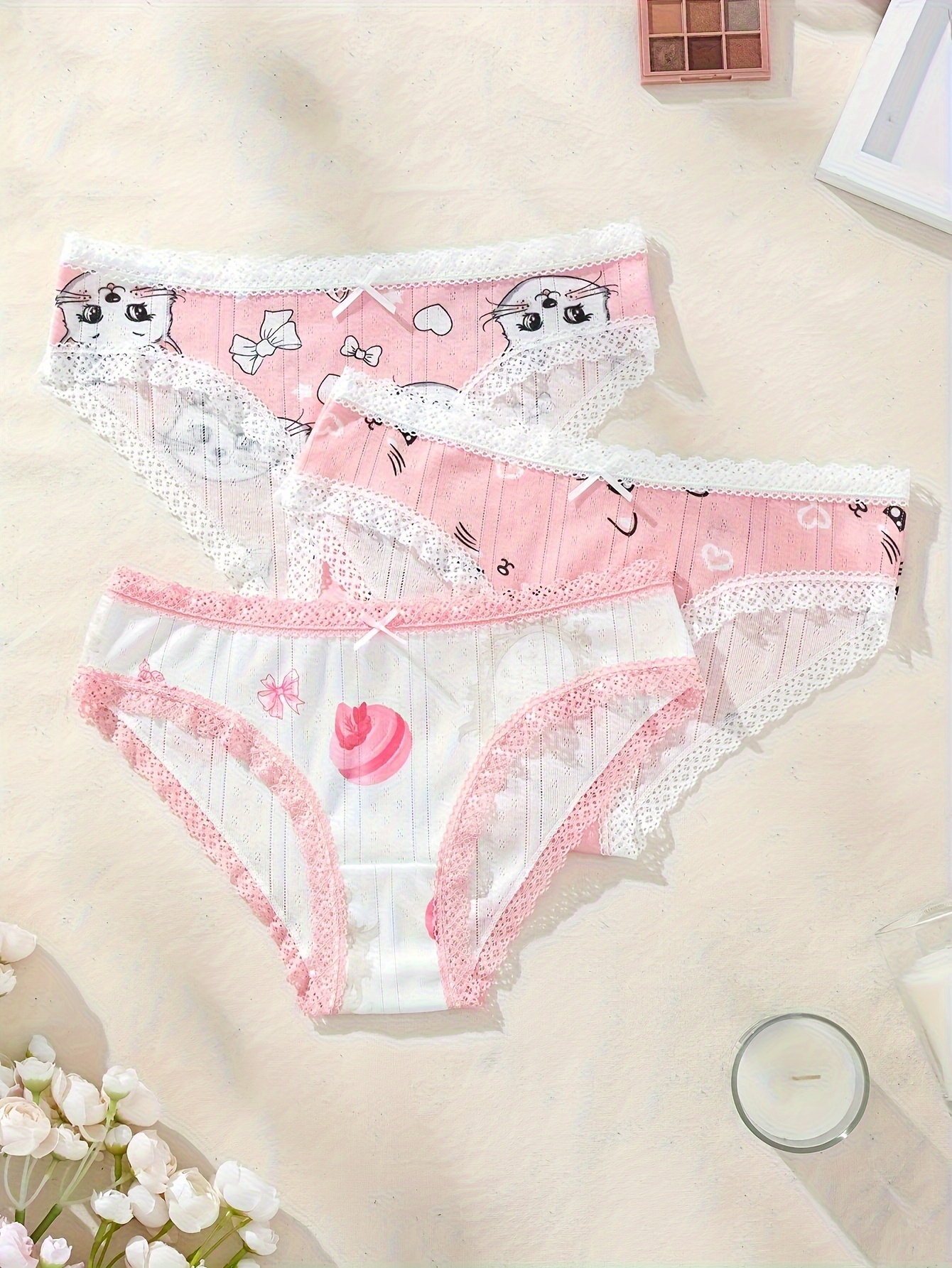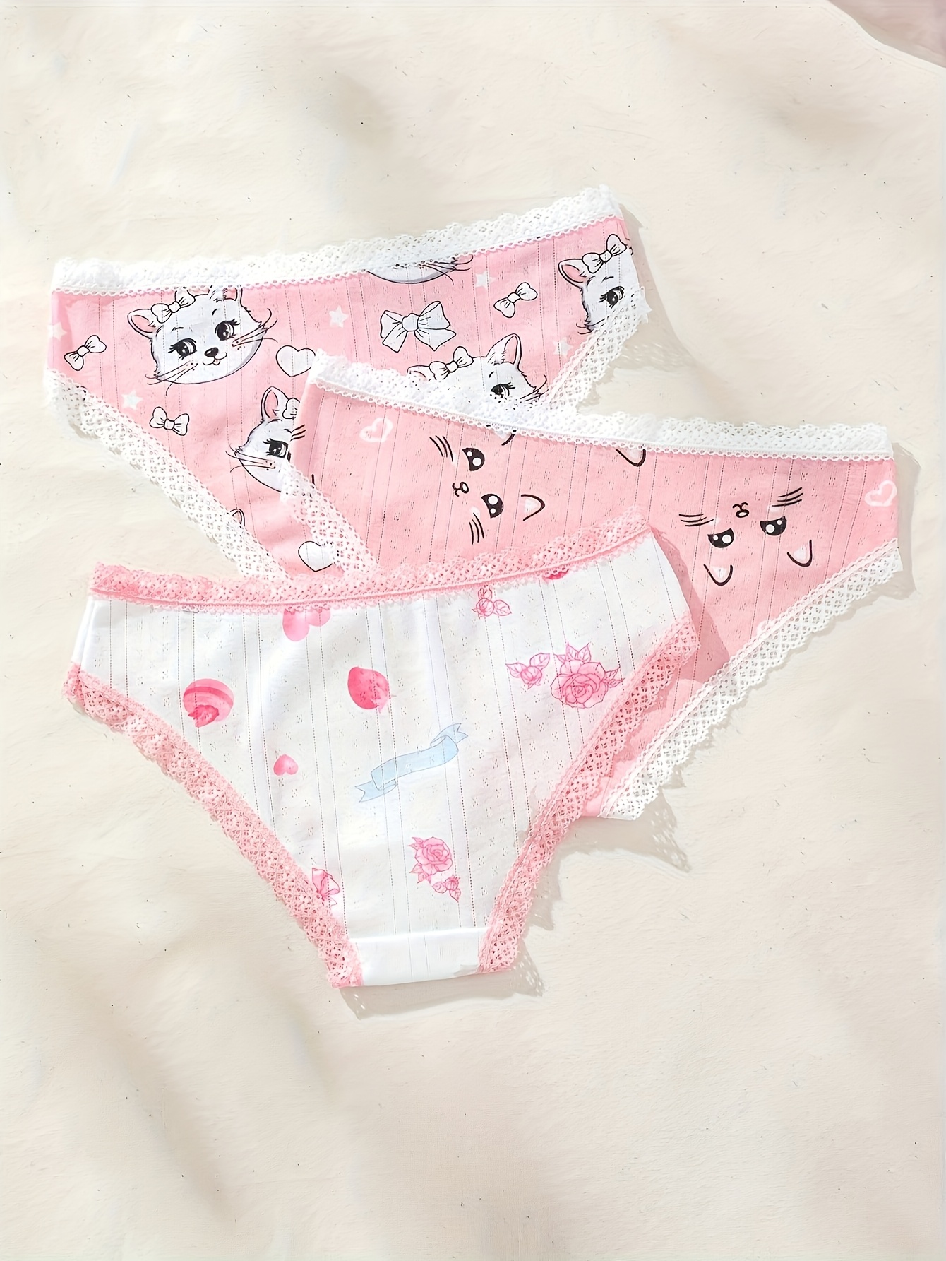 3-Pack Women’S Low-Rise Underwear – Cute Cartoon Cat & Bow Accent Lace Trim, Soft Breathable Everyday & Special Occasion Panties, Pink & Color Options, Playful Lingerie Design