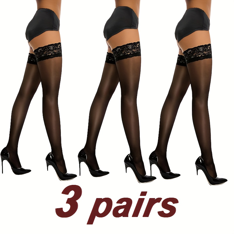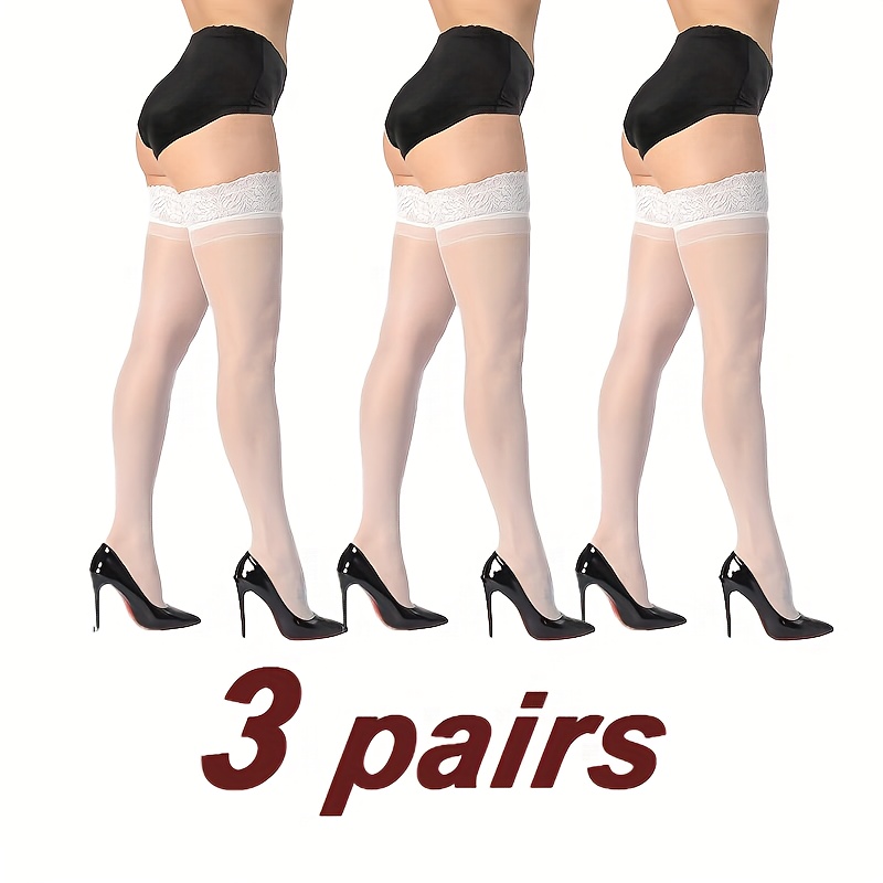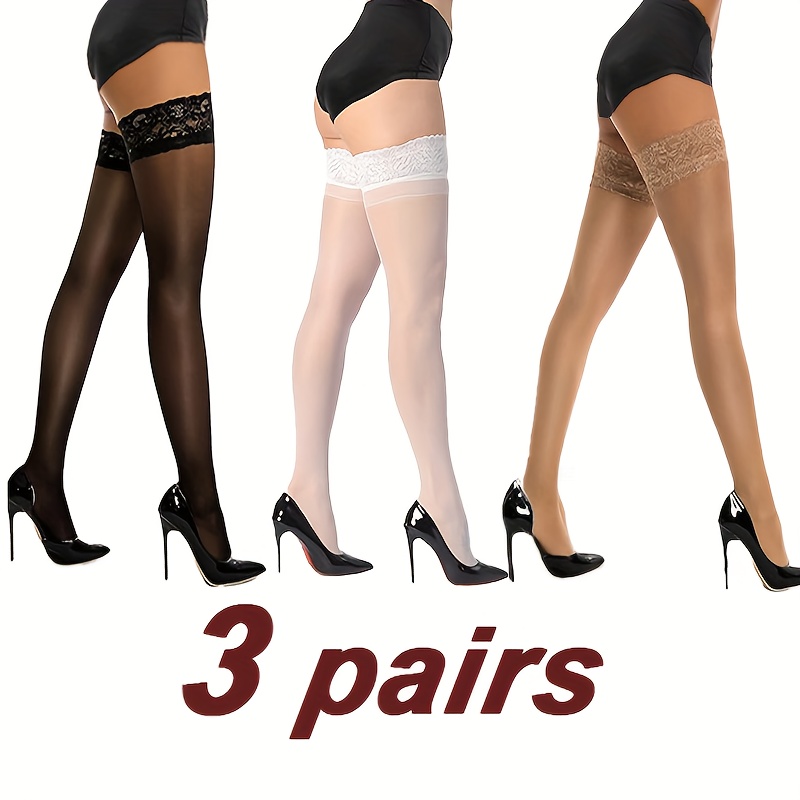 3 Pairs Womens Elegant Over Knee Socks Floral Lace Design Sheer Comfortable Classic Trio Black White Nude Hand Wash Recommended Versatile Casual Outfits Year Round Wear Soft Stretchy Light Support
