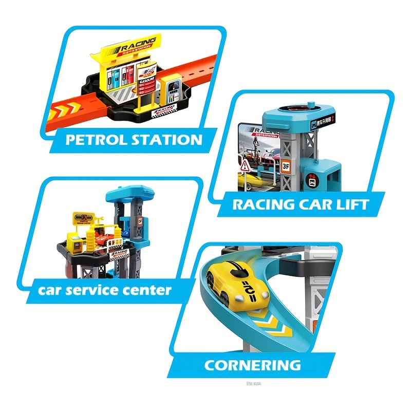 3D Three-Dimensional Racing Car Multi-Layer Track Toy Set Includes 2 Small Cars with Drifting Tracks And a Gas Station Car Barrier Service Center Assembly Model. It’S an Educational Construction Toy That Helps Develop Hands-On Thinking And Coordinat