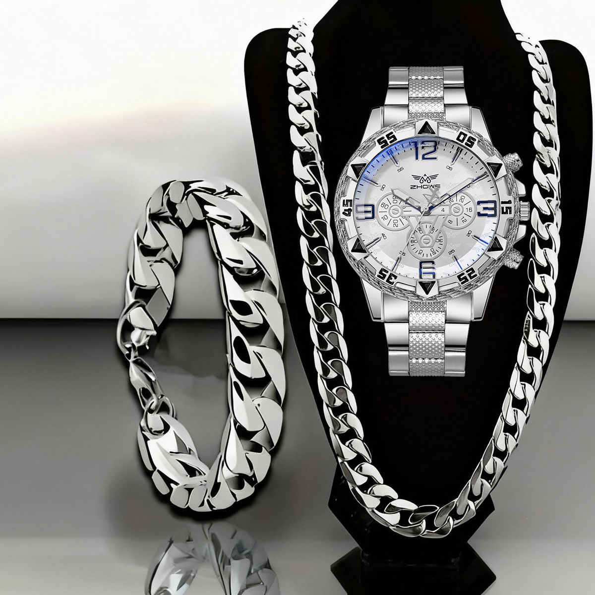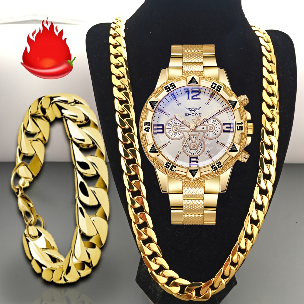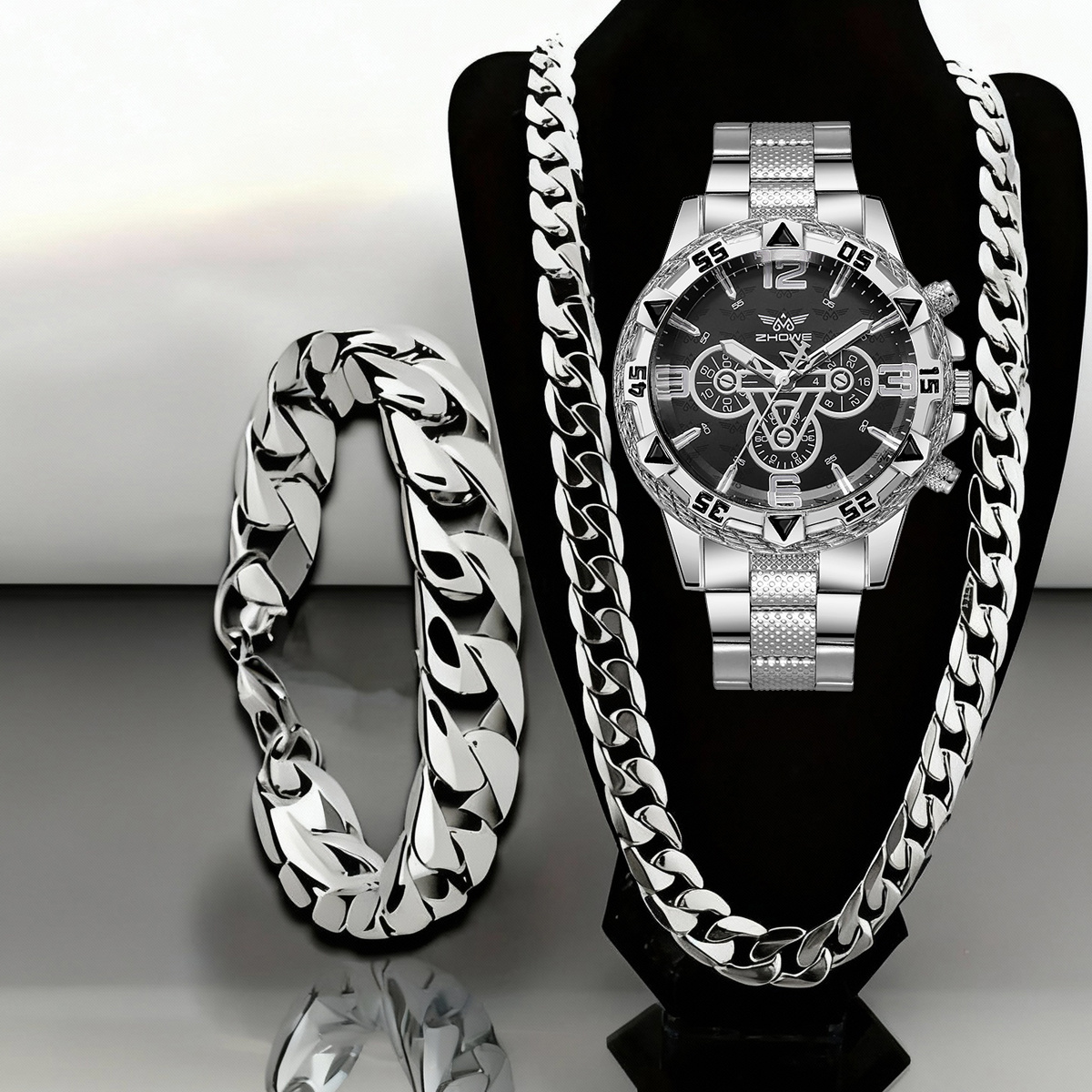 3pcs Luxury Men’s Quartz Watch & Bracelet Set with Necklace – Stainless Steel Strap, Large Dial Analog Business Watches, Round Alloy Case – Durable Watch Gift Suitable for Christmas, Thanksgiving, Day of the Dead – Elegant Men’s