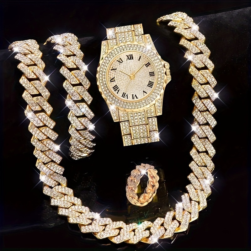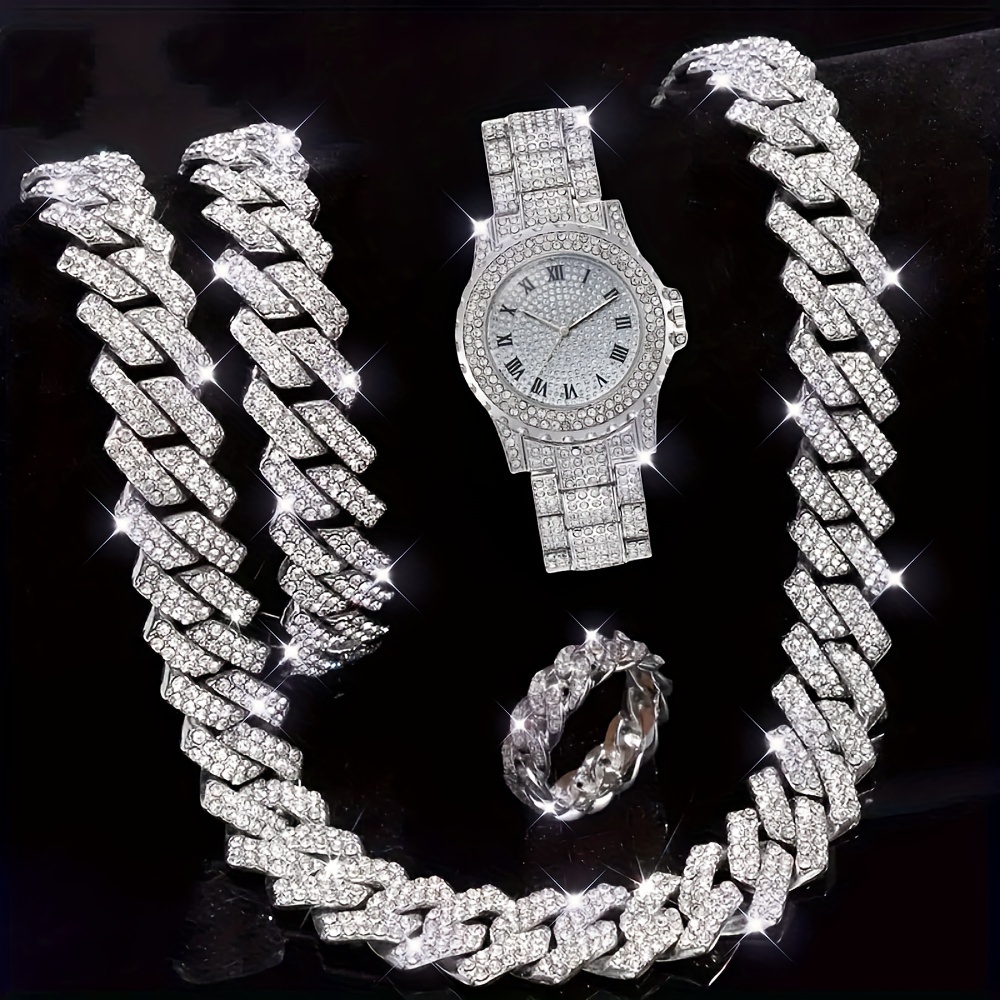 4pcs, Men’s Rhinestone Bracelet Set, Ring Set, Men’s Watch Gift Set