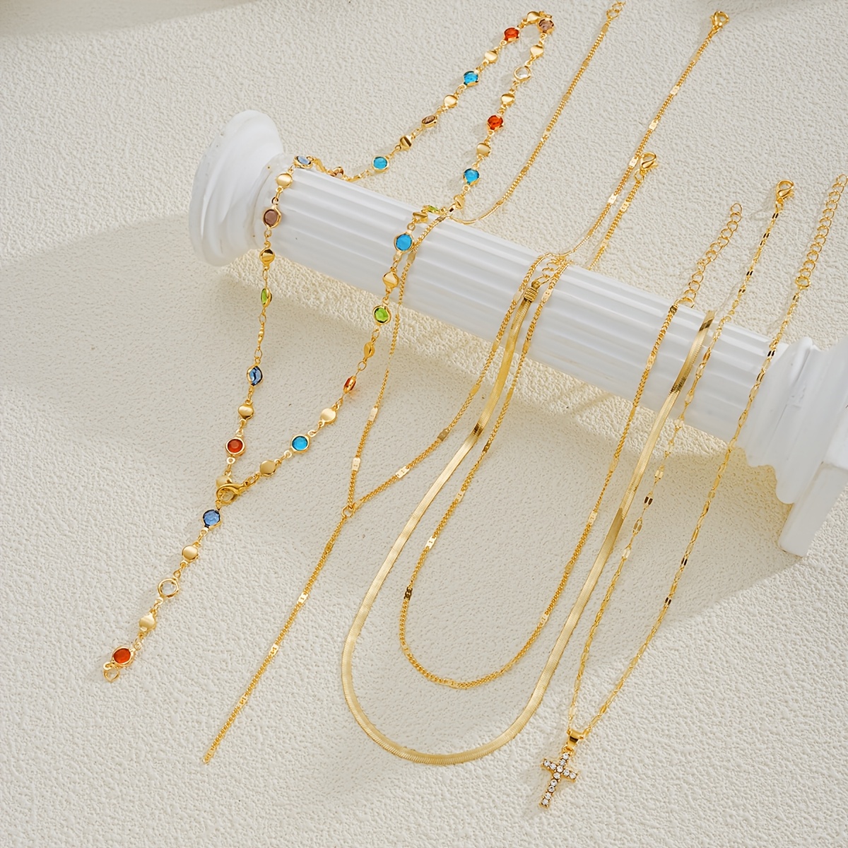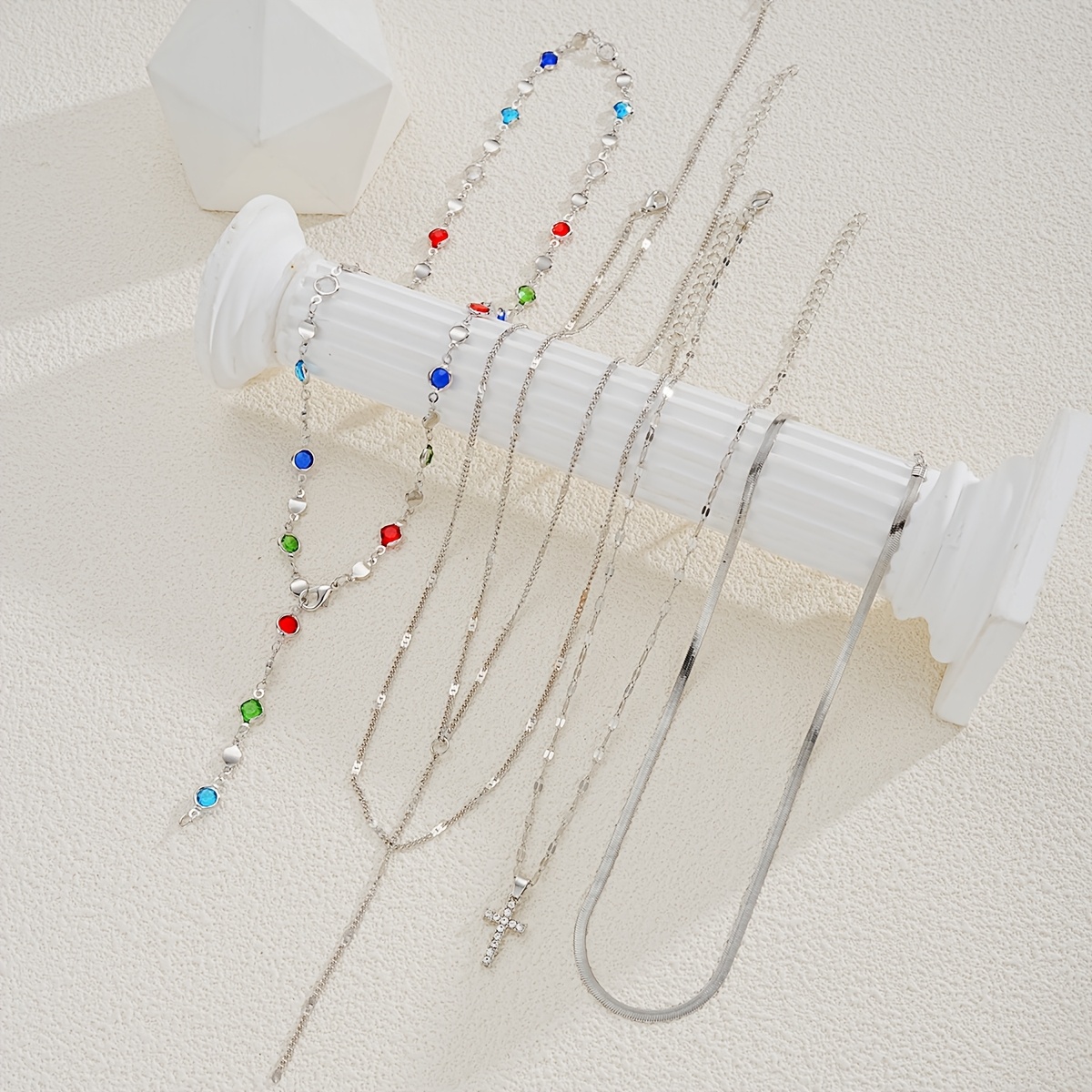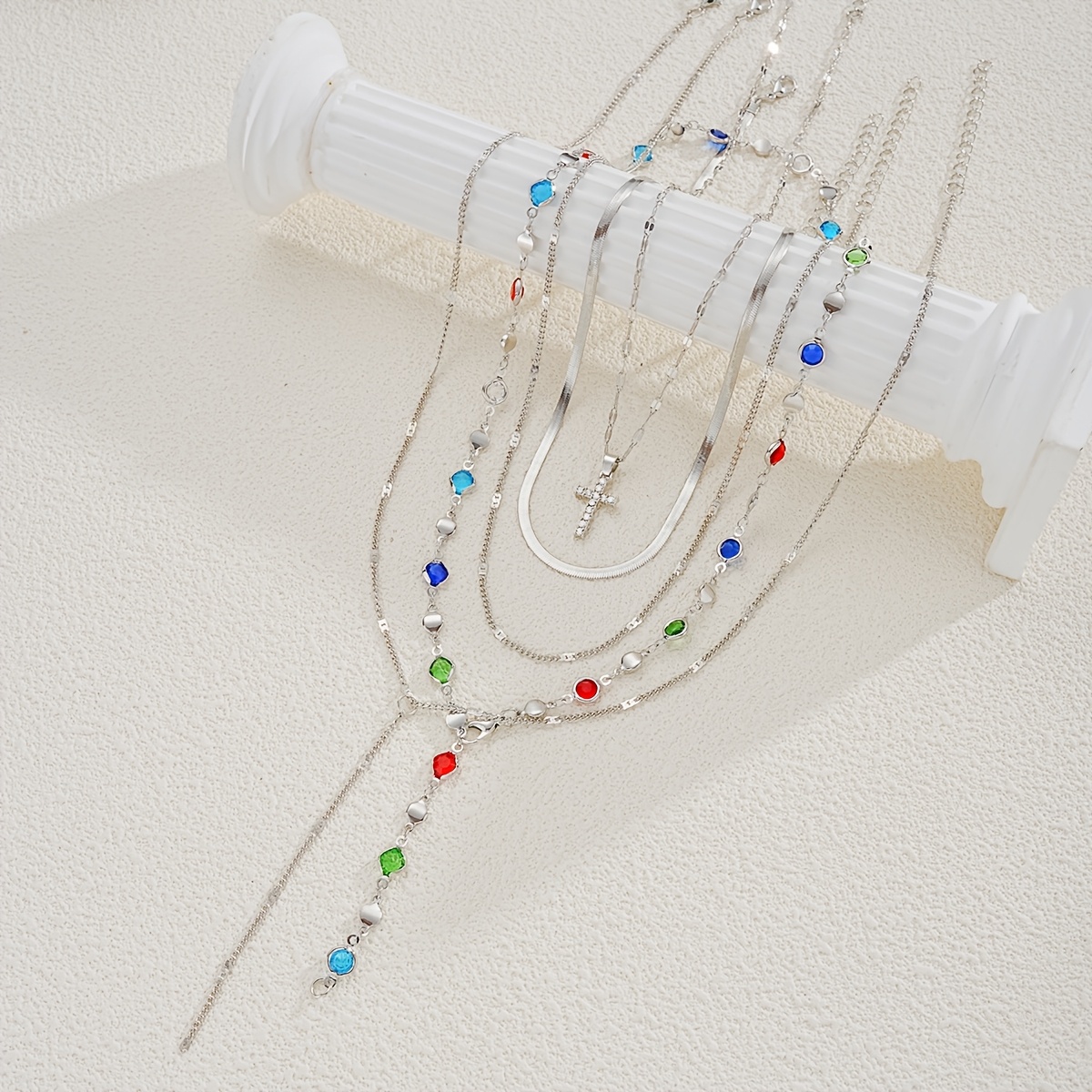 5pcs Set of Simple, Fashionable, Trendy, Elegant, Colorful Rhinestone Cross Snake Chain Y-Shaped Long Necklace Set for Women, Suitable for Vacation, Party, Date, Banquet, Travel, And Daily Wear, Necklace For Women High Quality, Necklace For Women Long, Long Necklace For Women, Long Necklace Chain, Vintage Metal Cross Necklace For Women, Cross Jewelry, Colored Bead Necklace, Blosh Necklace, Vintage Accessory For Women, Table Y-cross, Green Necklace, Y-shaped Necklace For Women