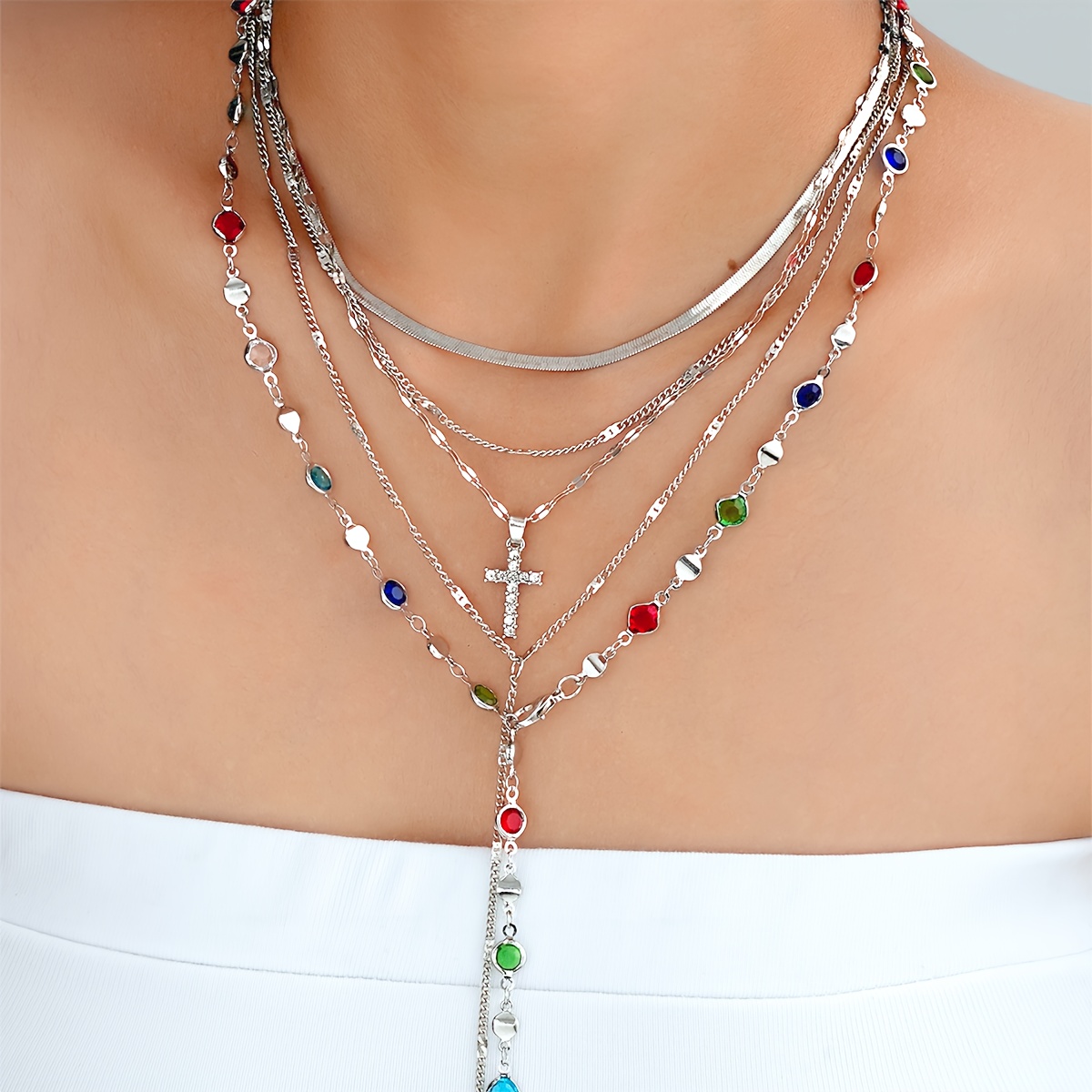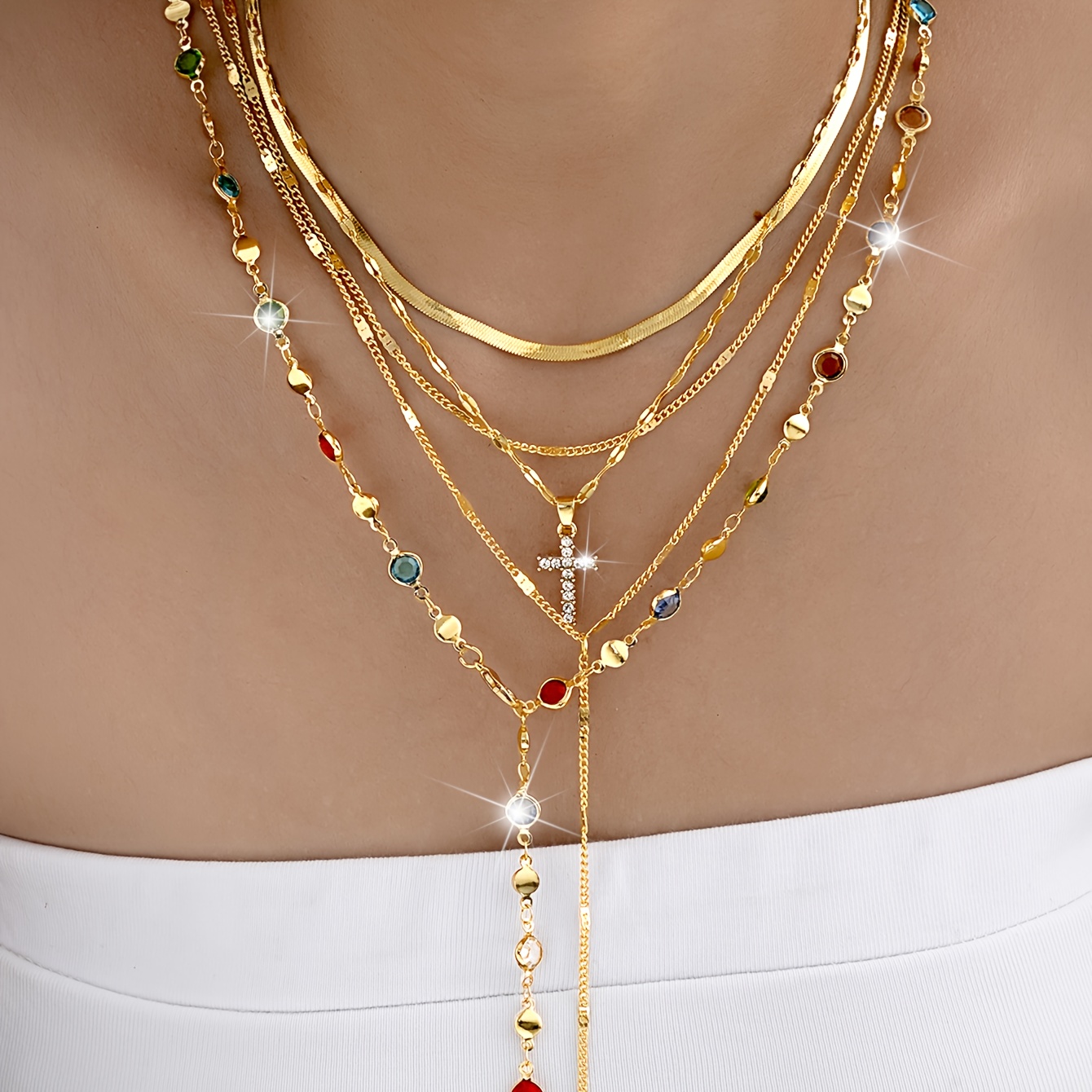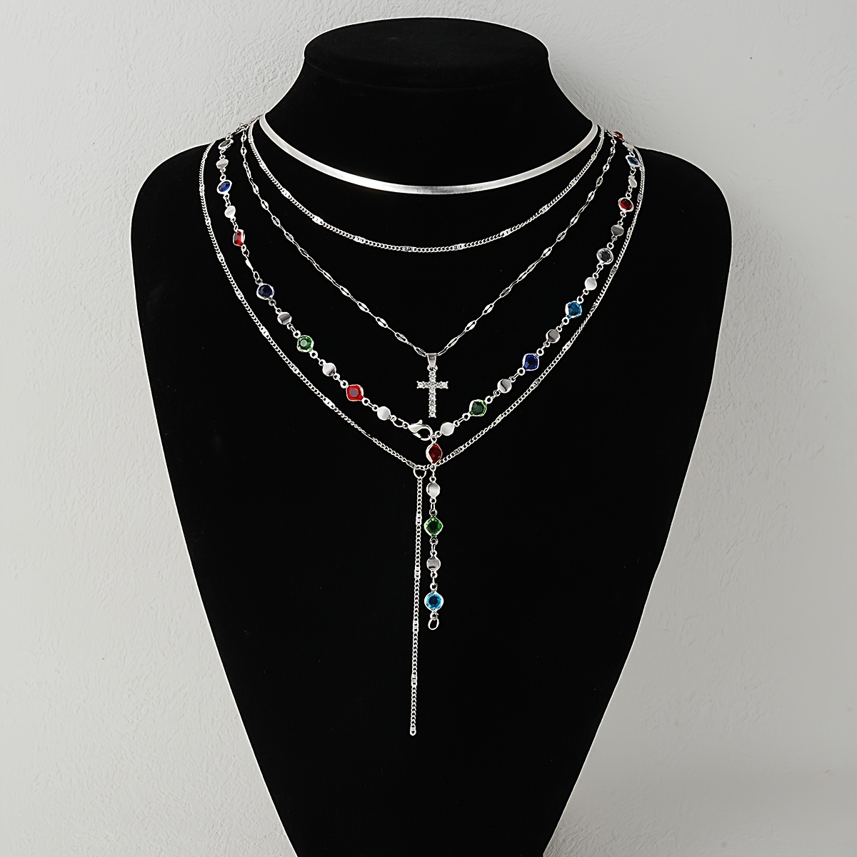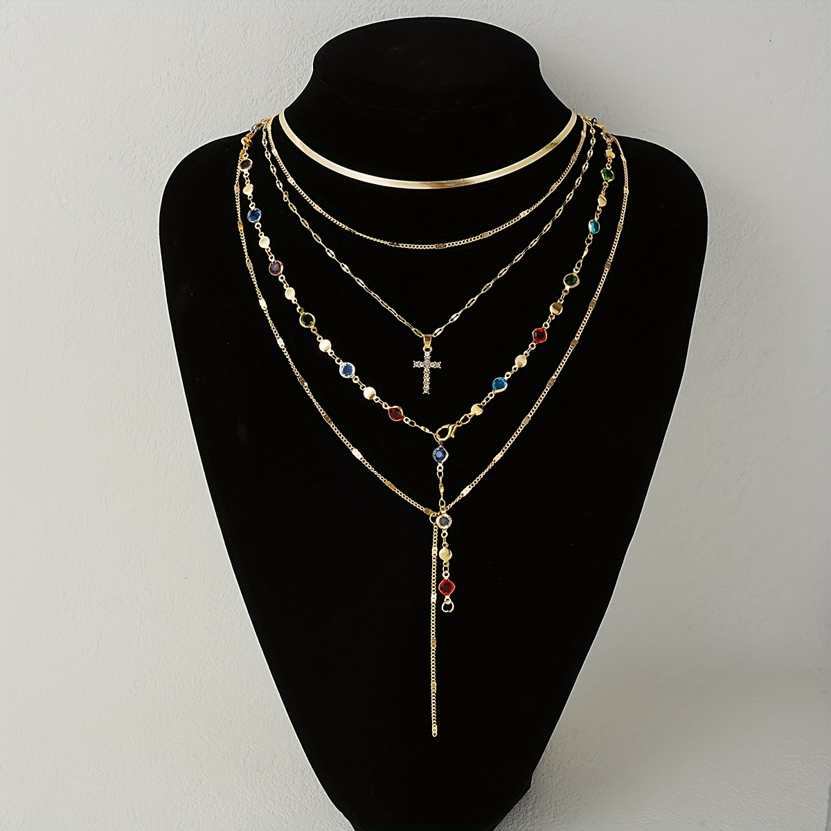 5pcs Set of Simple, Fashionable, Trendy, Elegant, Colorful Rhinestone Cross Snake Chain Y-Shaped Long Necklace Set for Women, Suitable for Vacation, Party, Date, Banquet, Travel, And Daily Wear, Necklace For Women High Quality, Necklace For Women Long, Long Necklace For Women, Long Necklace Chain, Vintage Metal Cross Necklace For Women, Cross Jewelry, Colored Bead Necklace, Blosh Necklace, Vintage Accessory For Women, Table Y-cross, Green Necklace, Y-shaped Necklace For Women