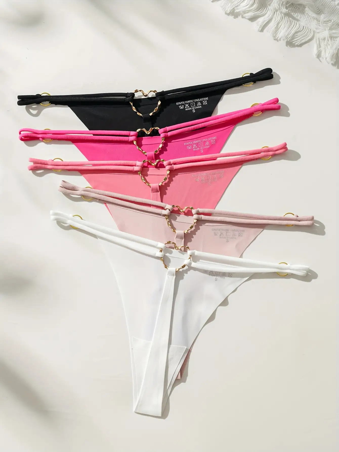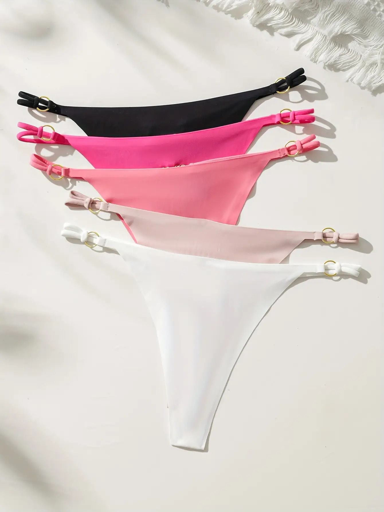 Tags: 2026 lingerie trends, 5-color-underwear-pack, 5-pack-women-intimates, 5pcs-v-string-thong-set, black-pink-white-thongs, chic-strappy-thongs, comfortable-v-string-set, cross-back-strap-lingerie, daily wear lingerie, feminine-v-cut-underwear, hand wash only lingerie, light-blue-navy-panties, low-rise-women-underwear, metal-buckle-thong, minimalist-v-string-panties, sexy-cross-strap-thongs, sexy-low-waist-underwear, special-occasion-underwear, trendy-metal-accent-lingerie, v-shaped-bikini-panties