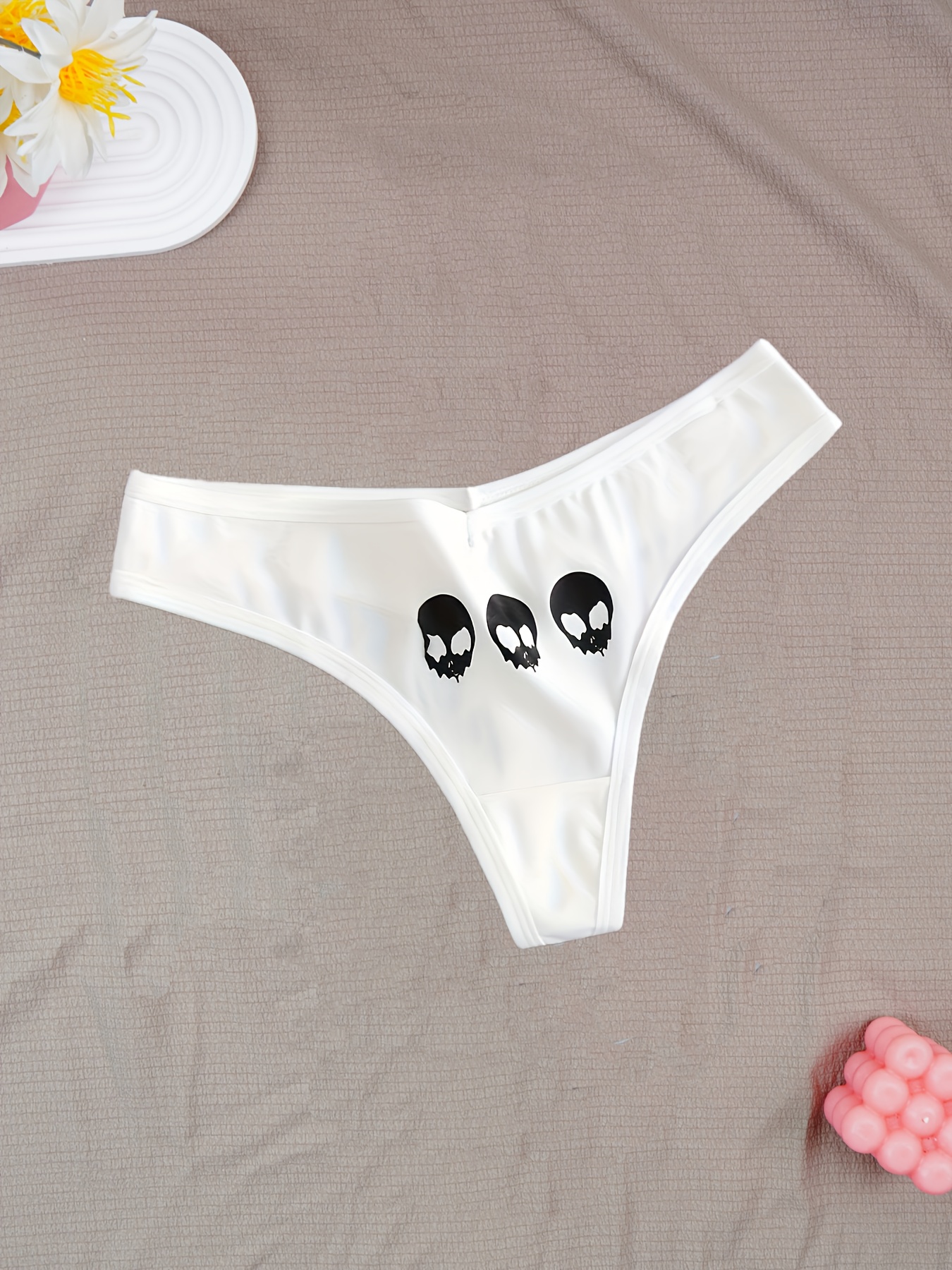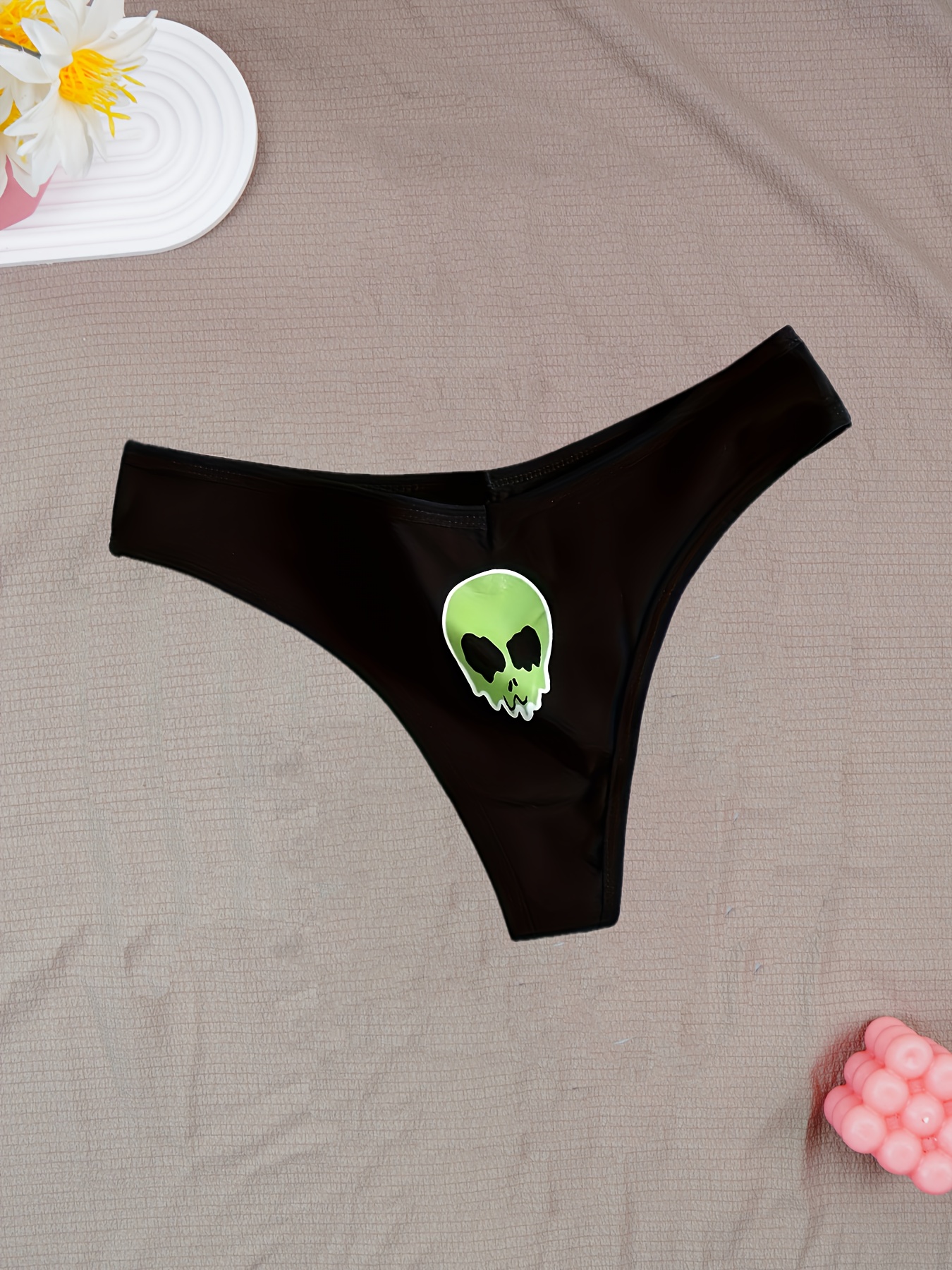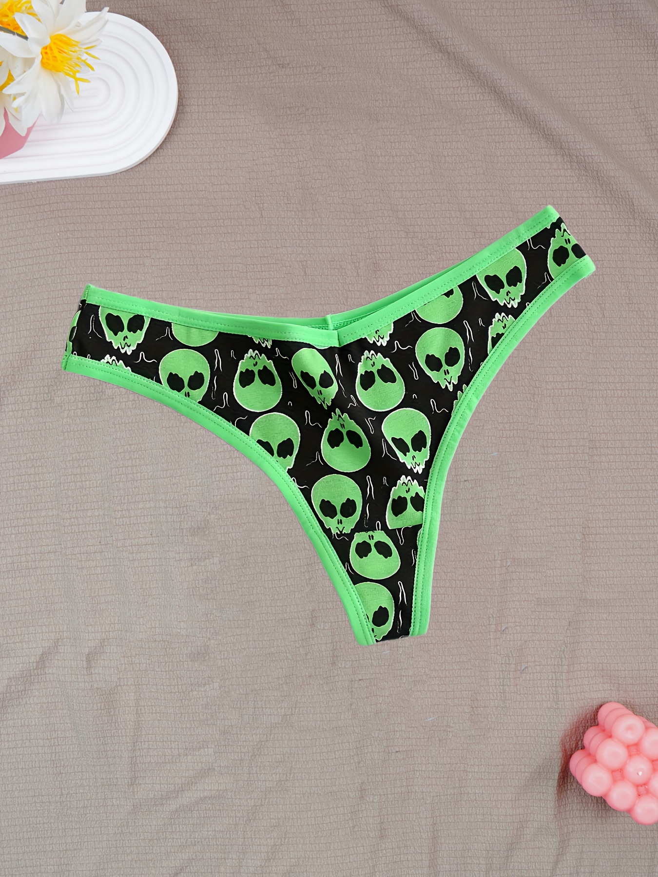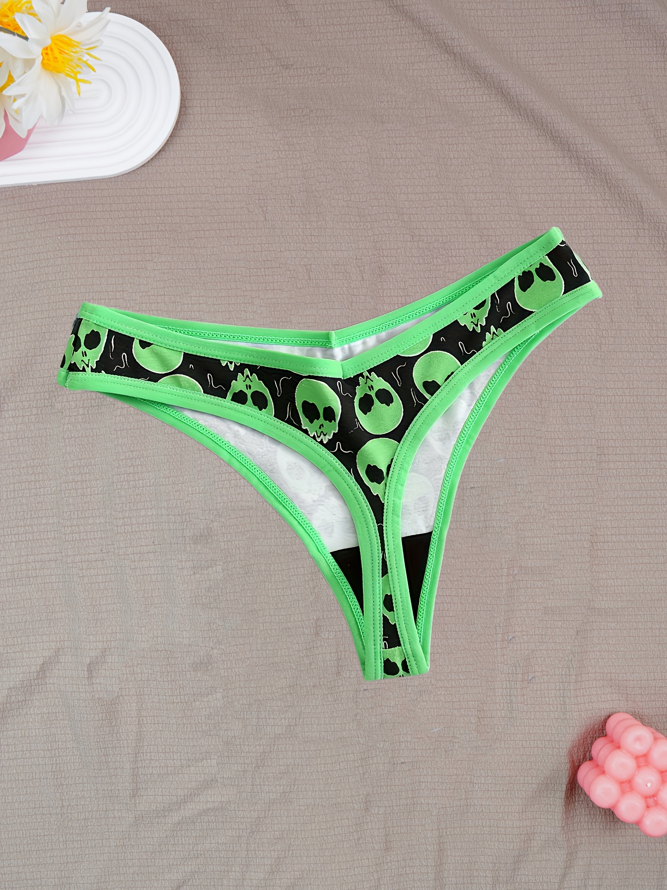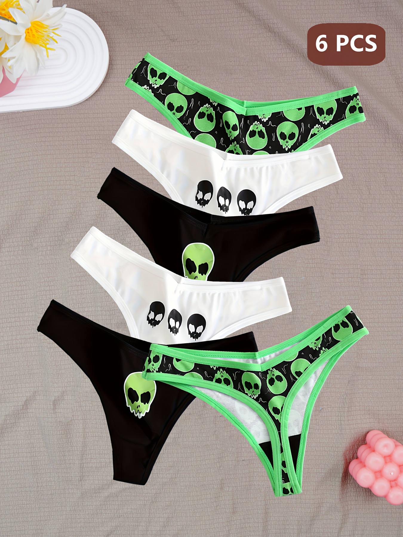6pcs Women’S Skull Print Thongs – Comfortable, Breathable, and Stylish for Halloween, Black, White, Green, and Black with Skull & Floral Design, Romantic Style, Halloween Accessories|Skull Print Thongs|Breathable Material