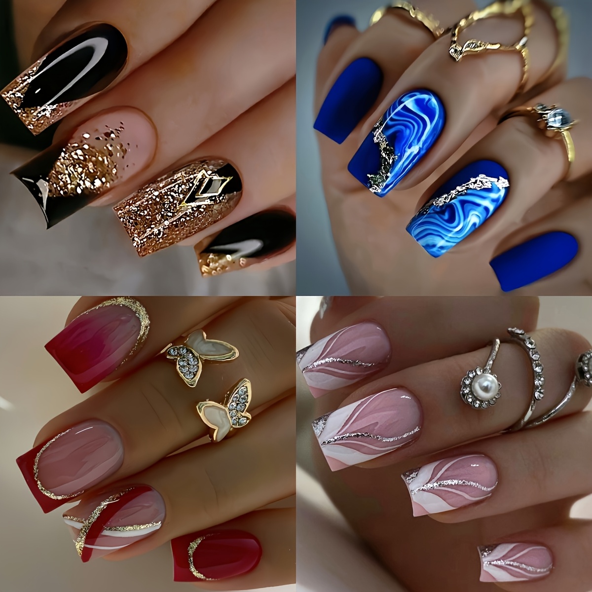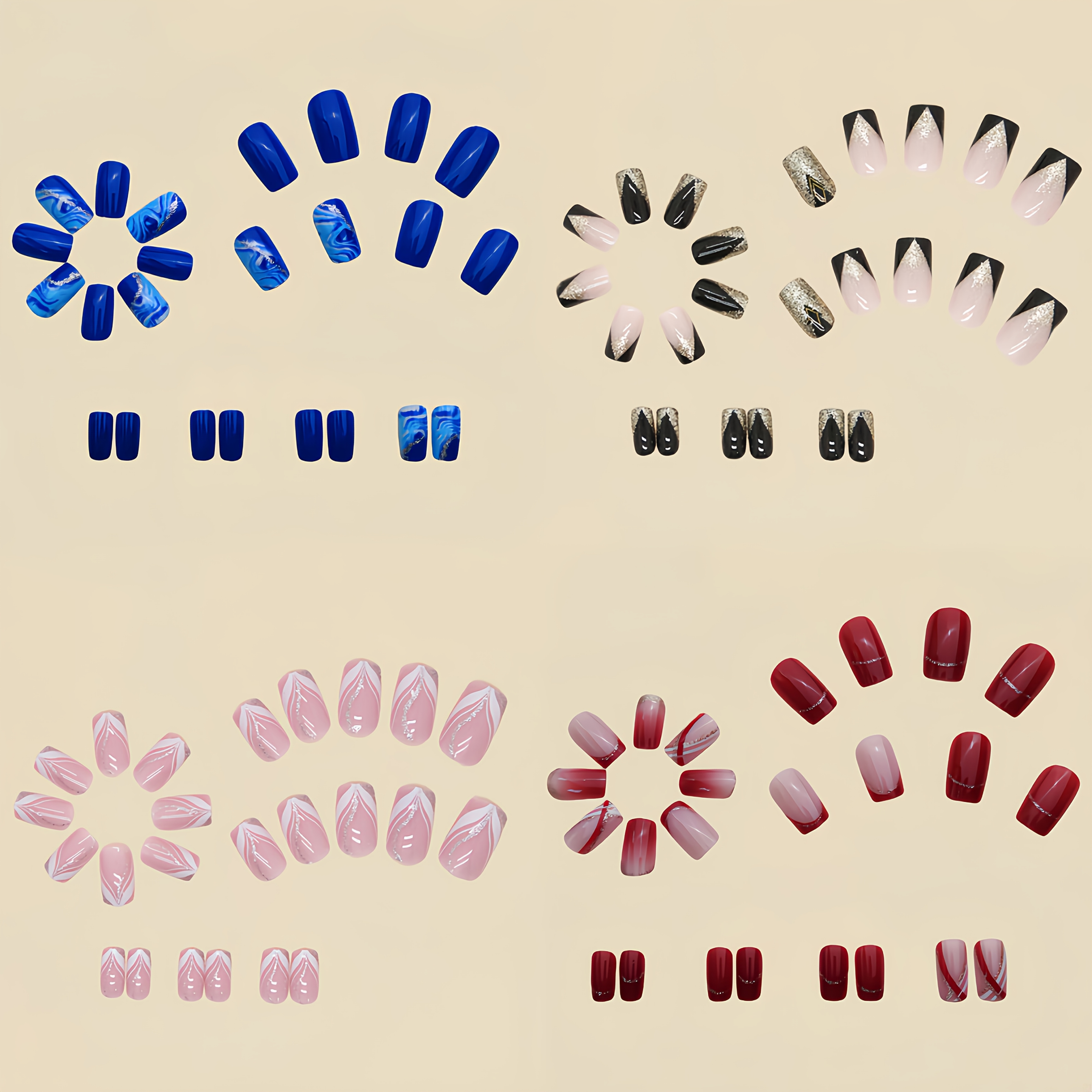 The Designs: This set features a curated mix of four primary colors. Enjoy the “Moody Noir” of glossy black, the “Oceanic Depth” of gradient blue, the “Sultry Crimson” of classic red, and the “Romantic Blush” of soft pink. Accents include modern geometric stripes and seamless ombre transitions.