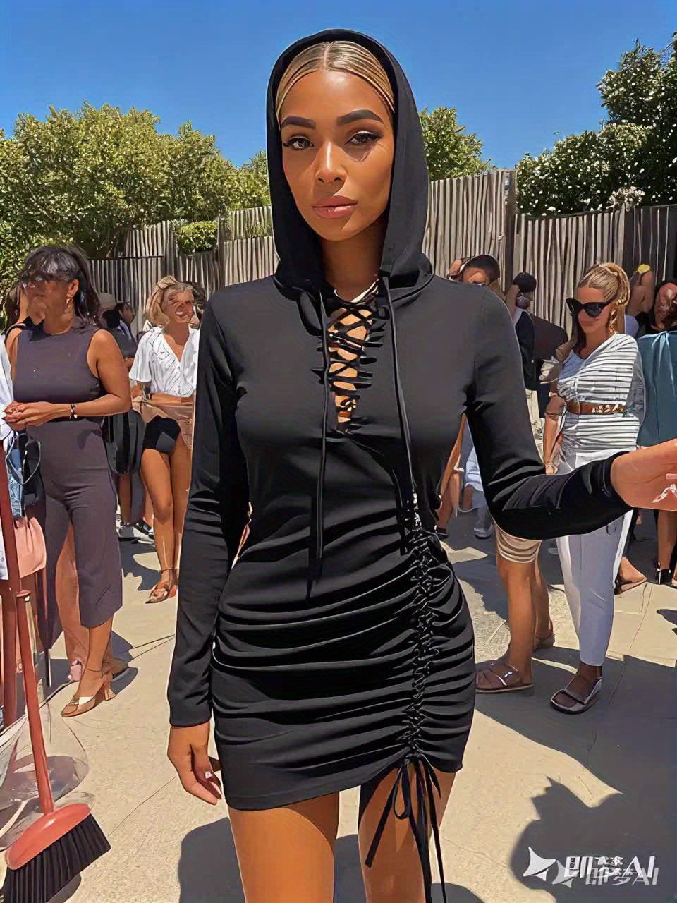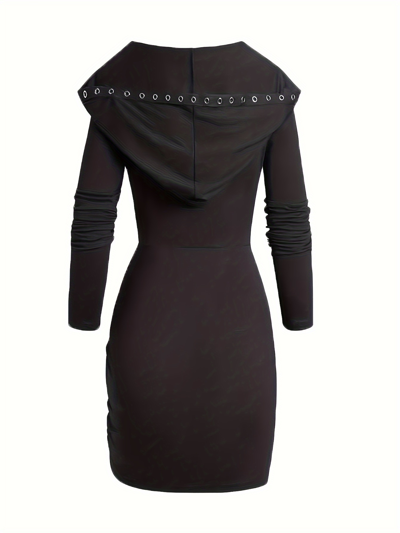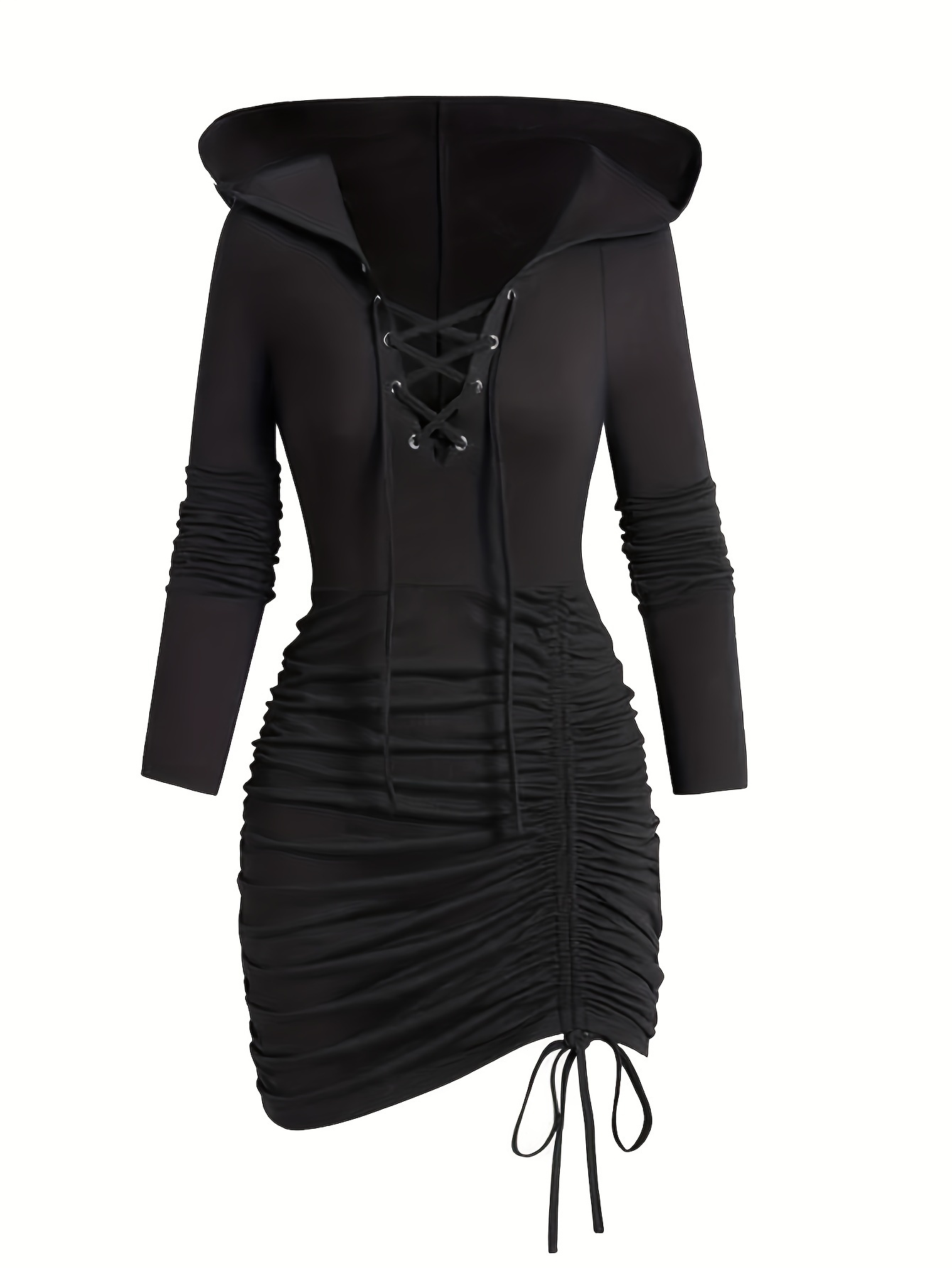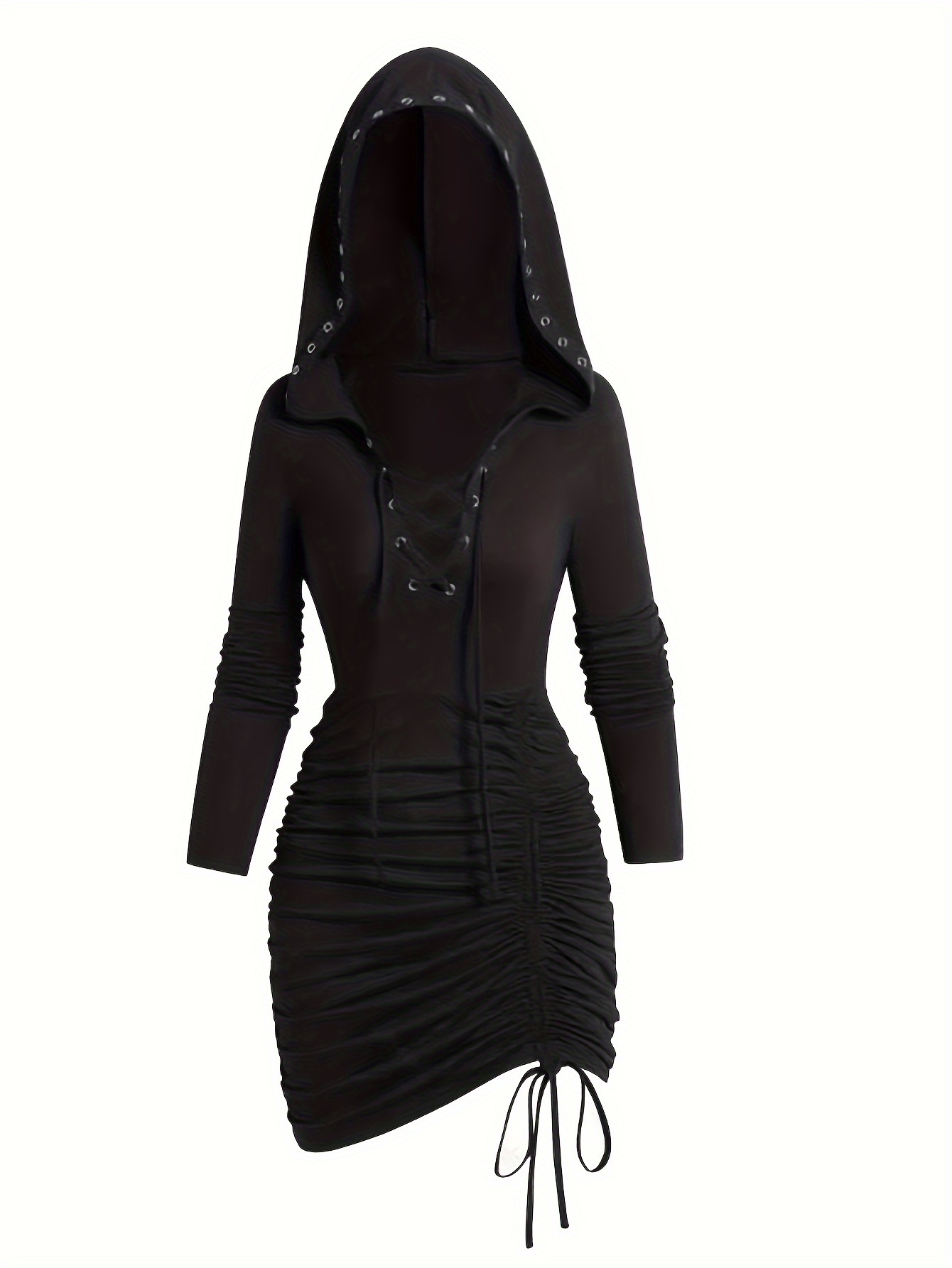 A Long Hooded Dress with Ties, Featuring Long Sleeves And a V-Neck.