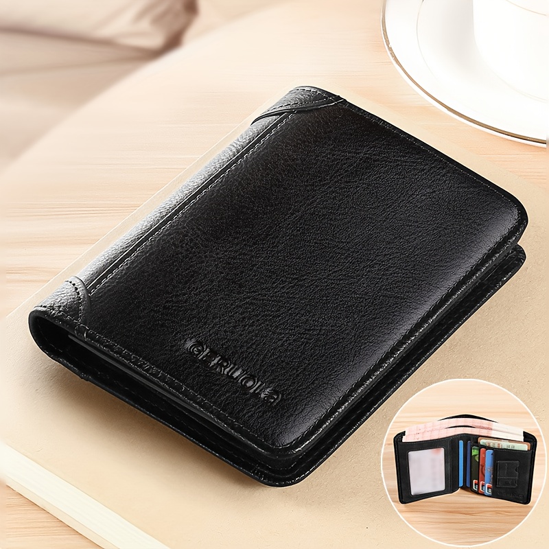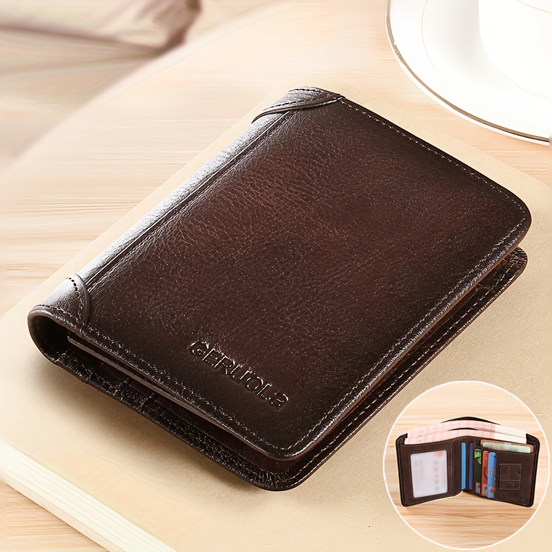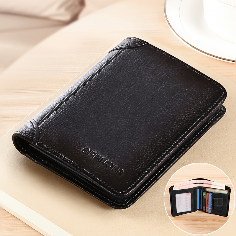 A Men’S Genuine Leather RFID Blocking Wallet – Ultra-Thin Foldable Design, Featuring 2 ID Card Slots, Large Capacity for Cash And Cards, Gold-Tone Hardware, And Anti-Theft Design.
