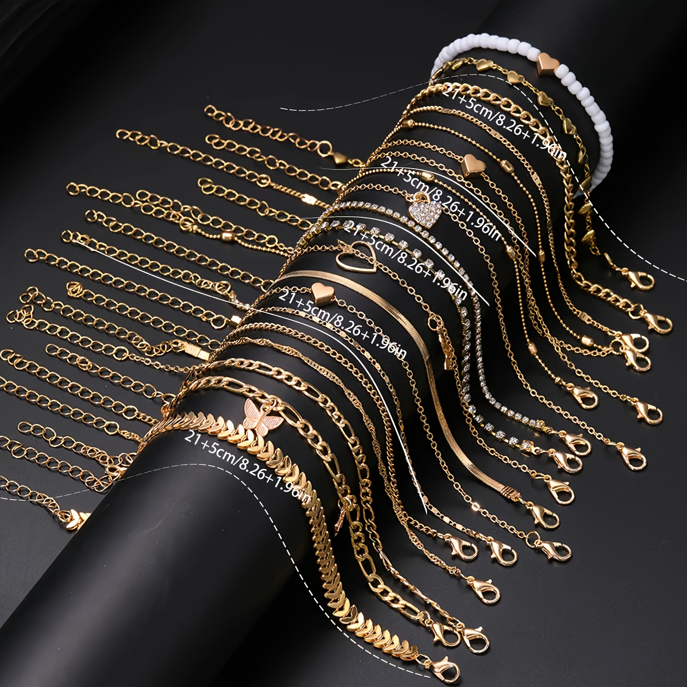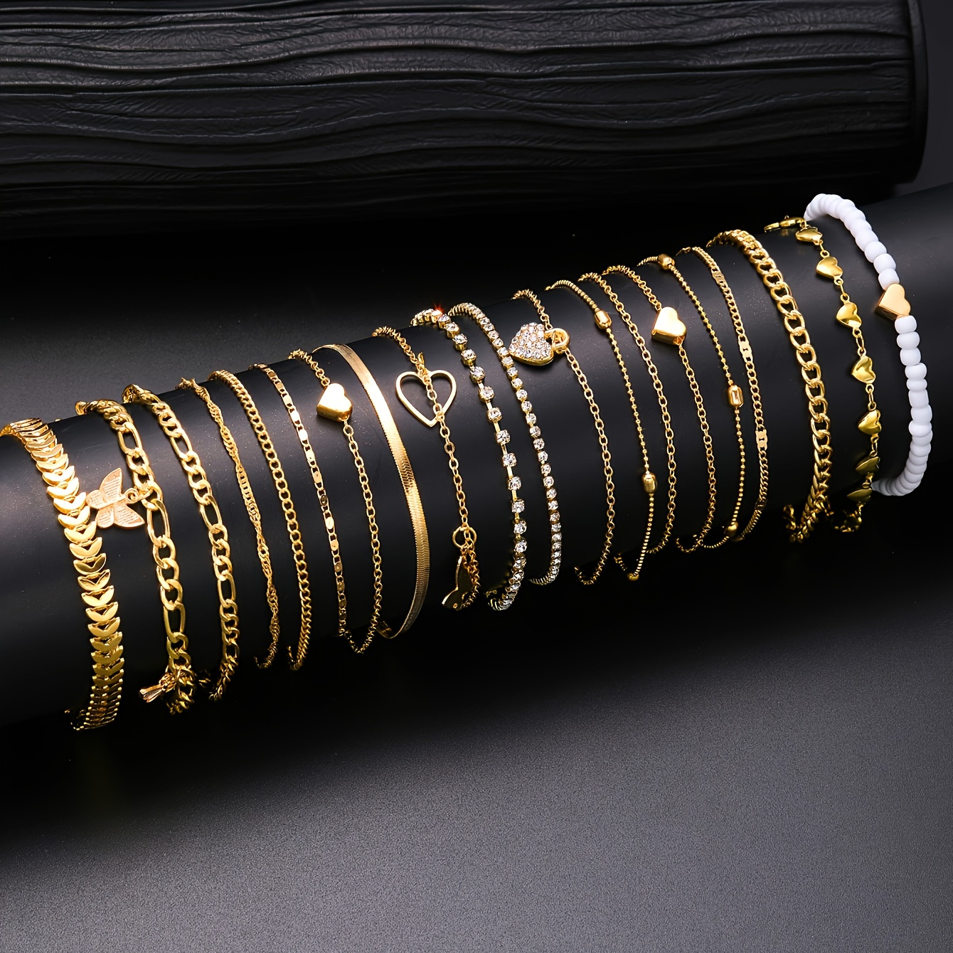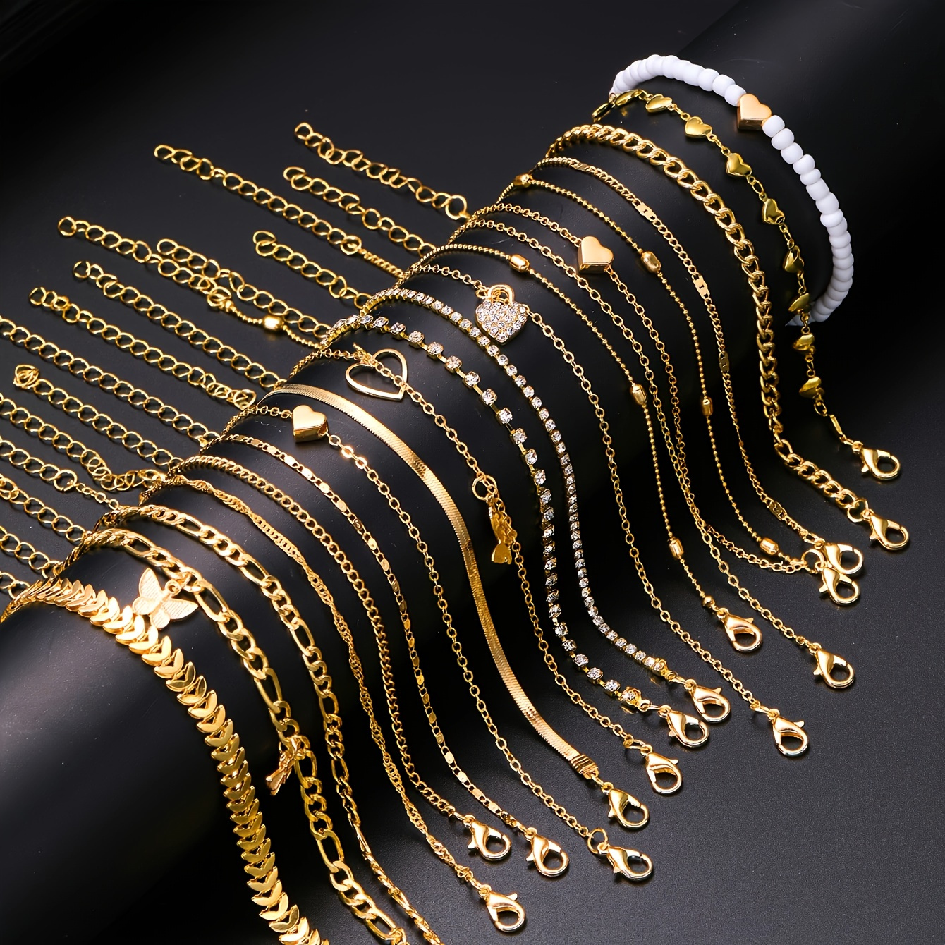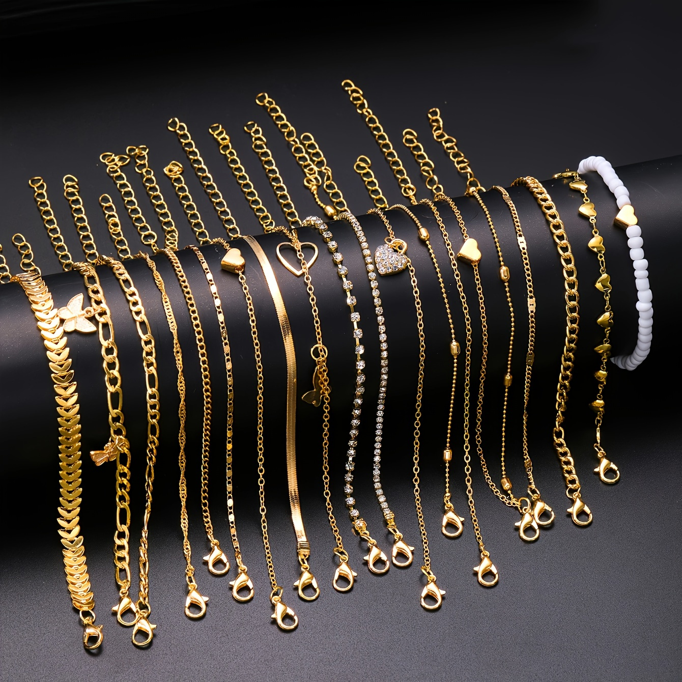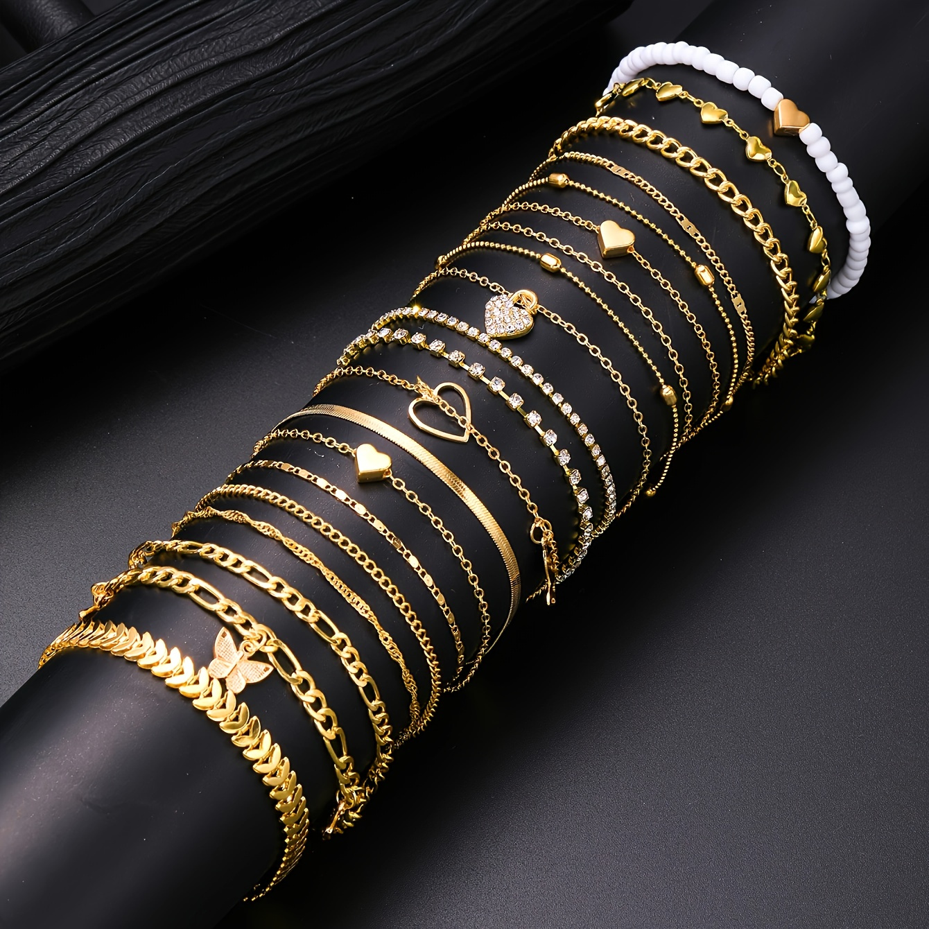 A Set of 19 Women’S Anklets Featuring Golden Hearts, Butterflies, Rhinestones, And Pearl Beads in a Bohemian Style, Adjustable for Layering. Perfect for Vintage Fashion, Holiday Parties, Dates, And Everyday Outfits.