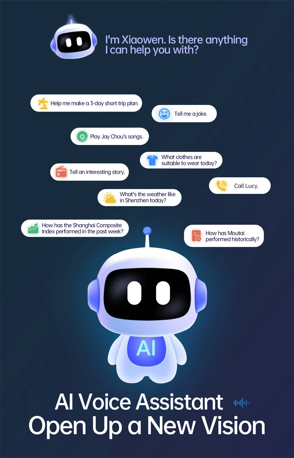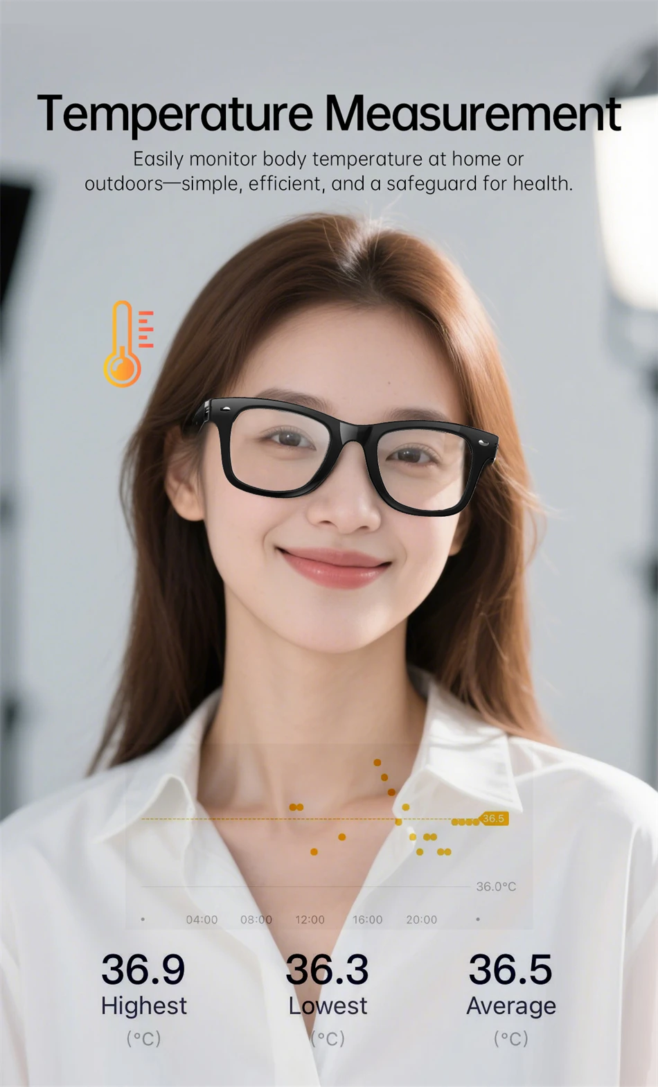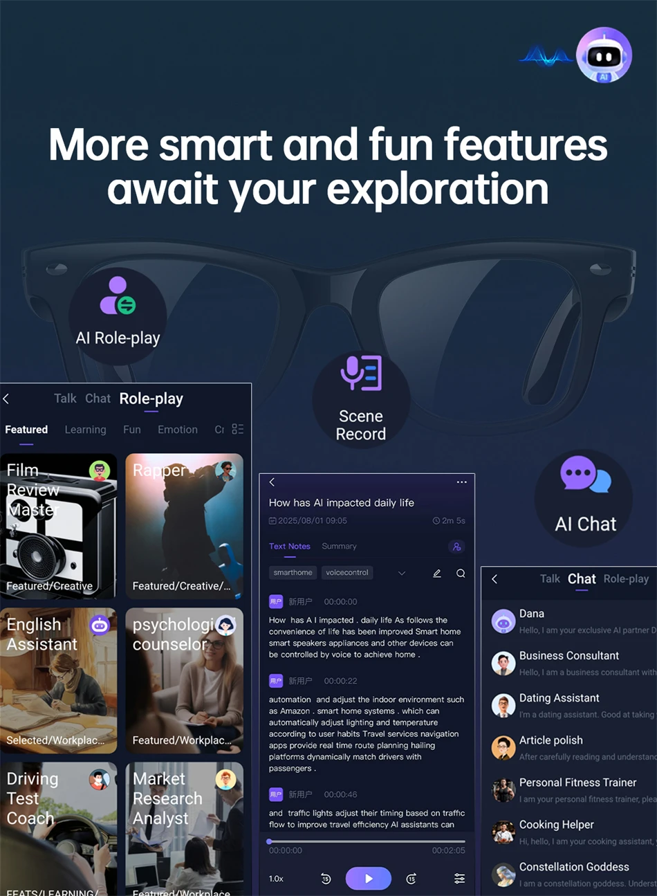 Heart rate monitoring, blood oxygen monitoring, outdoor UV ultraviolet monitoring, body temperature monitoring, AI dialogue and chat, AI multi-role selection, AI intelligent translation (mobile phone glasses translation, listening translation, face-to-face translation), A1 voice shorthand and summary, intelligent voice assistant, Bluetooth call, sports step counting, multi-sports mode, 7 days of battery life on a single charge. |