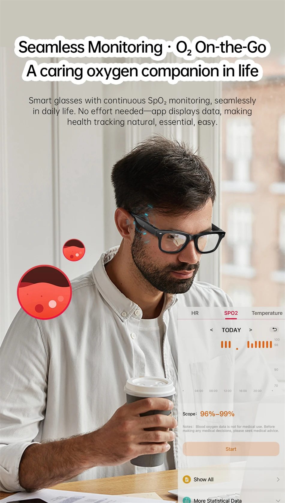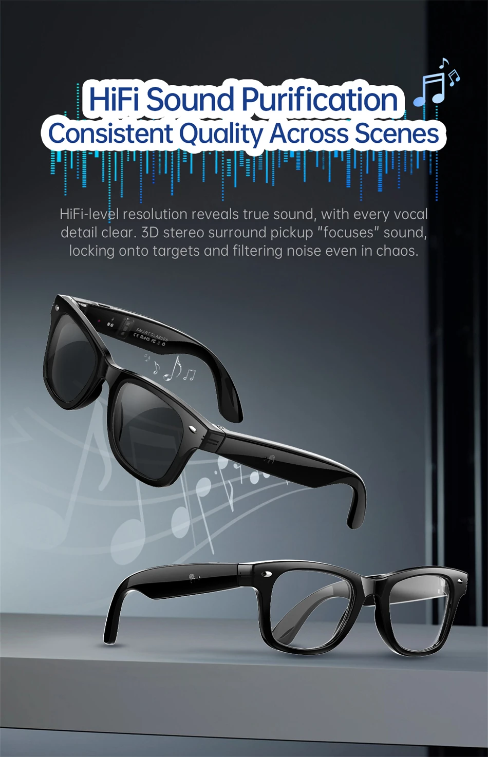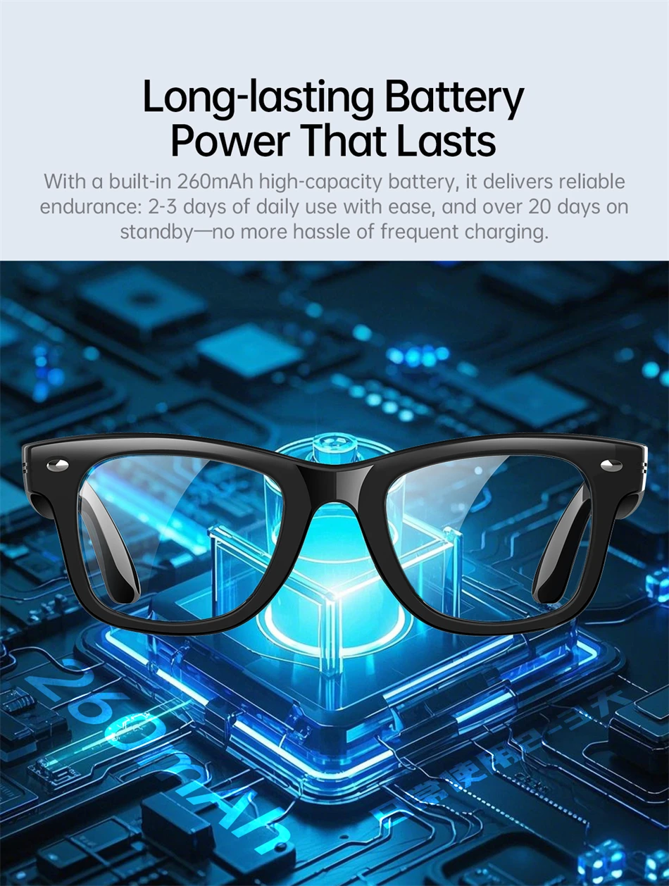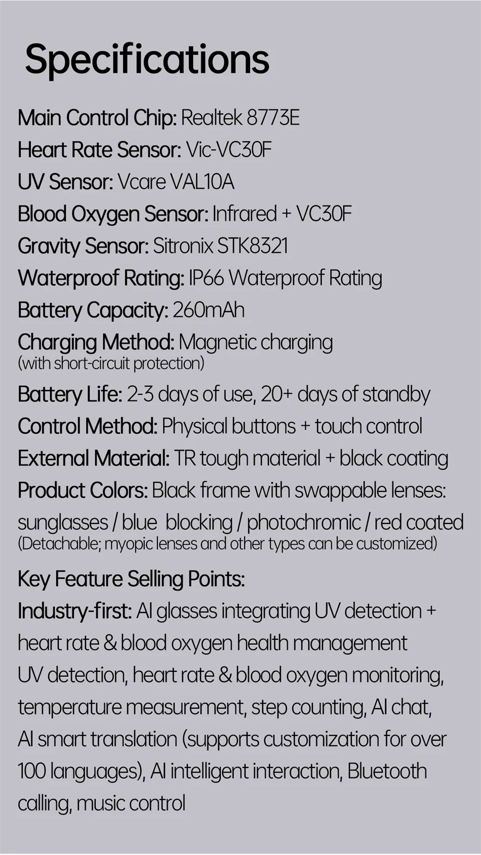 Industry first: UV ultraviolet detection, heart rate and blood oxygen health management , heart rate monitoring, blood oxygen monitoring, outdoor UV ultraviolet monitoring, body temperature monitoring, AI dialogue and chat, AI multi-role selection, AI intelligent translation (mobile phone glasses translation, listening translation, face-to-face translation), A1 voice shorthand and summary, intelligent voice assistant, Bluetooth call, sports step counting, multi-sport mode, music playback (switching, pausing music appreciation), 35g lightweight weight comfortable to wear, equipped with sunglasses, anti-blue light, and discoloration , four types of lenses with red coating (removable and optional myopia and other lenses), low power consumption and long-lasting battery life, and 7 days of battery life on a single charge. |