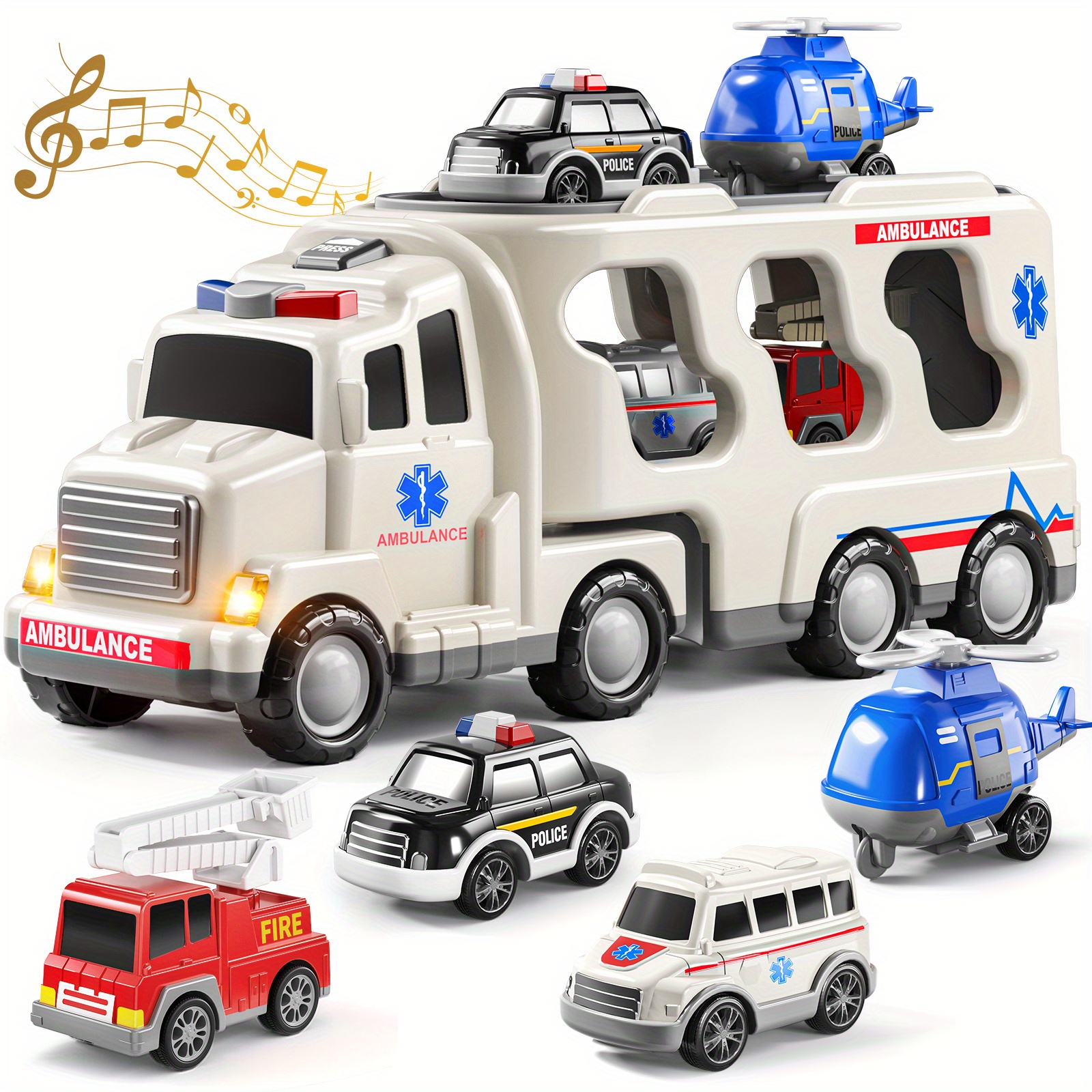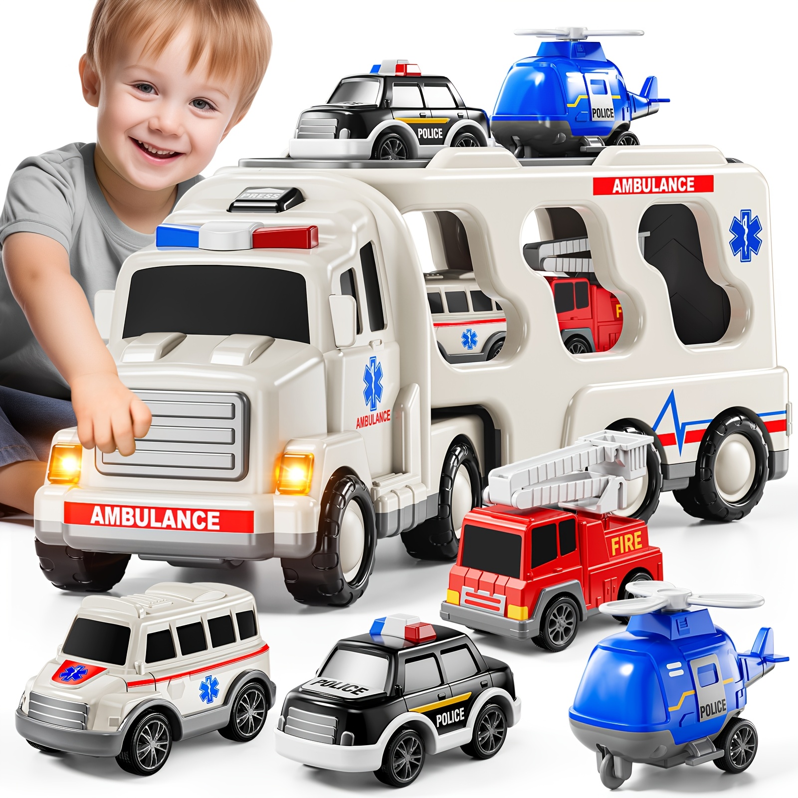 Ambulance Truck Toys for 3 4 5 Toddlers, 5in 1 Kids Carrier Fire Trucks Friction Power Toys with Light Sound for Kids Birthday Gift