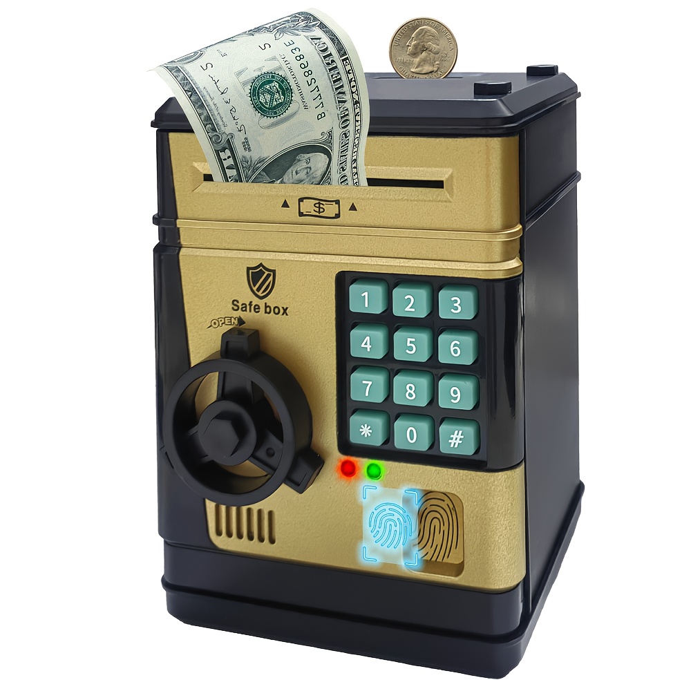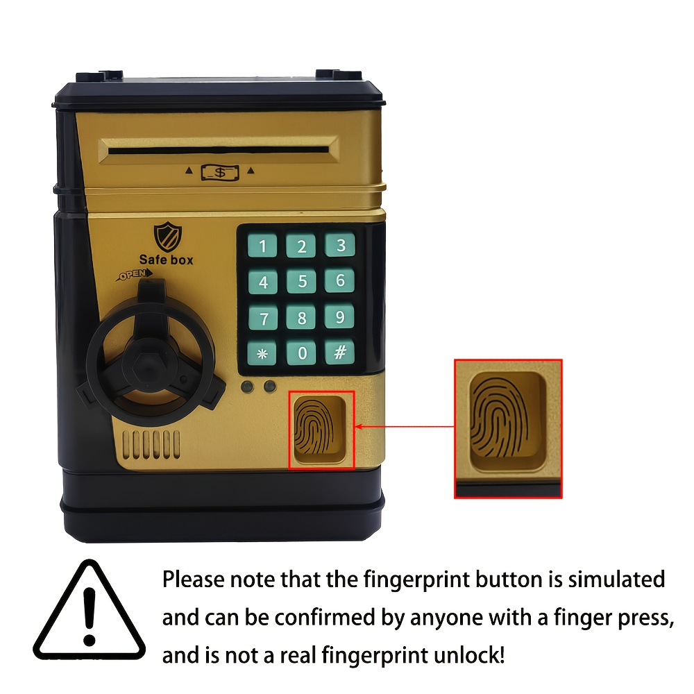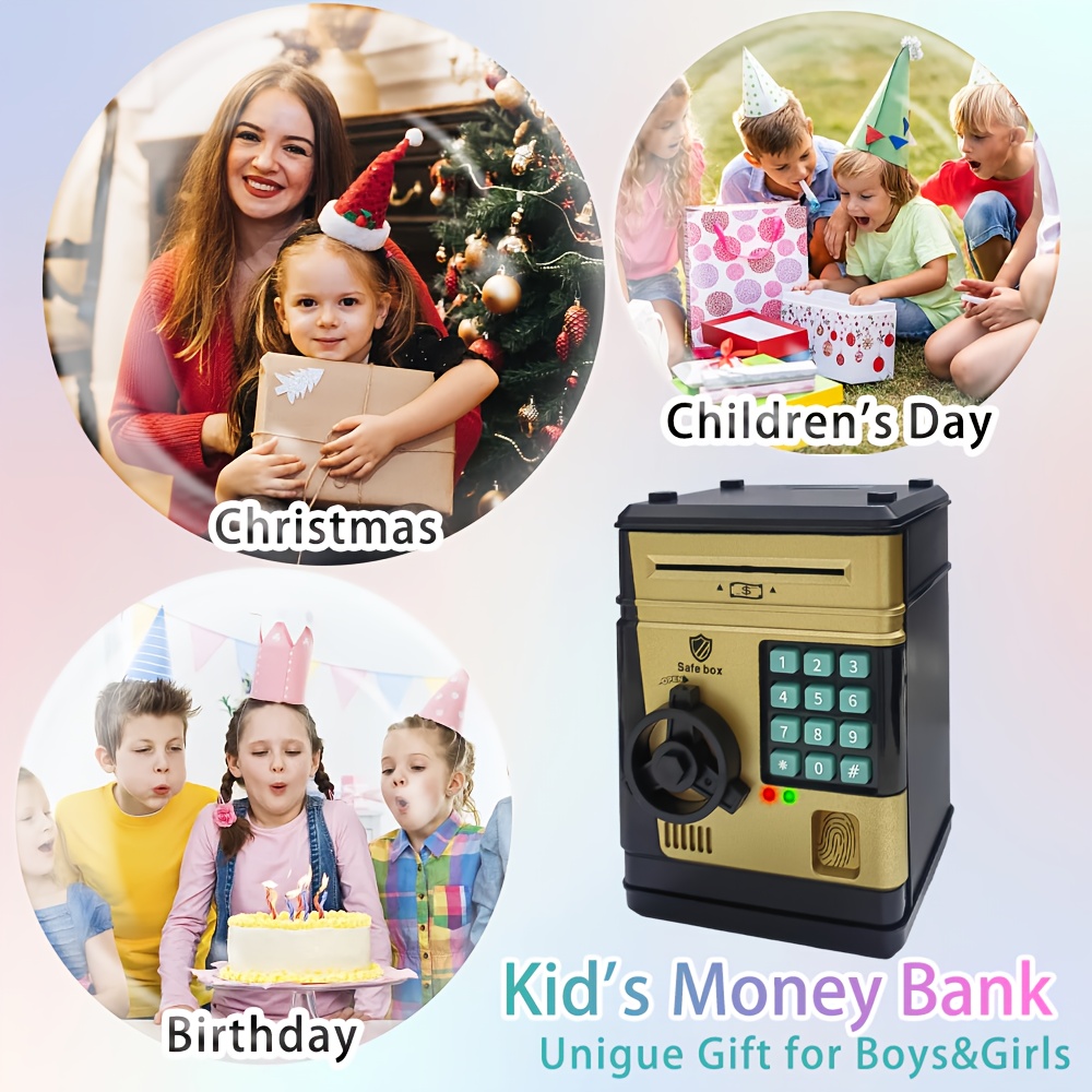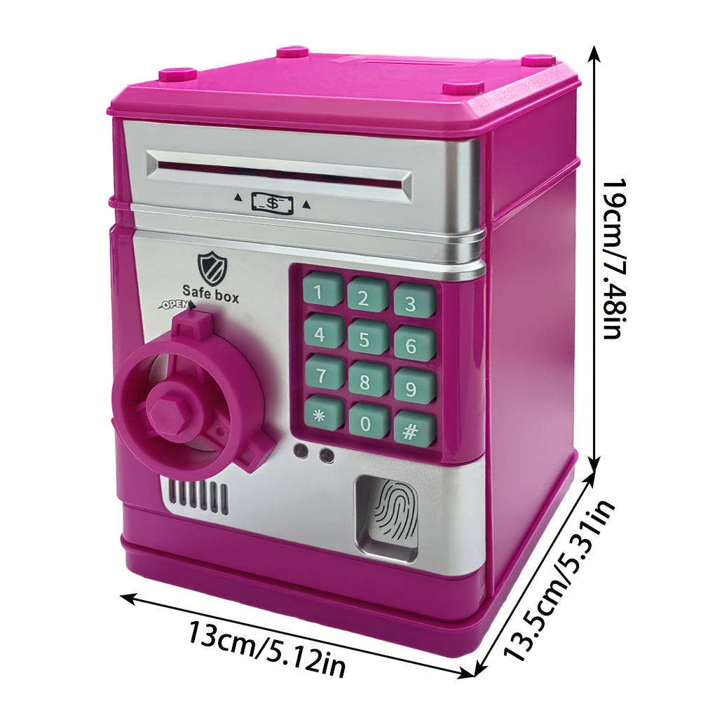 An Electronic Piggy Bank with Fingerprint And Password Protection, Featuring Voice And Music Functions, Available in Golden, Silver, Blue, And Pink. Made from Durable ABS Material, Suitable for Children Aged 3 And Above. This Electronic Password Pig