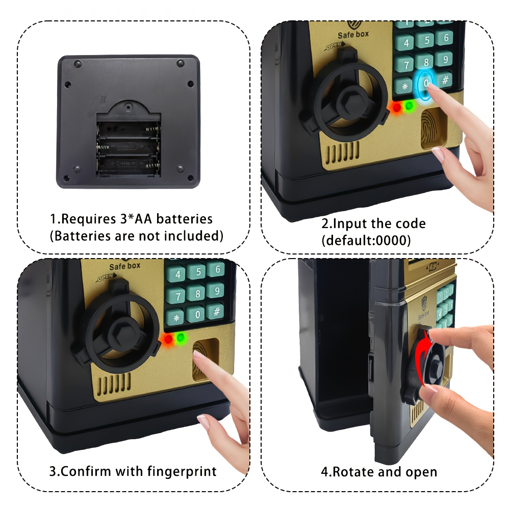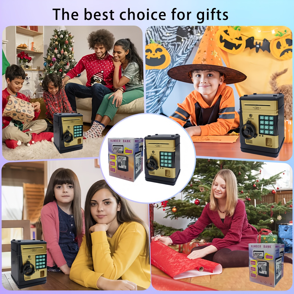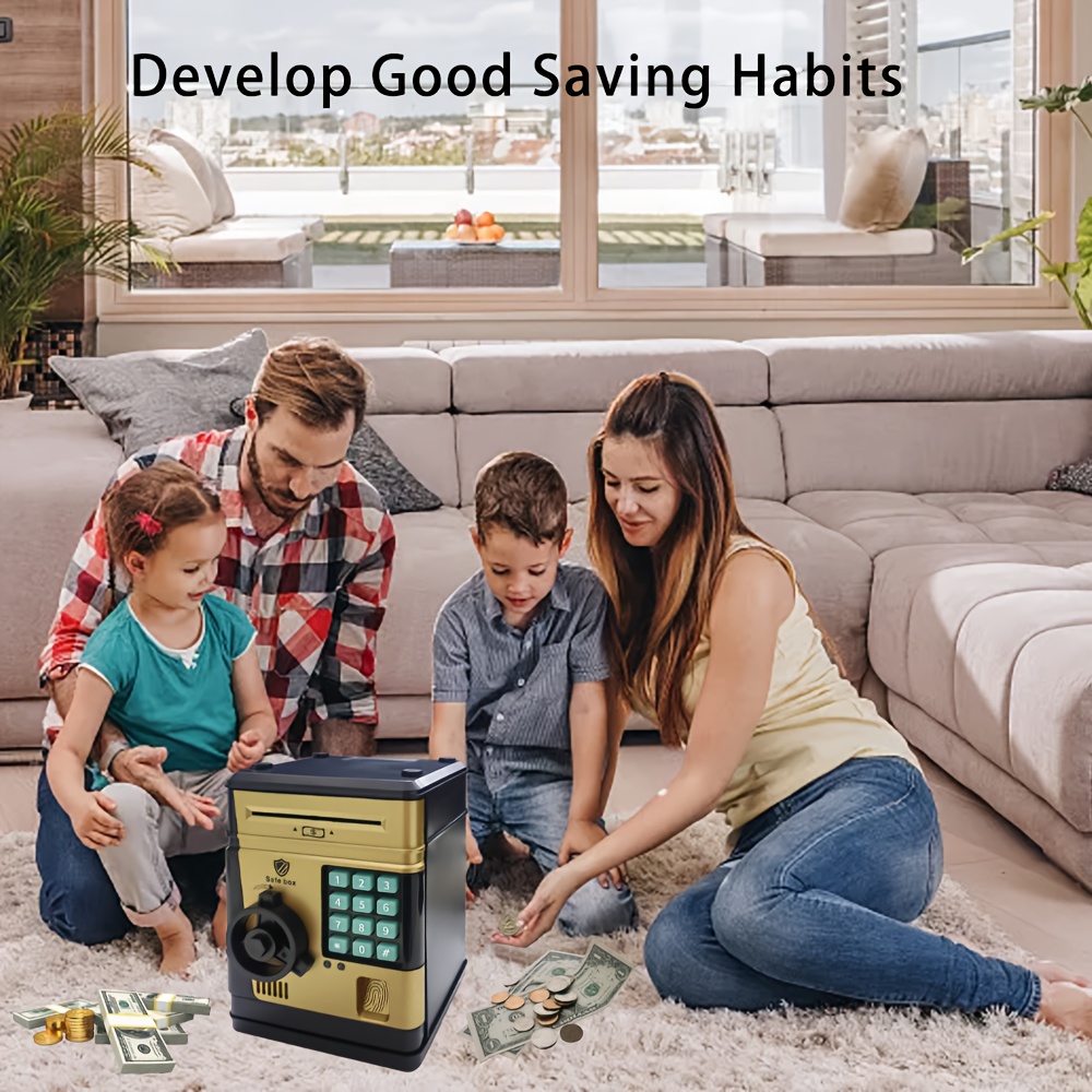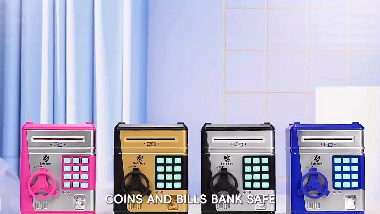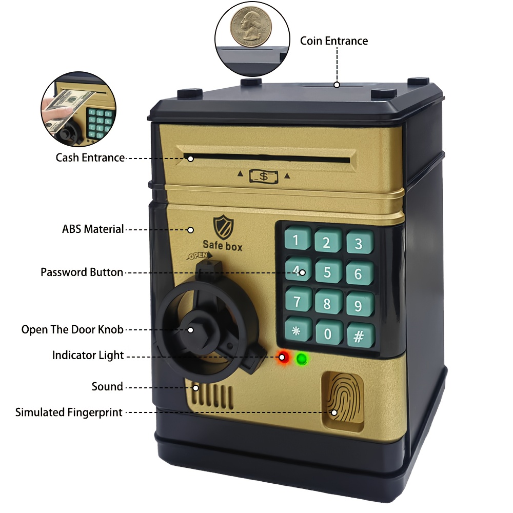 An Electronic Piggy Bank with Fingerprint And Password Protection, Featuring Voice And Music Functions, Available in Golden, Silver, Blue, And Pink. Made from Durable ABS Material, Suitable for Children Aged 3 And Above. This Electronic Password Pig