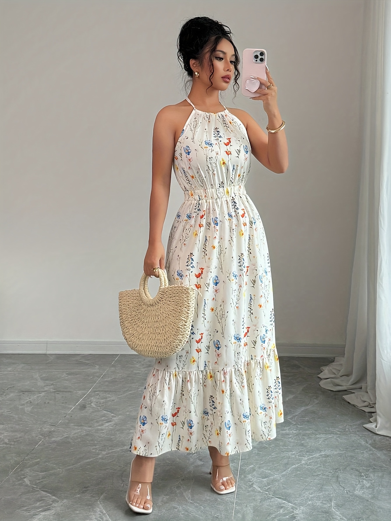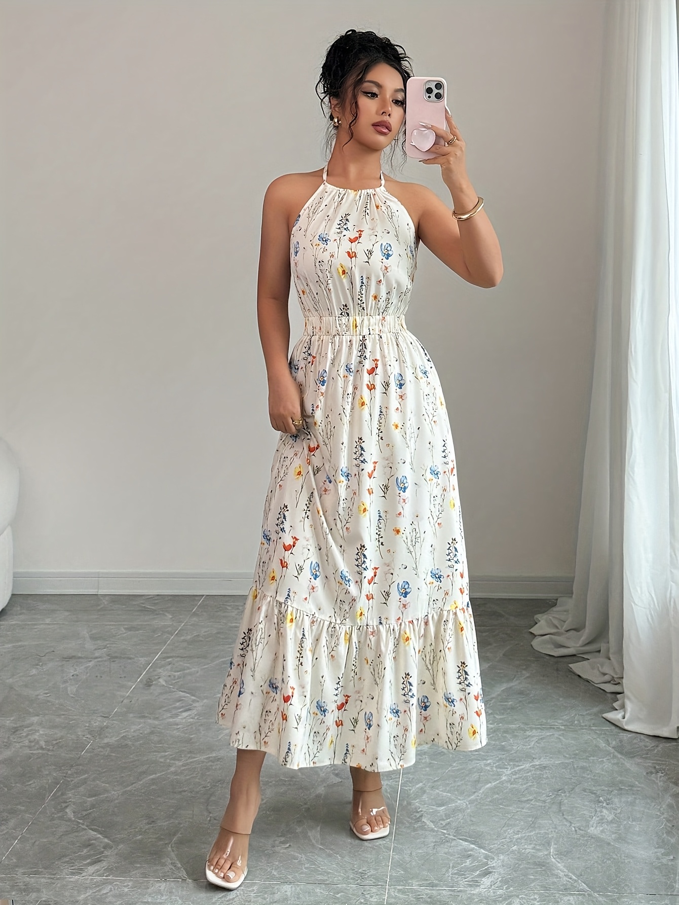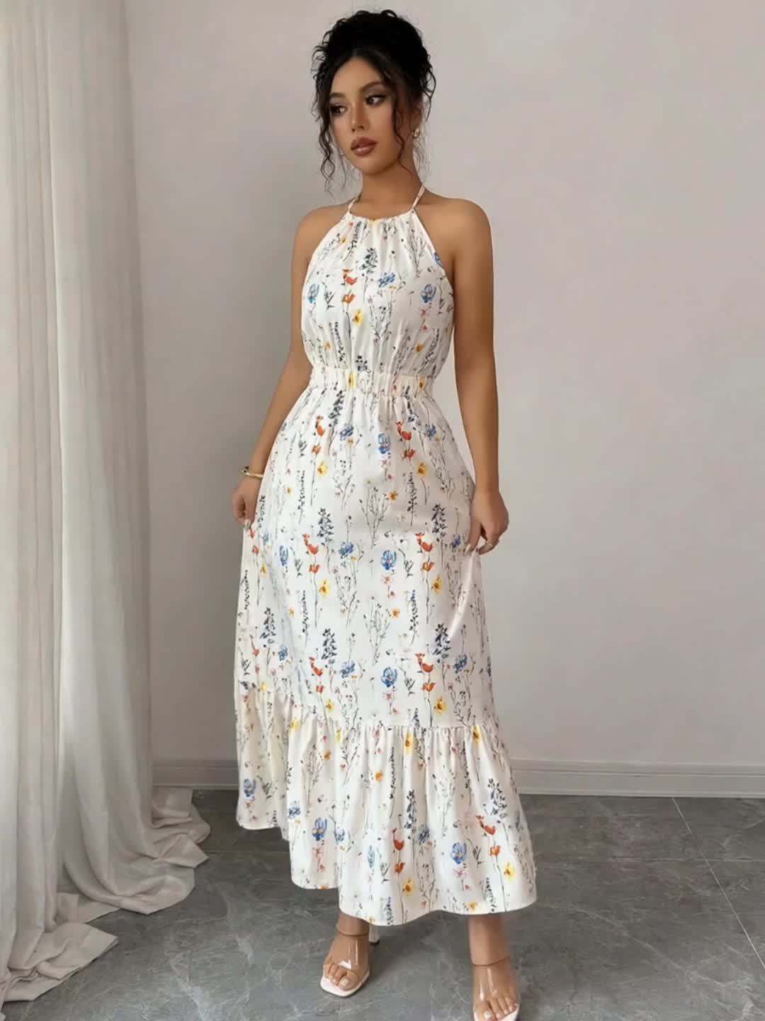 An Elegant Floral Print Halter Neck Dress with a Loose Waist And Back Tie, Perfect for Dates, Parties, Gatherings, And Beach Vacations