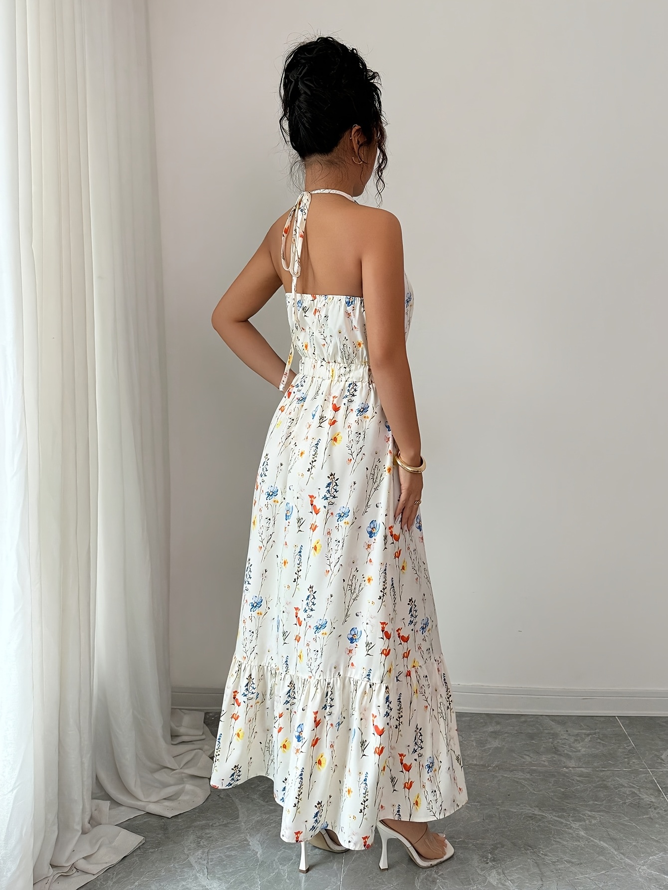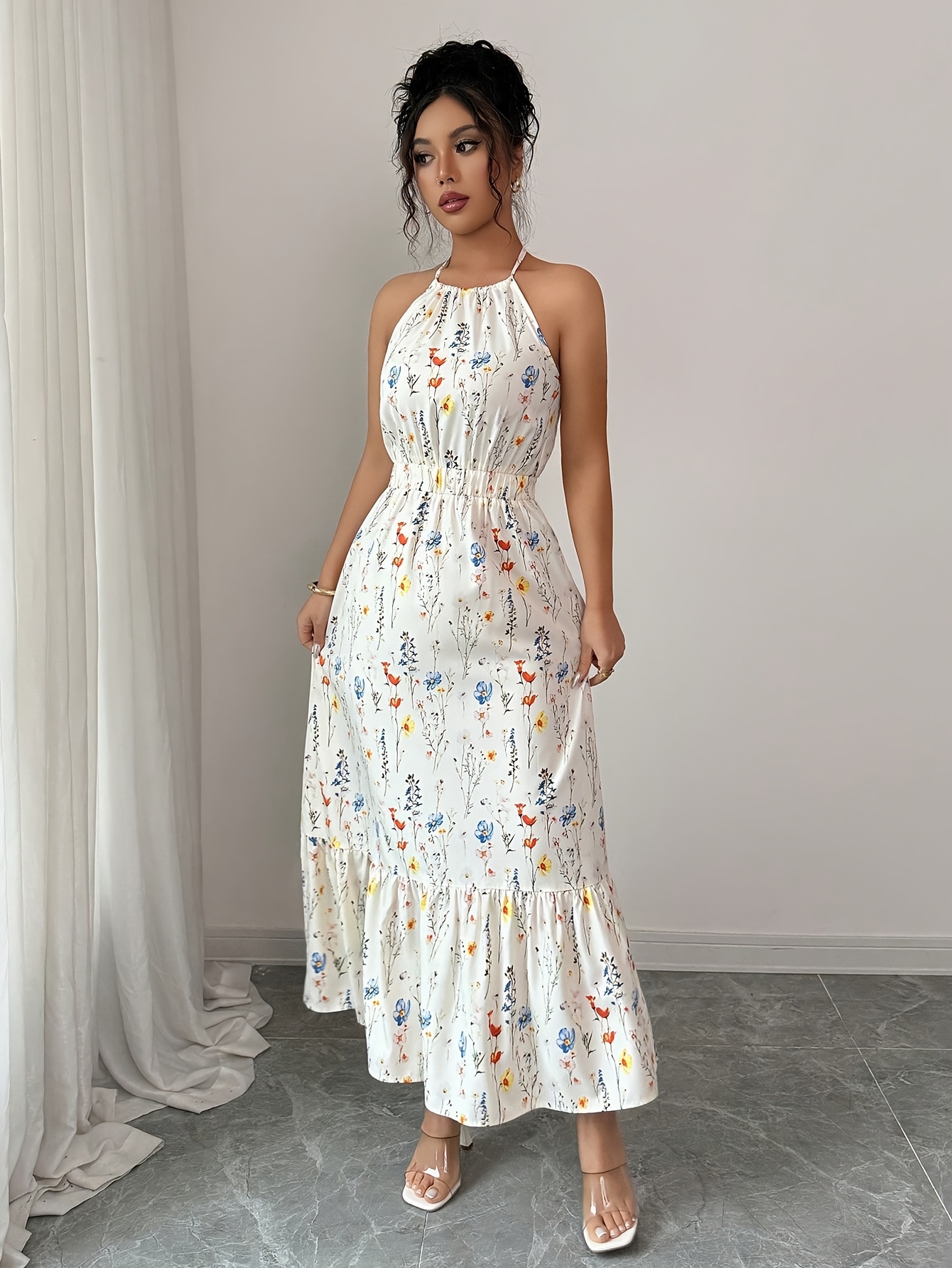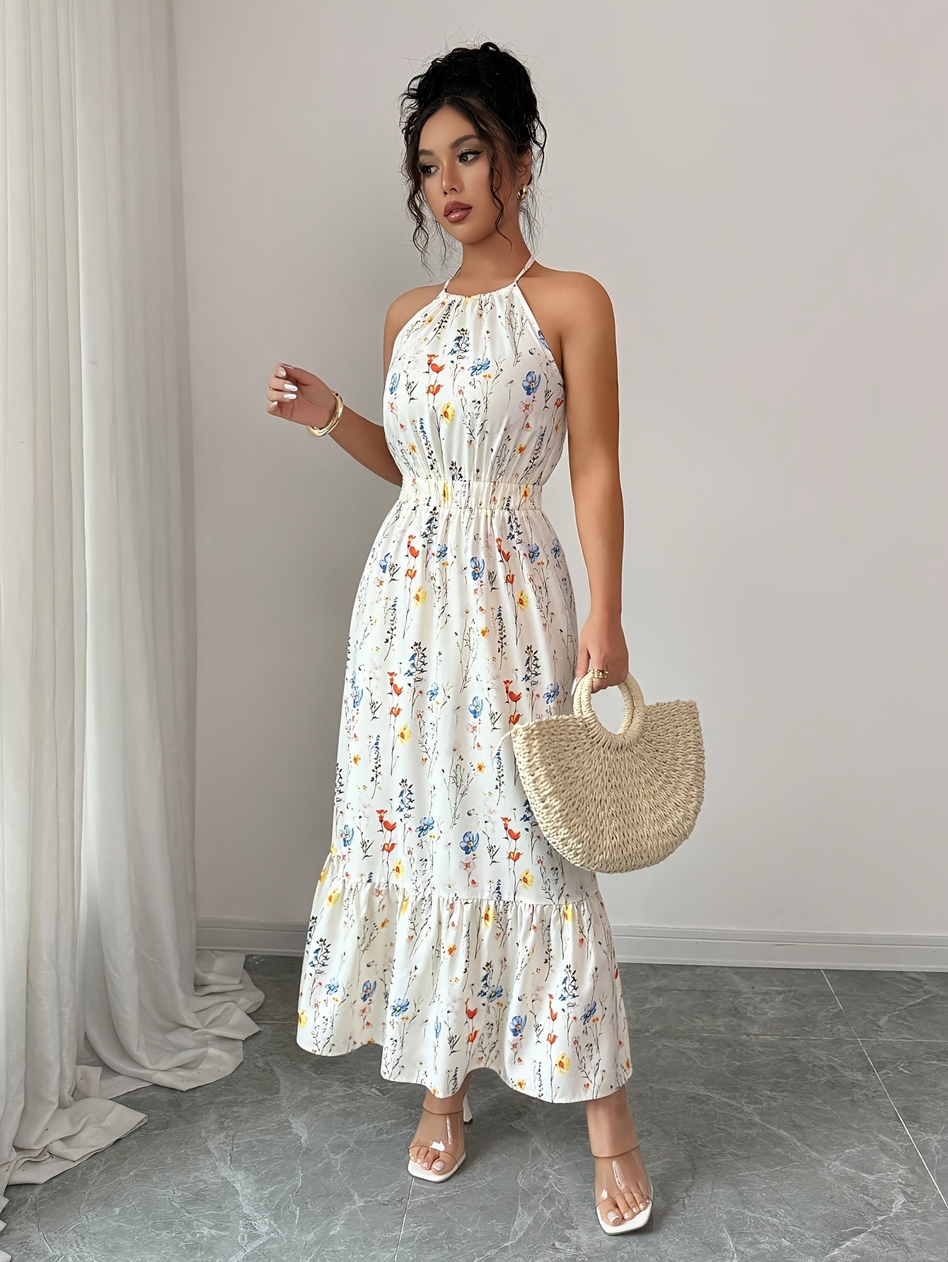An Elegant Floral Print Halter Neck Dress with a Loose Waist And Back Tie, Perfect for Dates, Parties, Gatherings, And Beach Vacations
