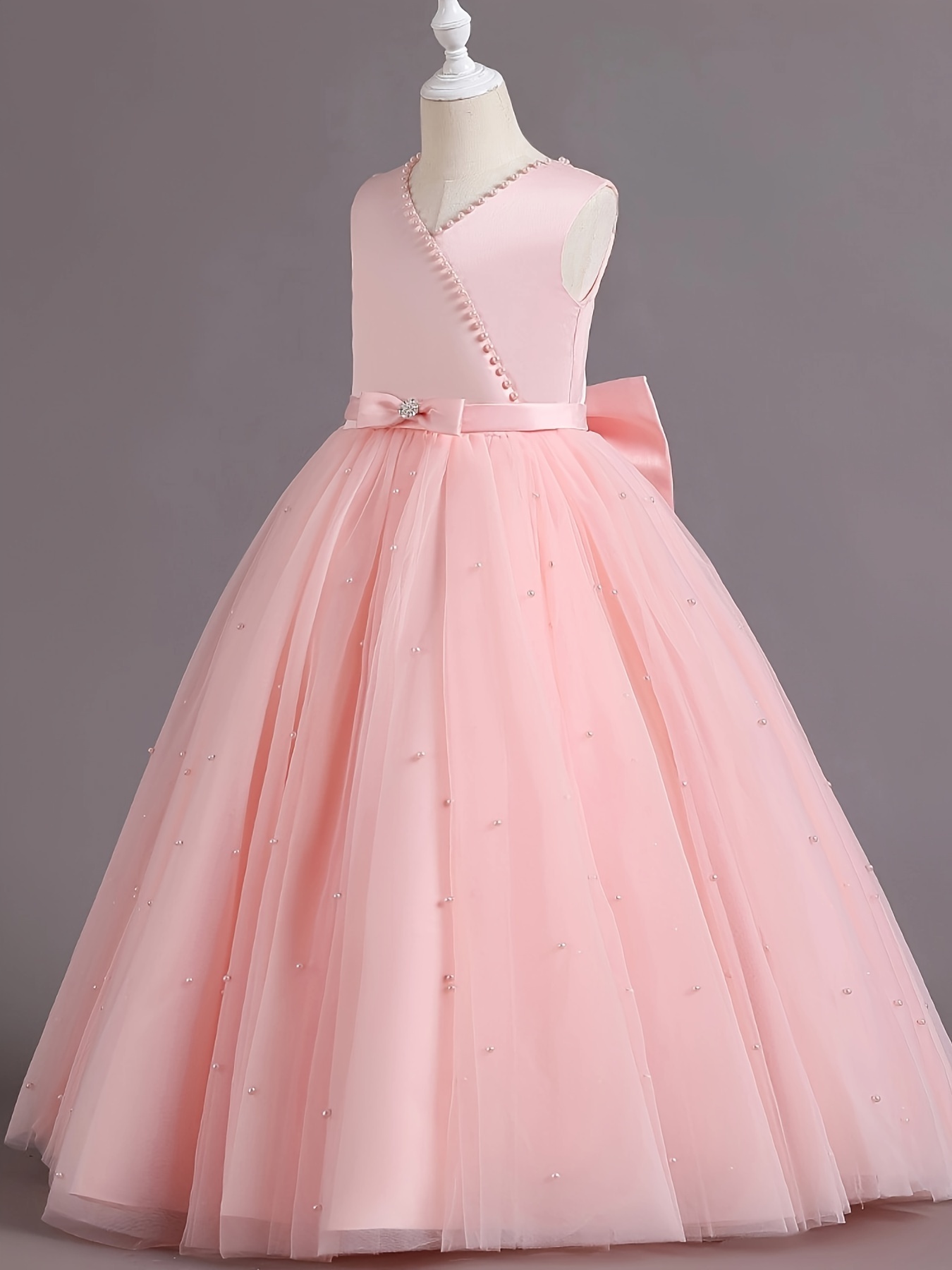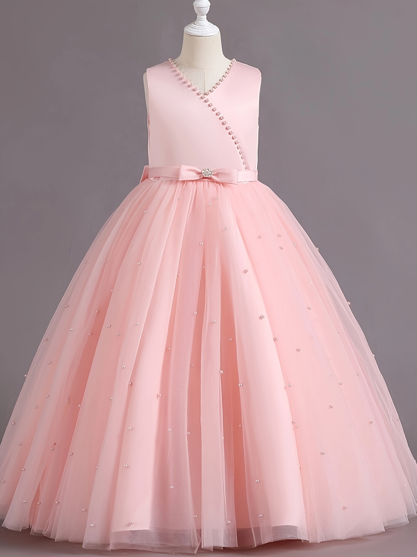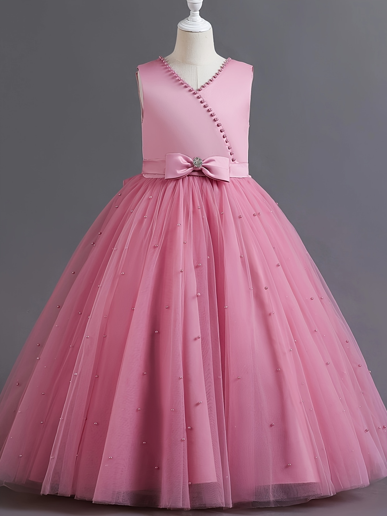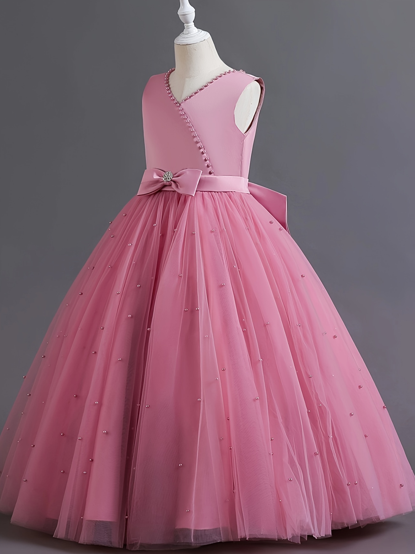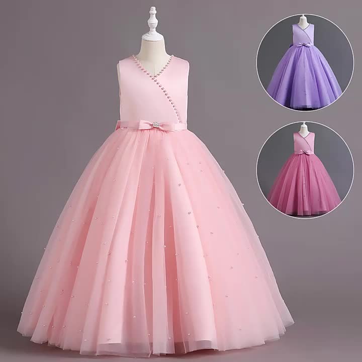 Asian 14Y Teenager V Neck Princess Beading Solid Color No-Sleeve Straight Skirt Evening Full Dress