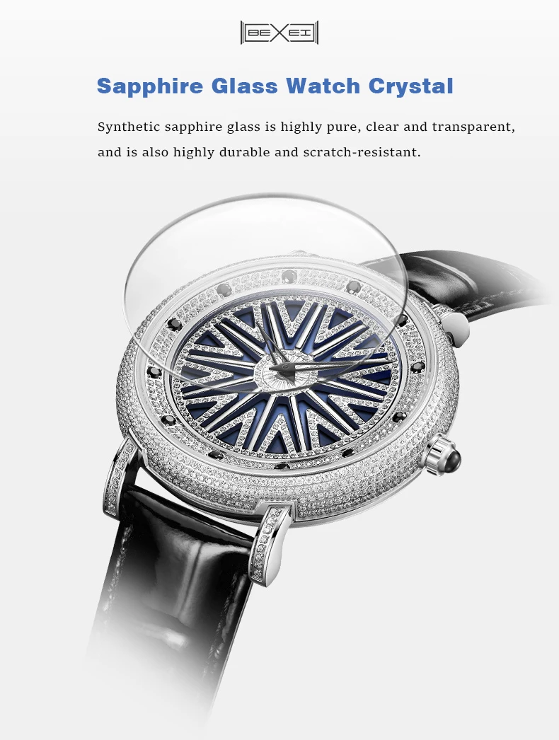 Synthetic sapphire crystal, crystal clear, scratch-resistant and impeccable.