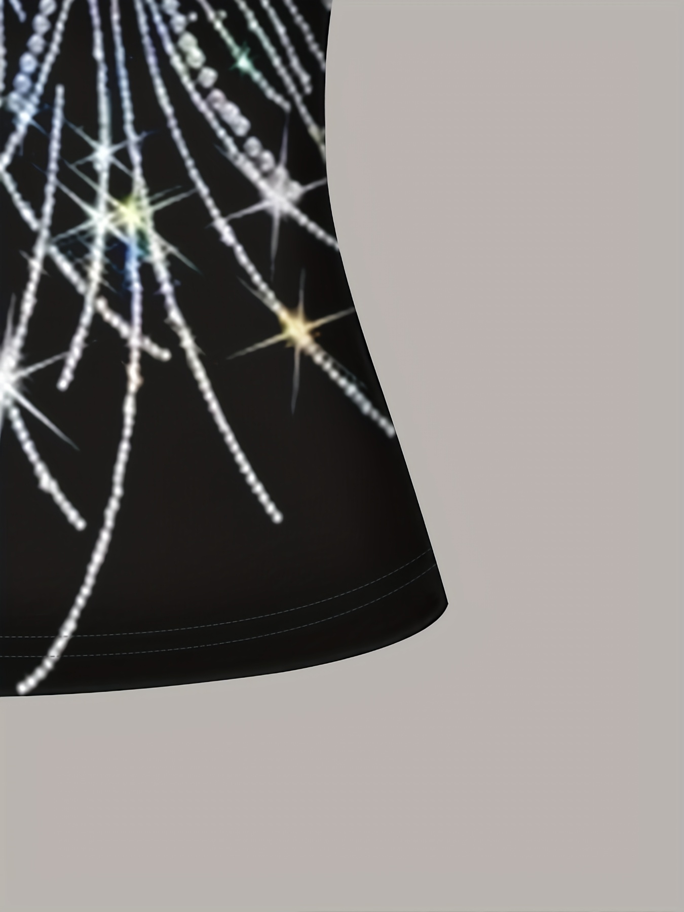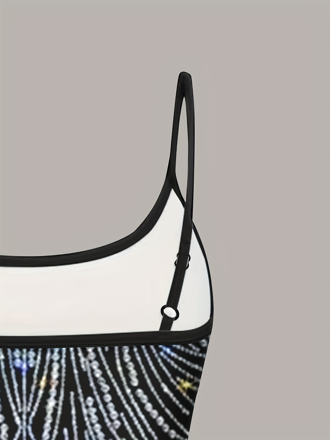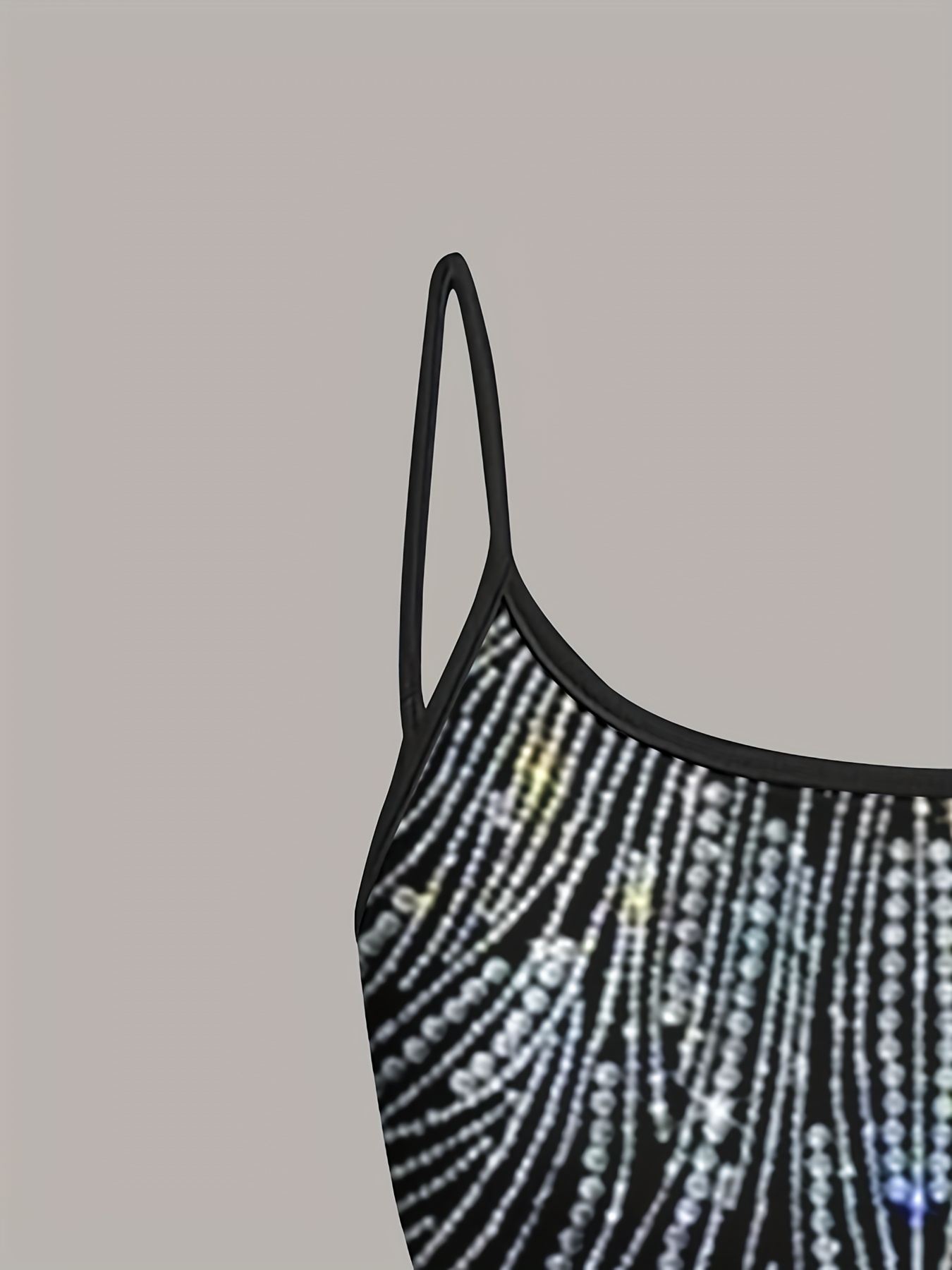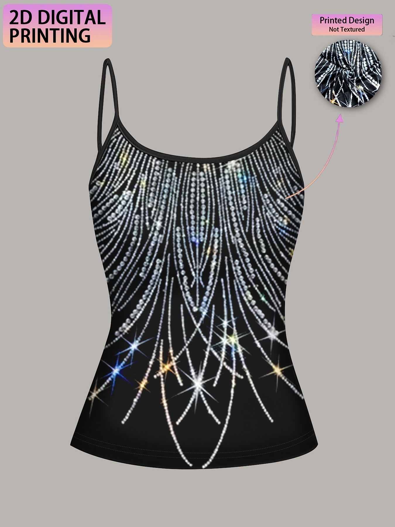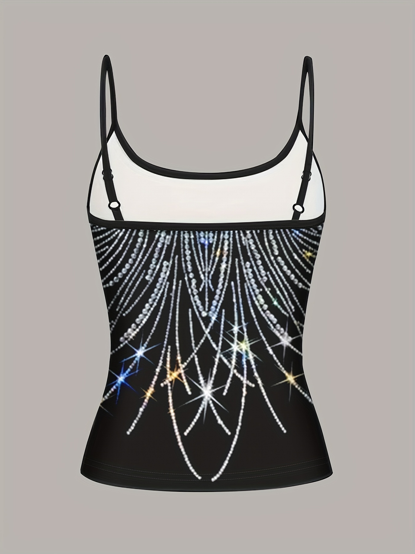 BK2522100292D Digital Printed Design – Not Textured Black Shiny Rhinestone Night Tassel Print Camisole, Machine Washable and Dry Cleanable, Features Thin Straps for a Sexy and Fashionable Look, Ideal for Summer Daily Commute and Date Wear