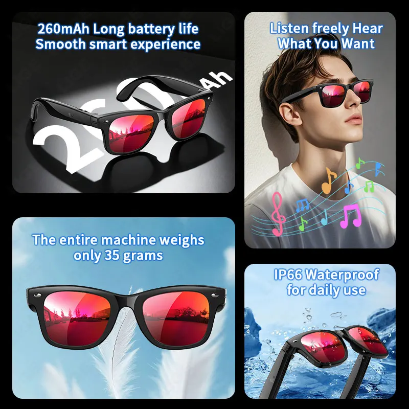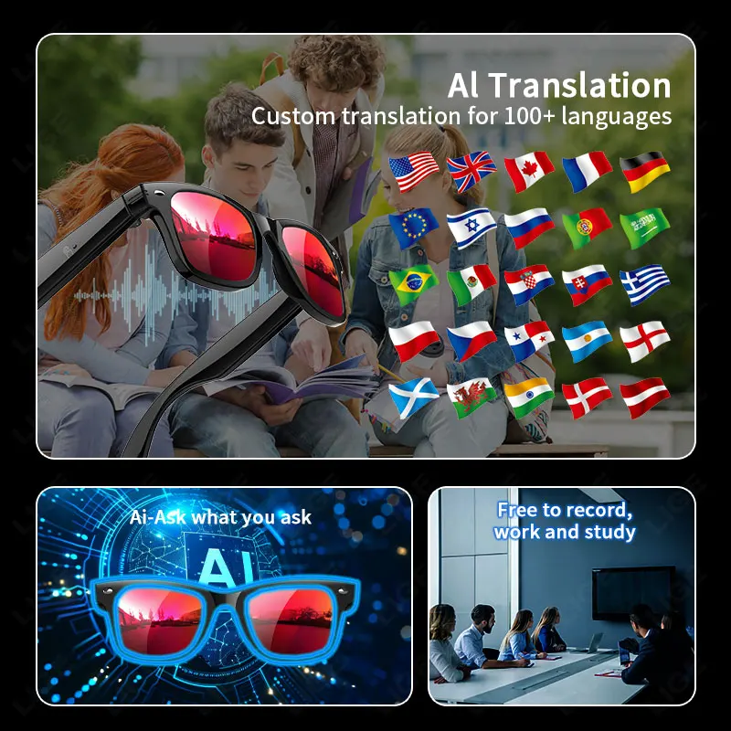 Heart rate monitoring, blood oxygen monitoring, outdoor UV monitoring, body temperature monitoring, AI dialogue and chat, AI multi-role selection, AI intelligent translation (mobile phone+glasses translation, audio interpretation, face-to-face translation), A1 voice shorthand and summary, intelligent voice assistant, Bluetooth calling, exercise step counting , multi-sport mode, music playback (switching, pausing music appreciation), 35g light weight and comfortable to wear, equipped with sunglasses, anti-blue light, discoloration, red coating four lenses (Customized prescription lenses are not accepted), low power consumption and long-lasting battery life, 7 days of battery life on a single charge (varies by usage)