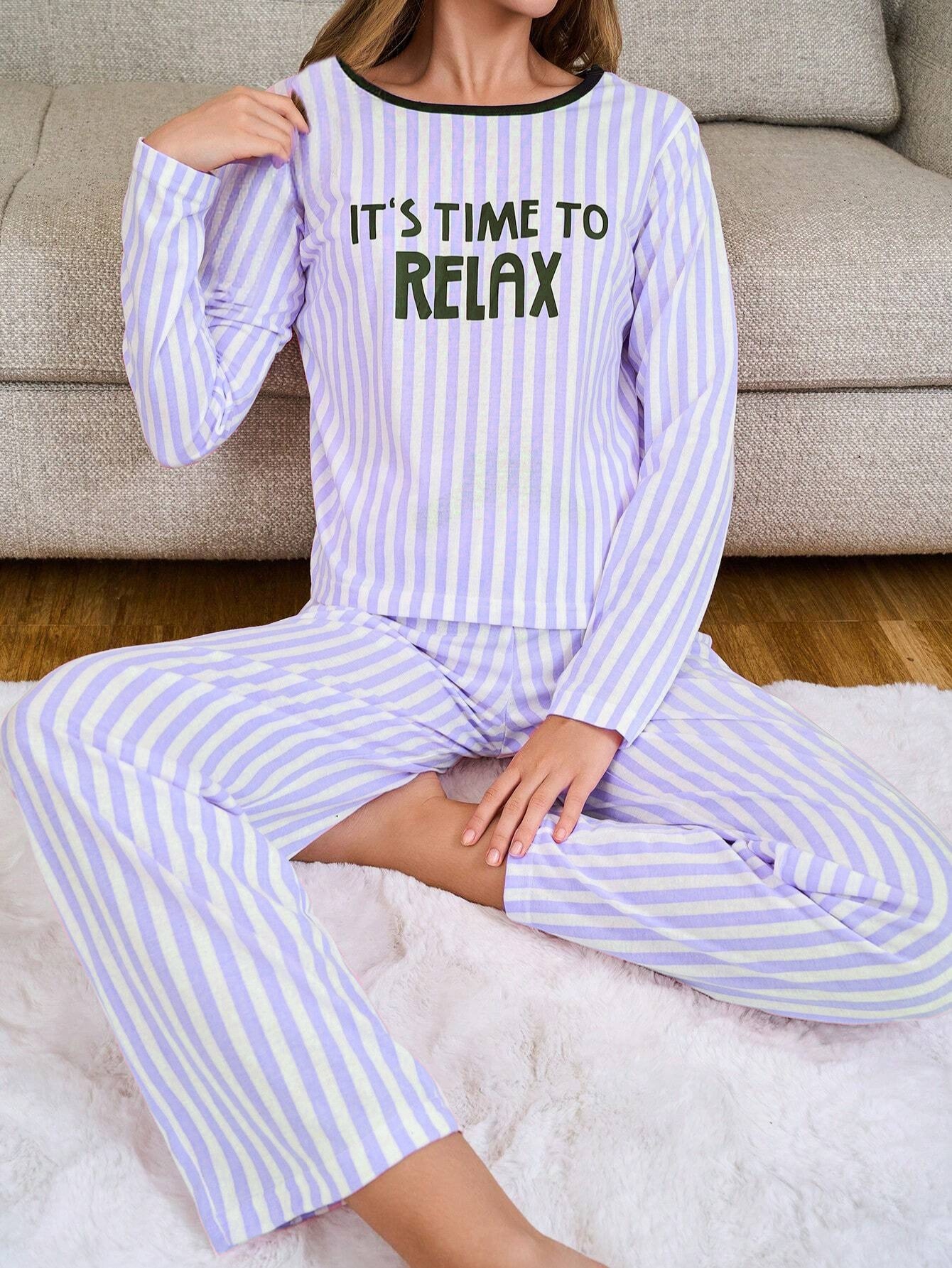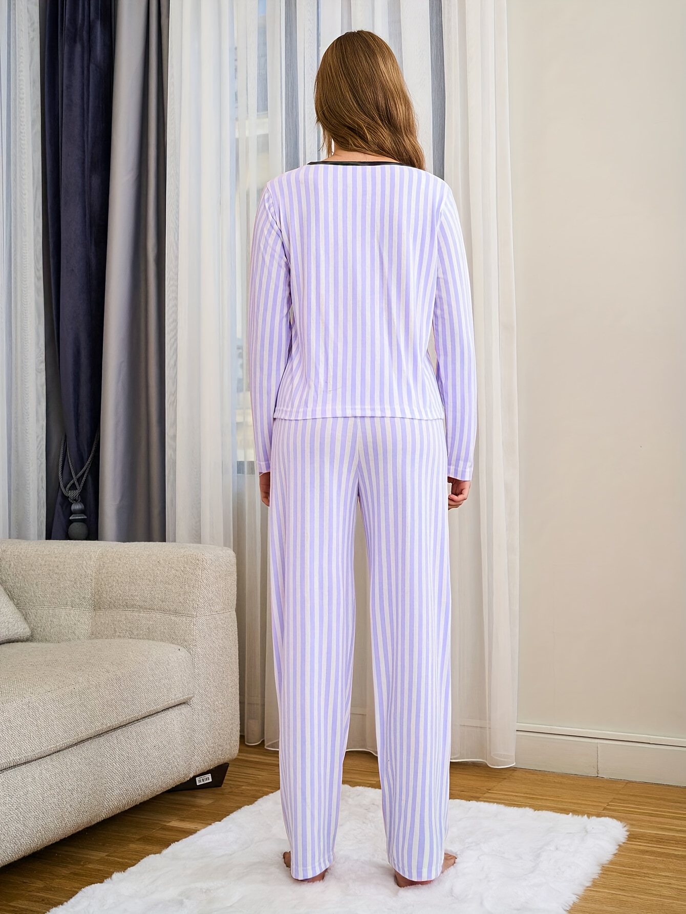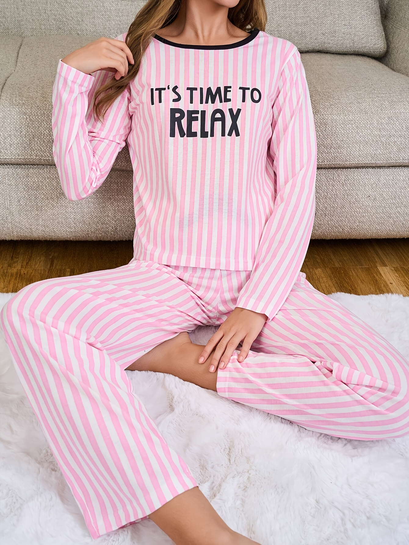 Bs0908 Women’s Autumn/Winter Pajama 2pcs Set, Casual Striped Themed Comfortable Loungewear, Loose Round Neck Long Sleeve Top and Elastic Waistband Pants, Elegant Holiday Women’s Wear, Perfect Gift Choice