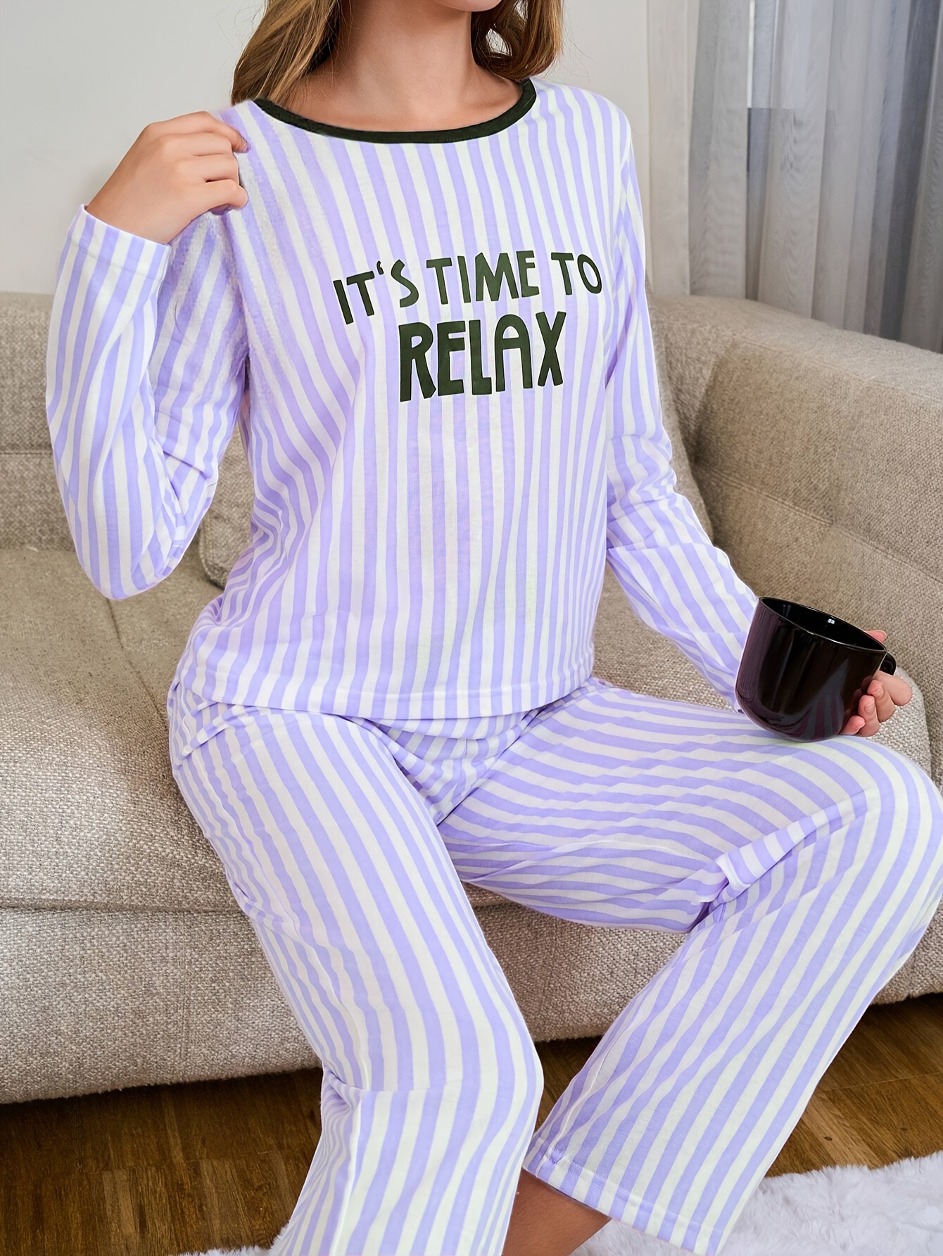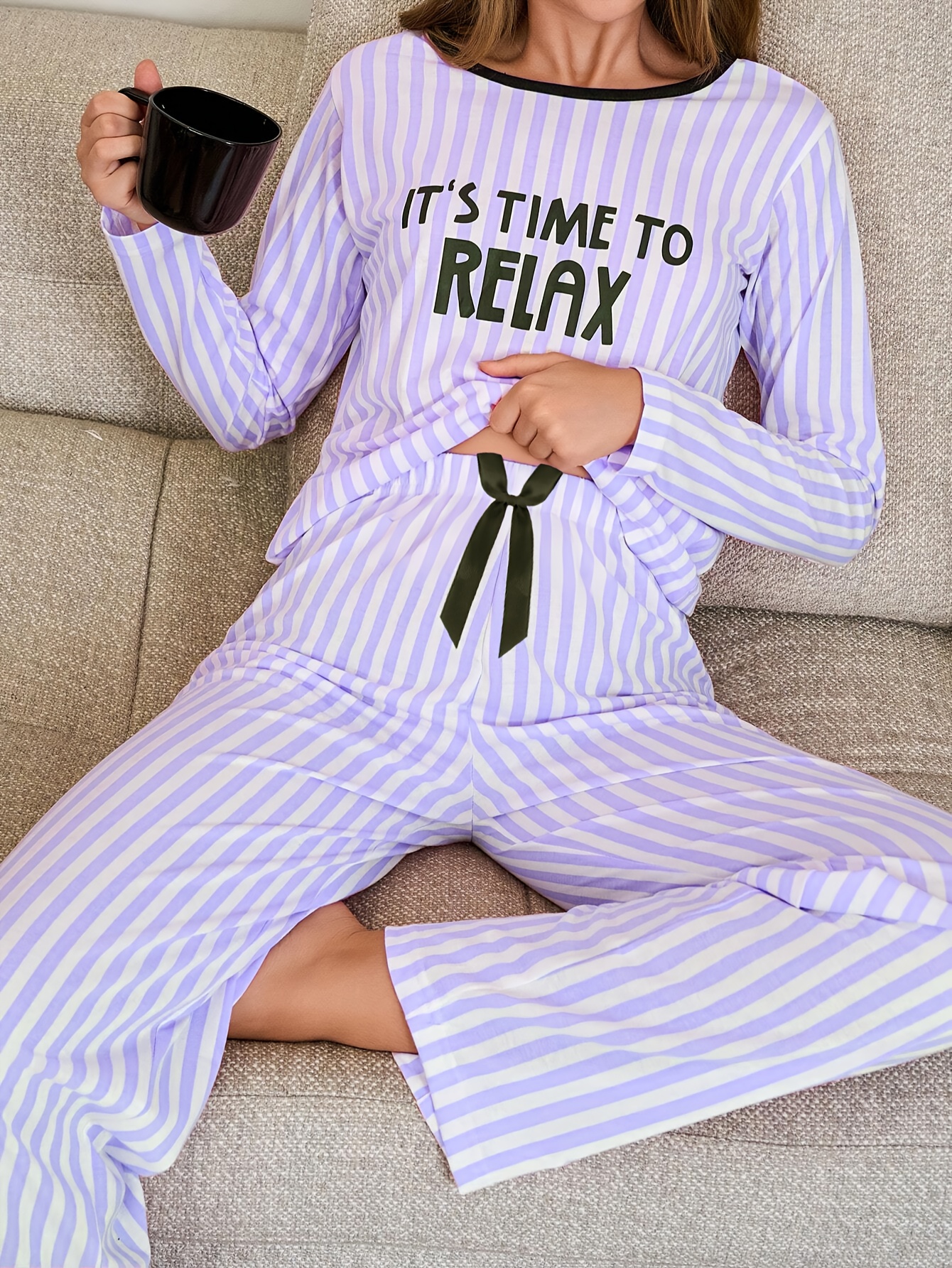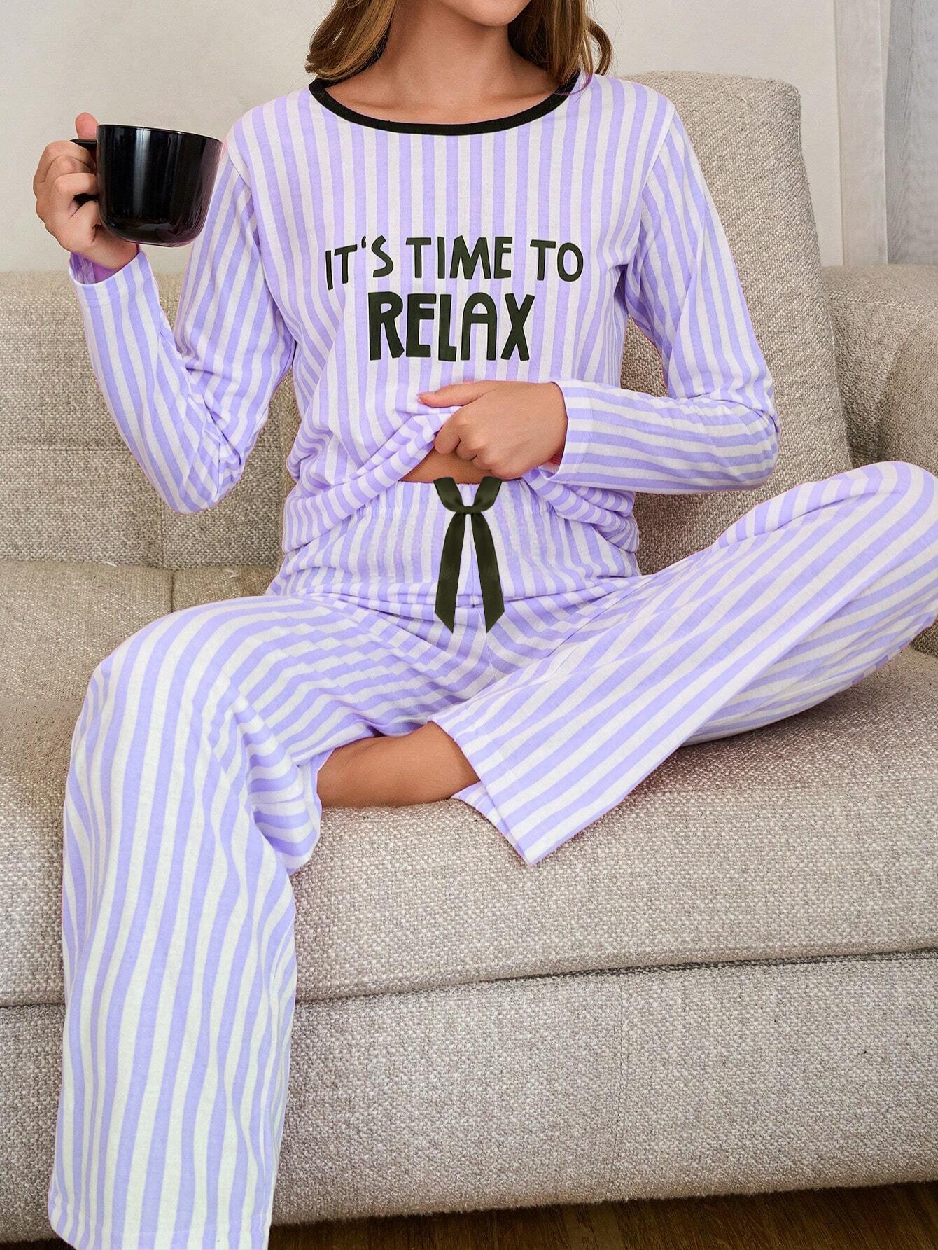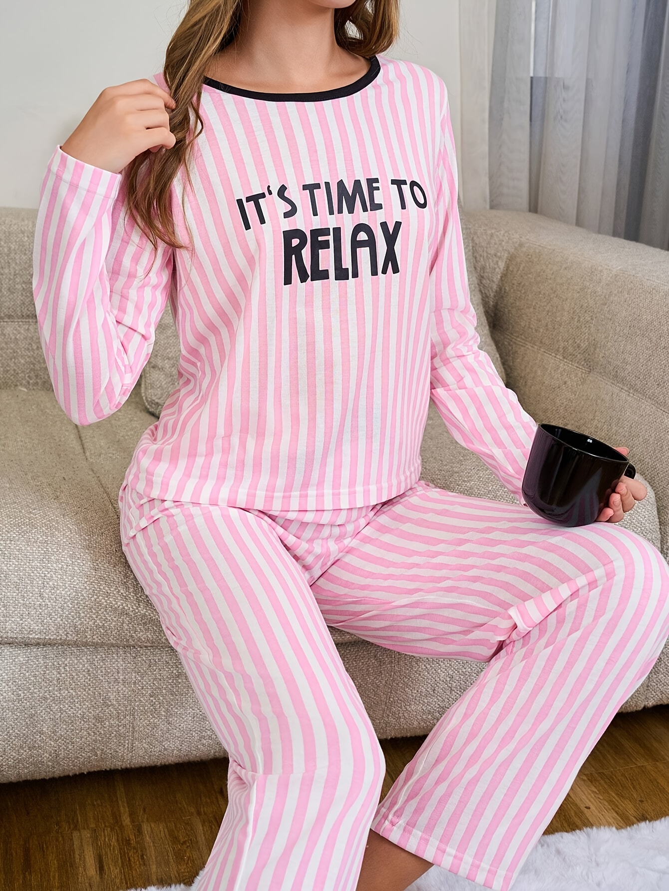 Bs0908 Women’s Autumn/Winter Pajama 2pcs Set, Casual Striped Themed Comfortable Loungewear, Loose Round Neck Long Sleeve Top and Elastic Waistband Pants, Elegant Holiday Women’s Wear, Perfect Gift Choice
