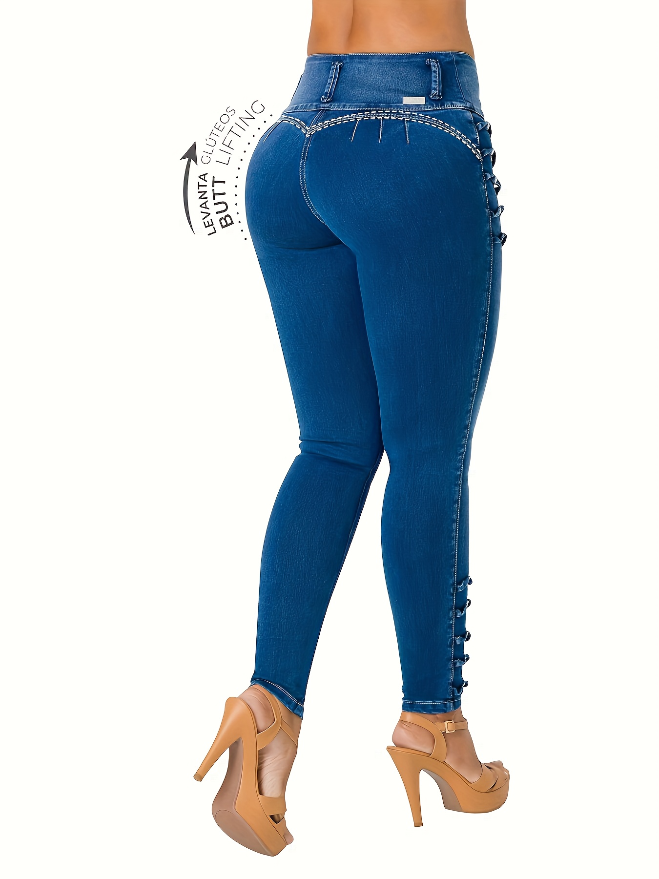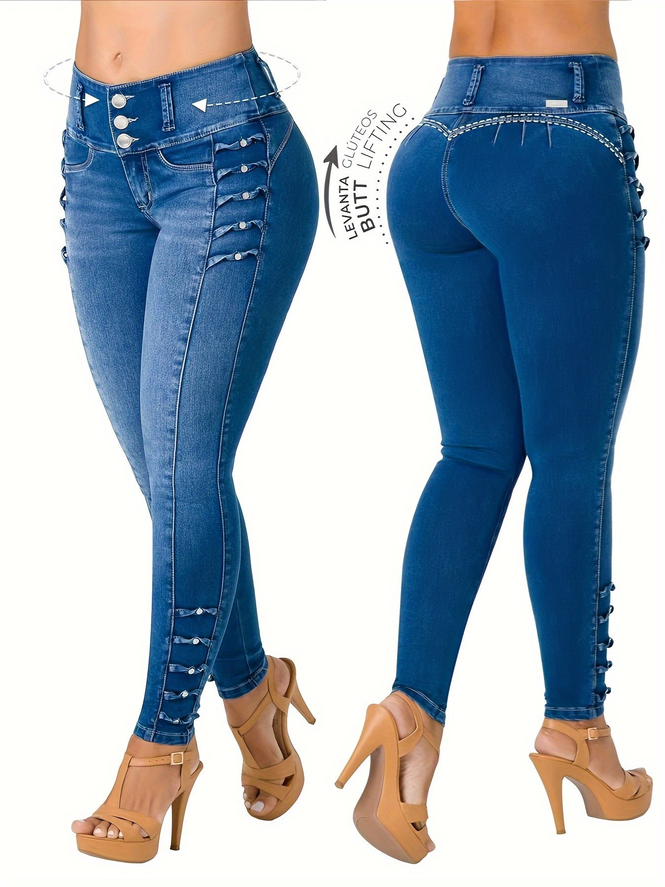 Casual Women’S Jeans with a Blue Wash, Featuring Front Buttons, Side Decorations, an Elastic Waist for a Lifting Effect, And a Snug Fit at The Ankles