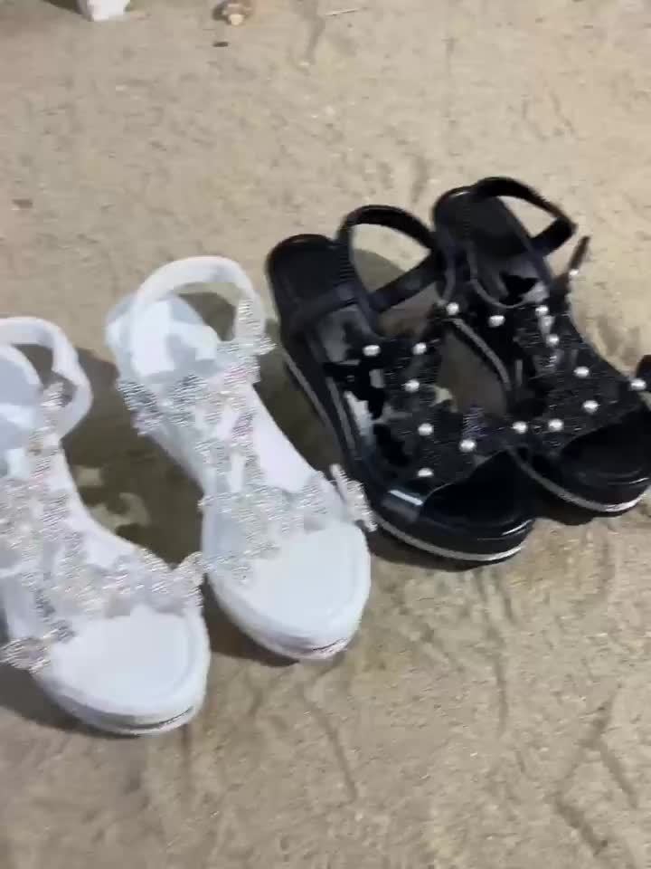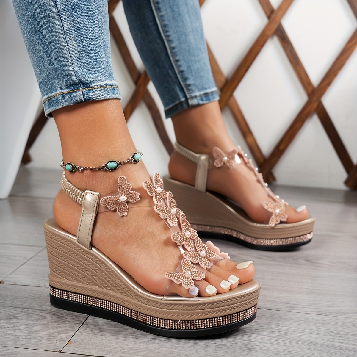 Charming And Elegant Ladies’ Wedge Sandals Adorned with Butterfly And Pearl Details – Featuring an Open Design, Thick Sole, And Slip-On PU Material.