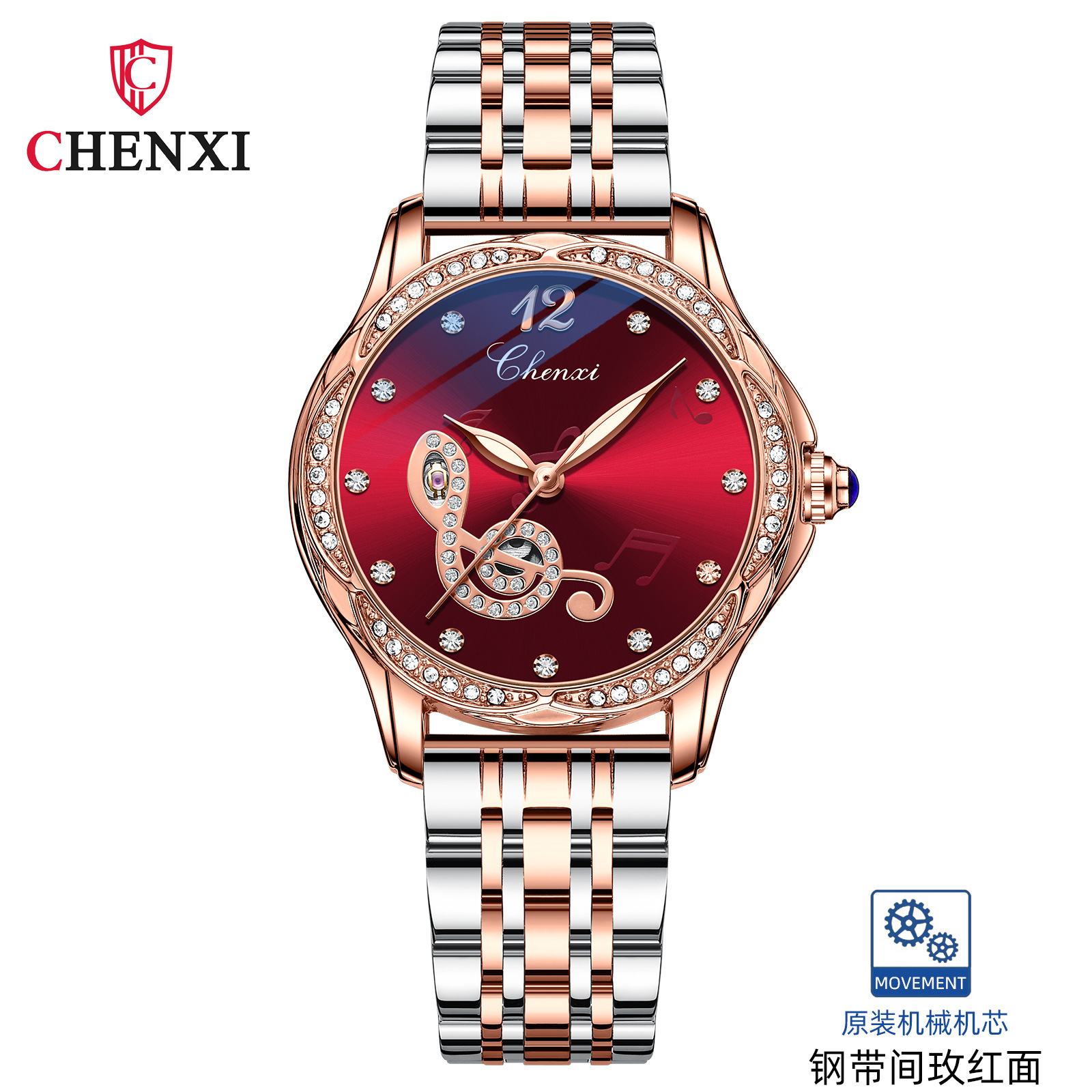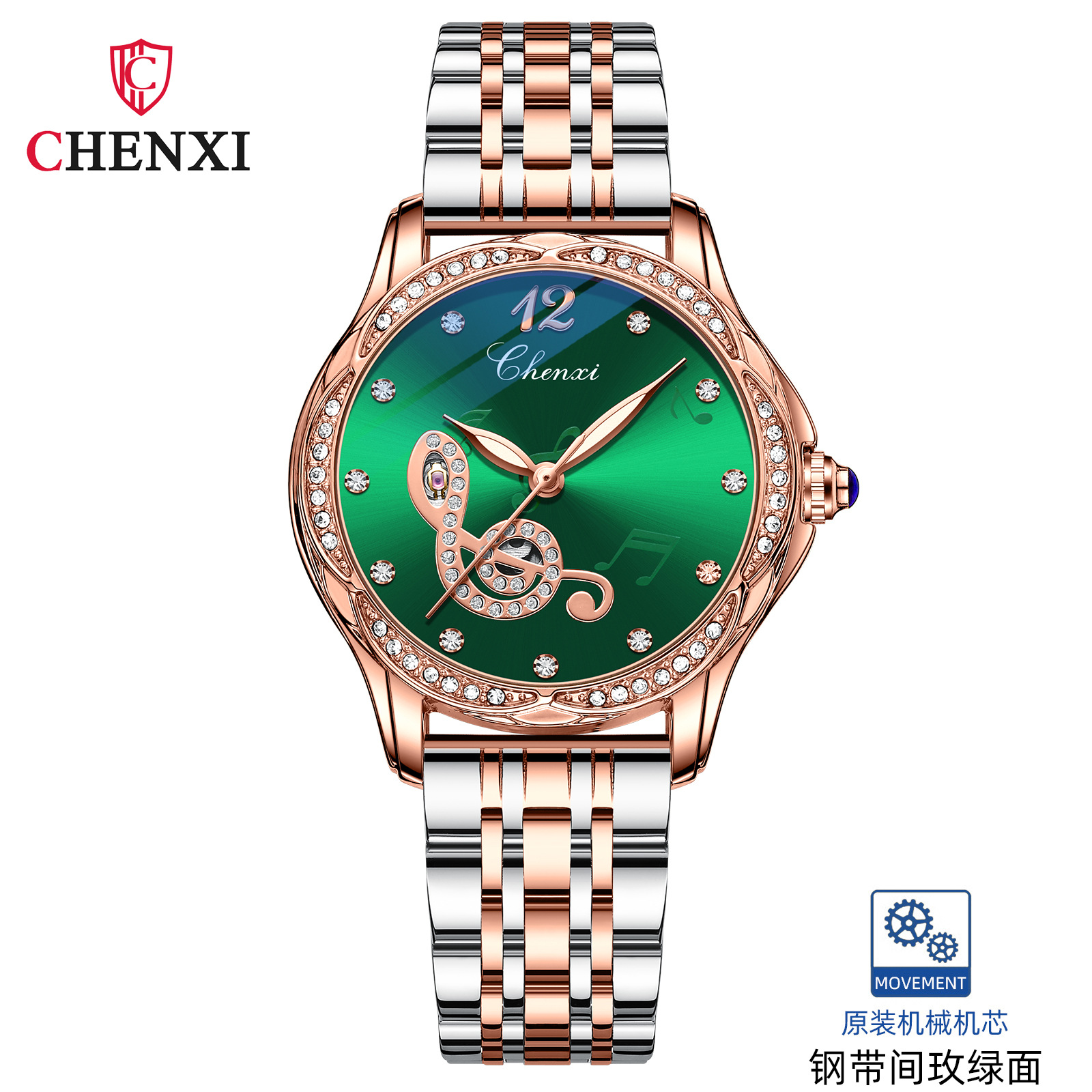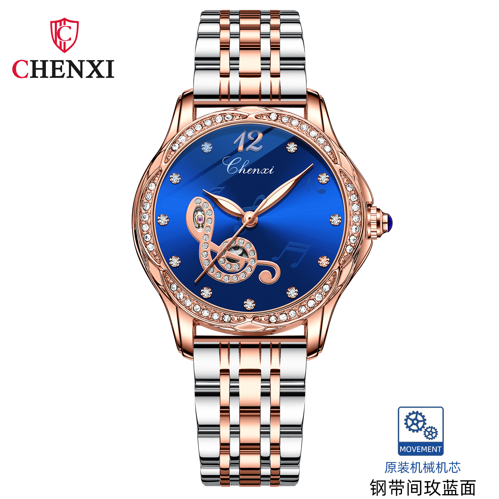 Chenxi Fully Automatic Mechanical Watch for Women | Double-Sided Hollow, Diamond-Encrusted, Luminous, Fashionable, Boho Style, Stainless Steel Band and Case