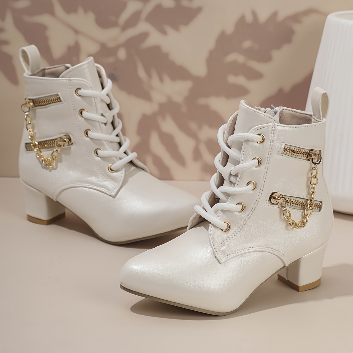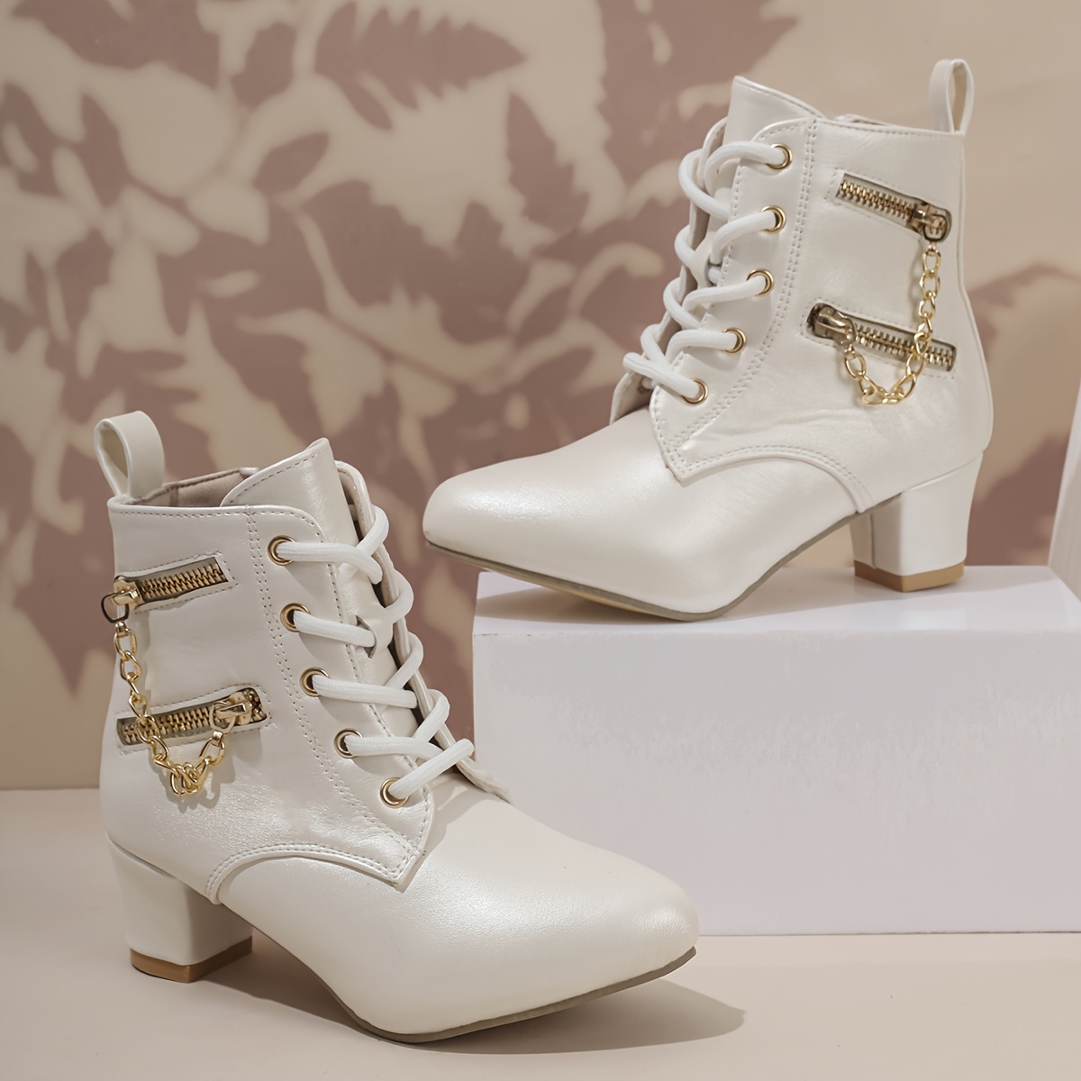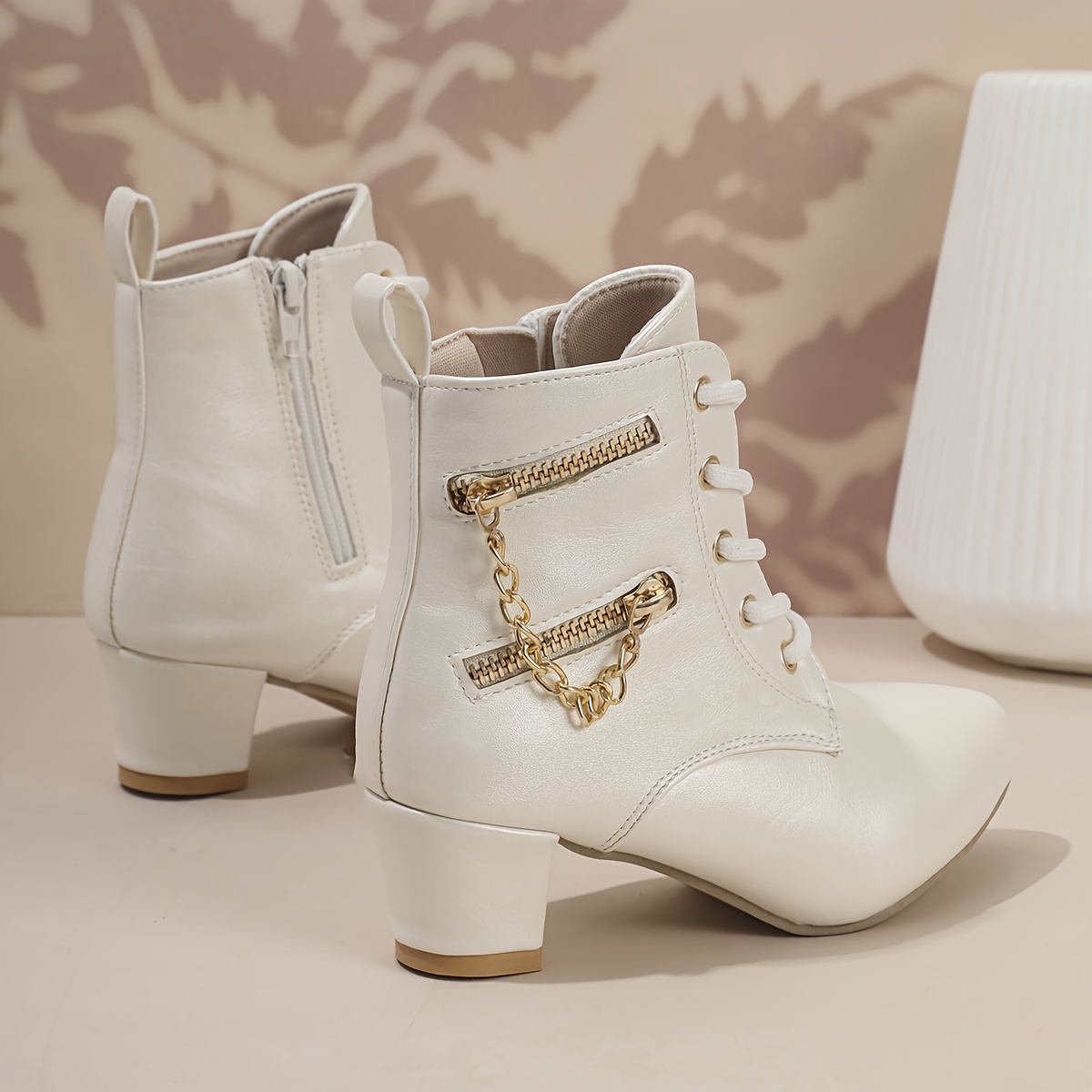[Chic White Ankle Boots] Chic Women’s White Ankle Boots | Double Zipper Chain Buckle Pointed Toe Chunky Heel | Comfortable Synthetic Cover, Versatile All-Season Wear, Stylish Outerwear Footwear | Elegant Boot Design | Durable TPR Sole