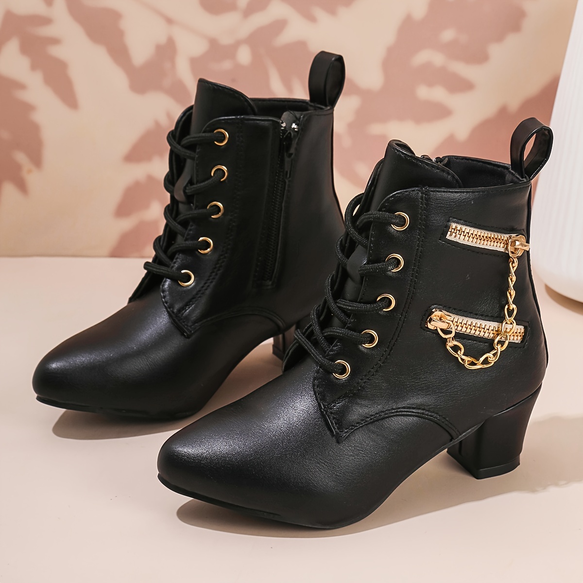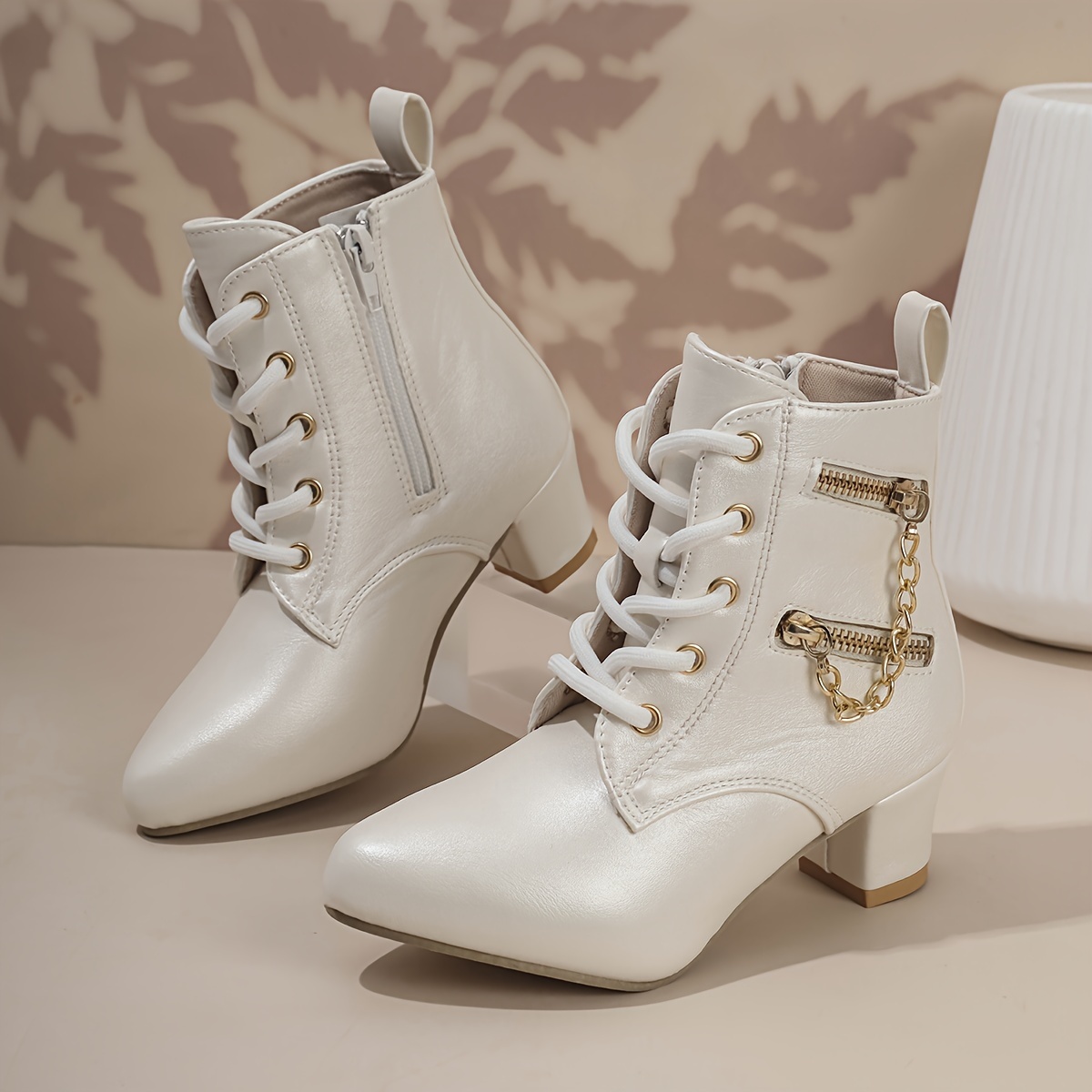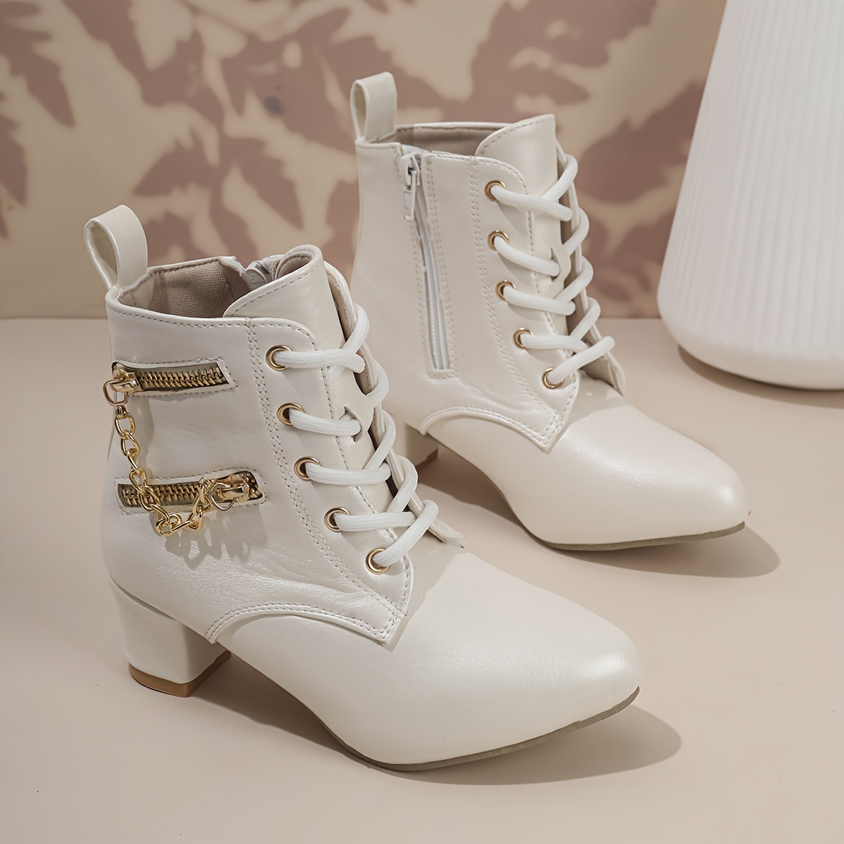 [Chic White Ankle Boots] Chic Women’s White Ankle Boots | Double Zipper Chain Buckle Pointed Toe Chunky Heel | Comfortable Synthetic Cover, Versatile All-Season Wear, Stylish Outerwear Footwear | Elegant Boot Design | Durable TPR Sole