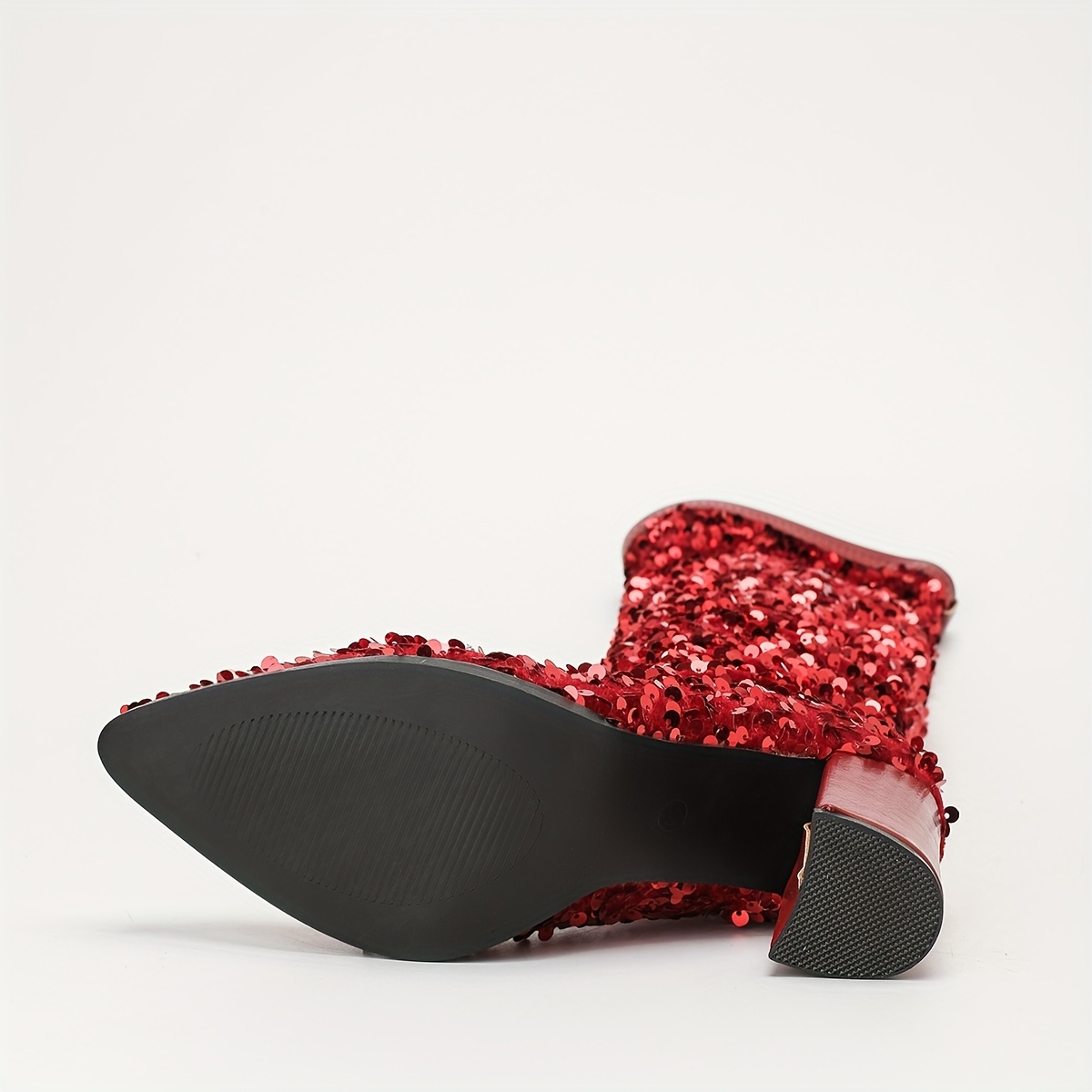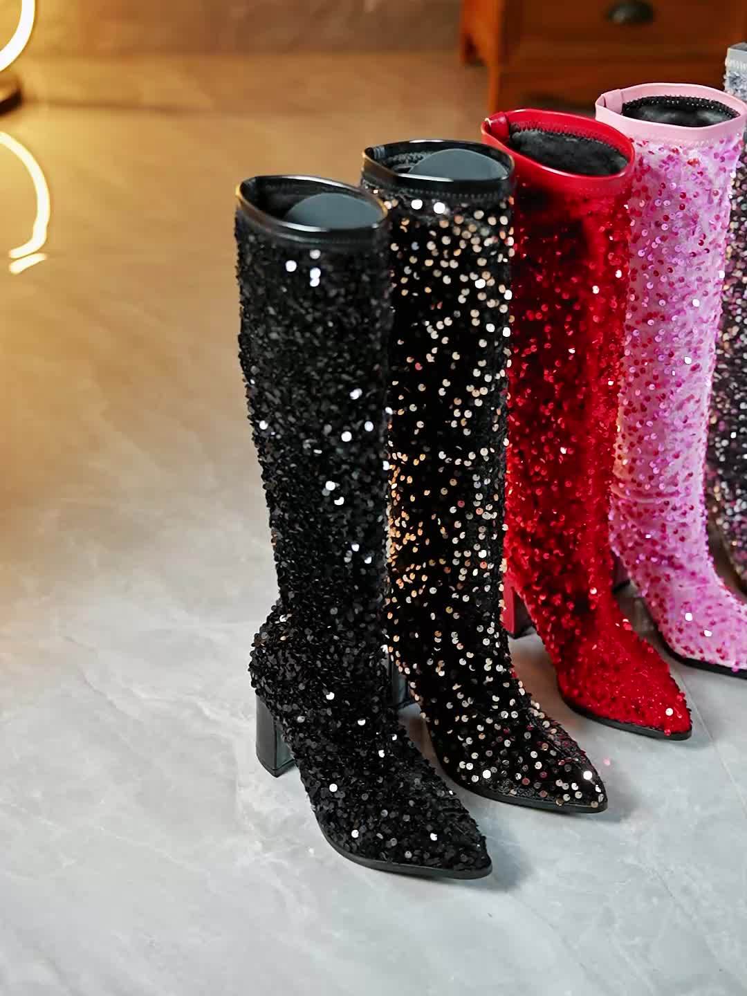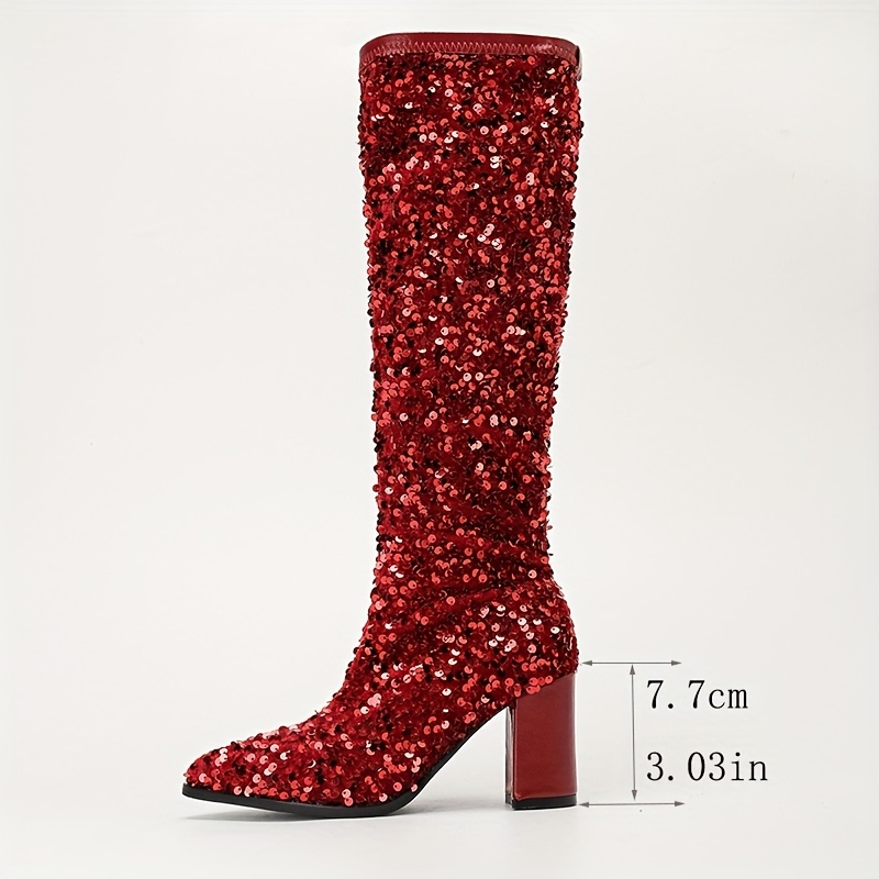 Christmas Red Full Sequin Over-the-Knee Boots, Chunky Heel & Pointed Toe Design, Create a Shining Focal Look for Festive Occasions