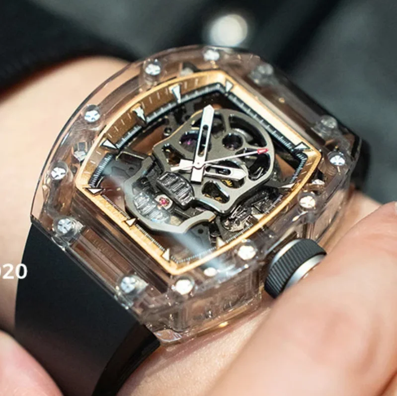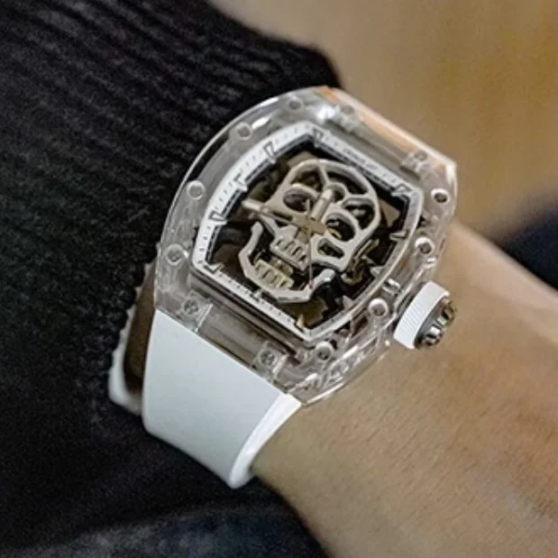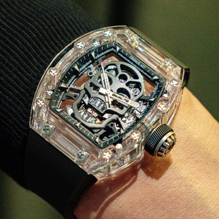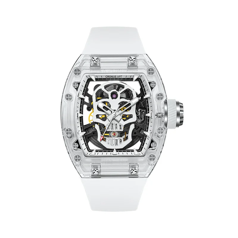CRONUSART Men Automatic Watch 50mm Mechanical Wristwatch Sapphire Tonneau Case Luminous Fluororubber Strap Skeleton Skull Dial