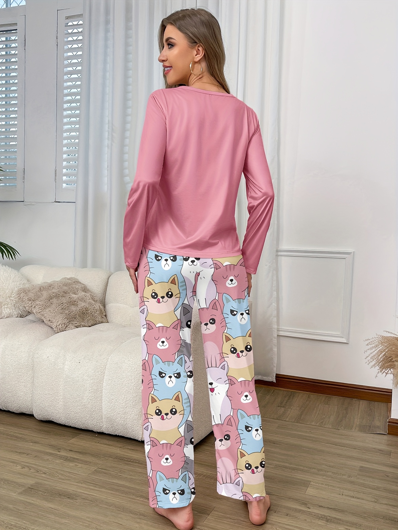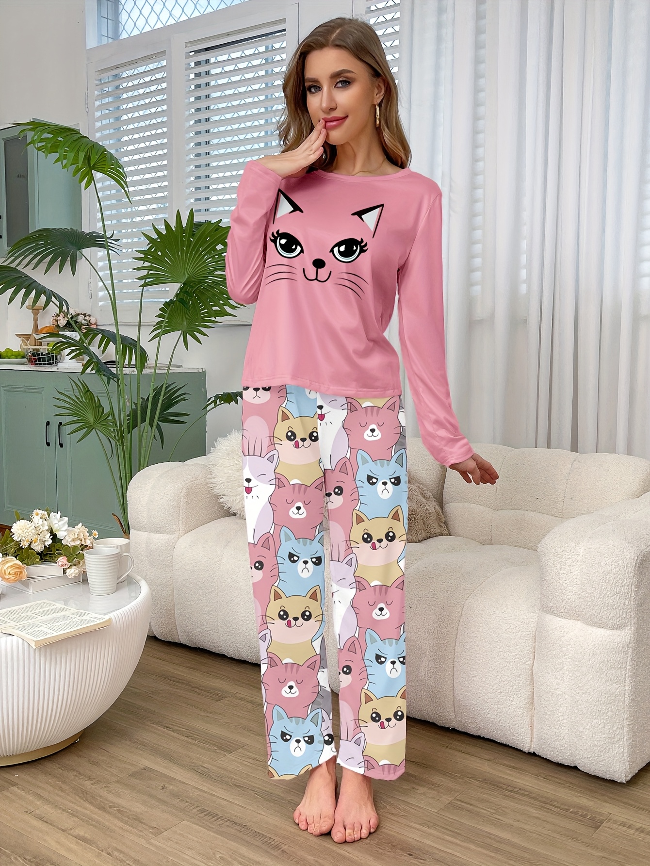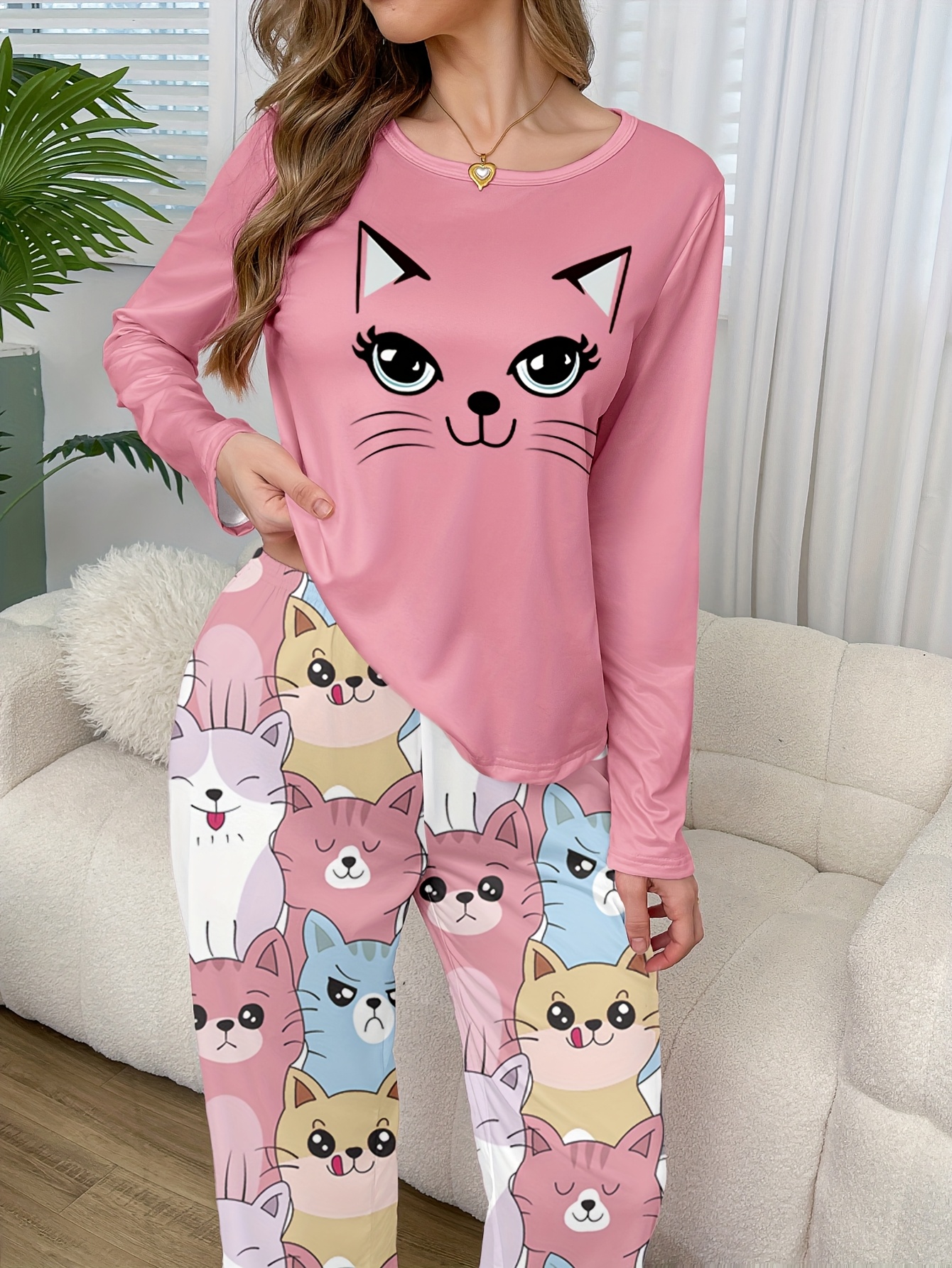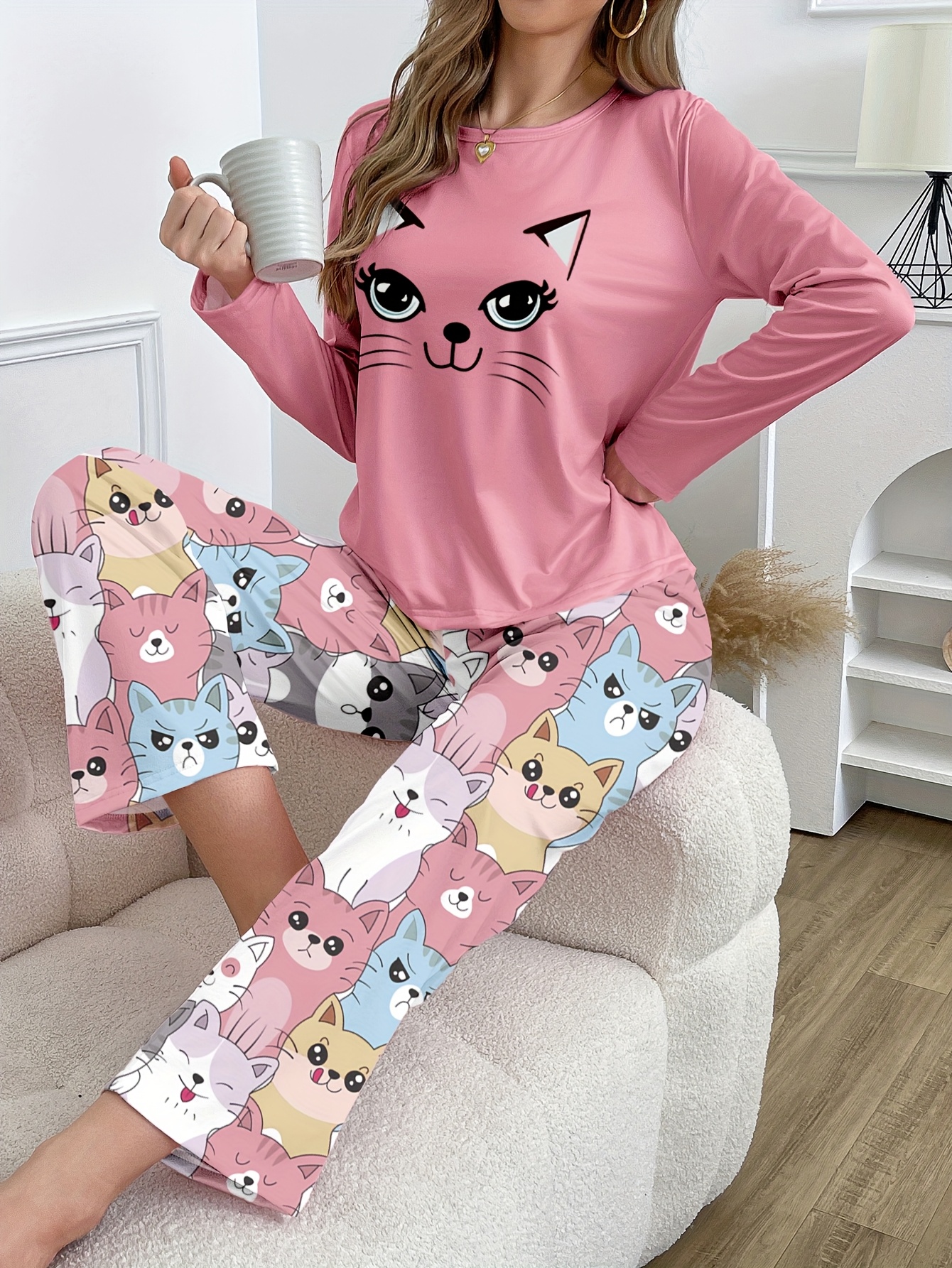 Cute Cat Print Pajama Set, Women’S Long Sleeve Crew Neck Top & Pants Home Wear Two Pieces Set for Fall & Winter