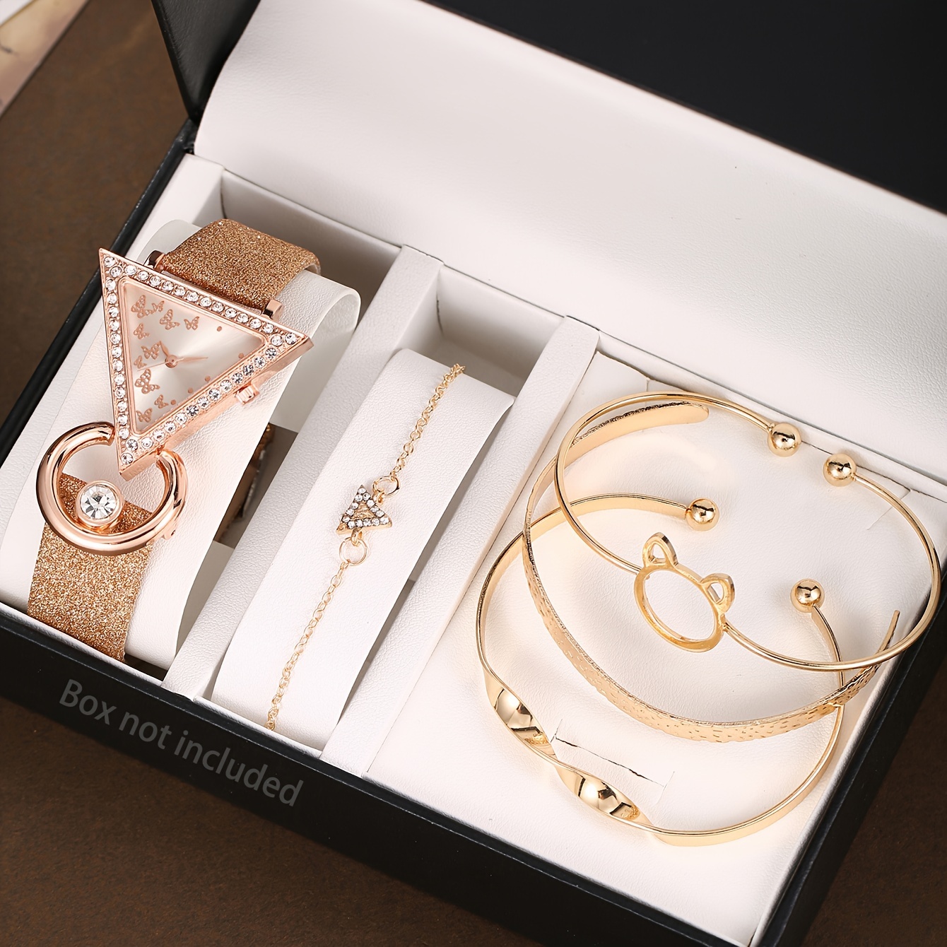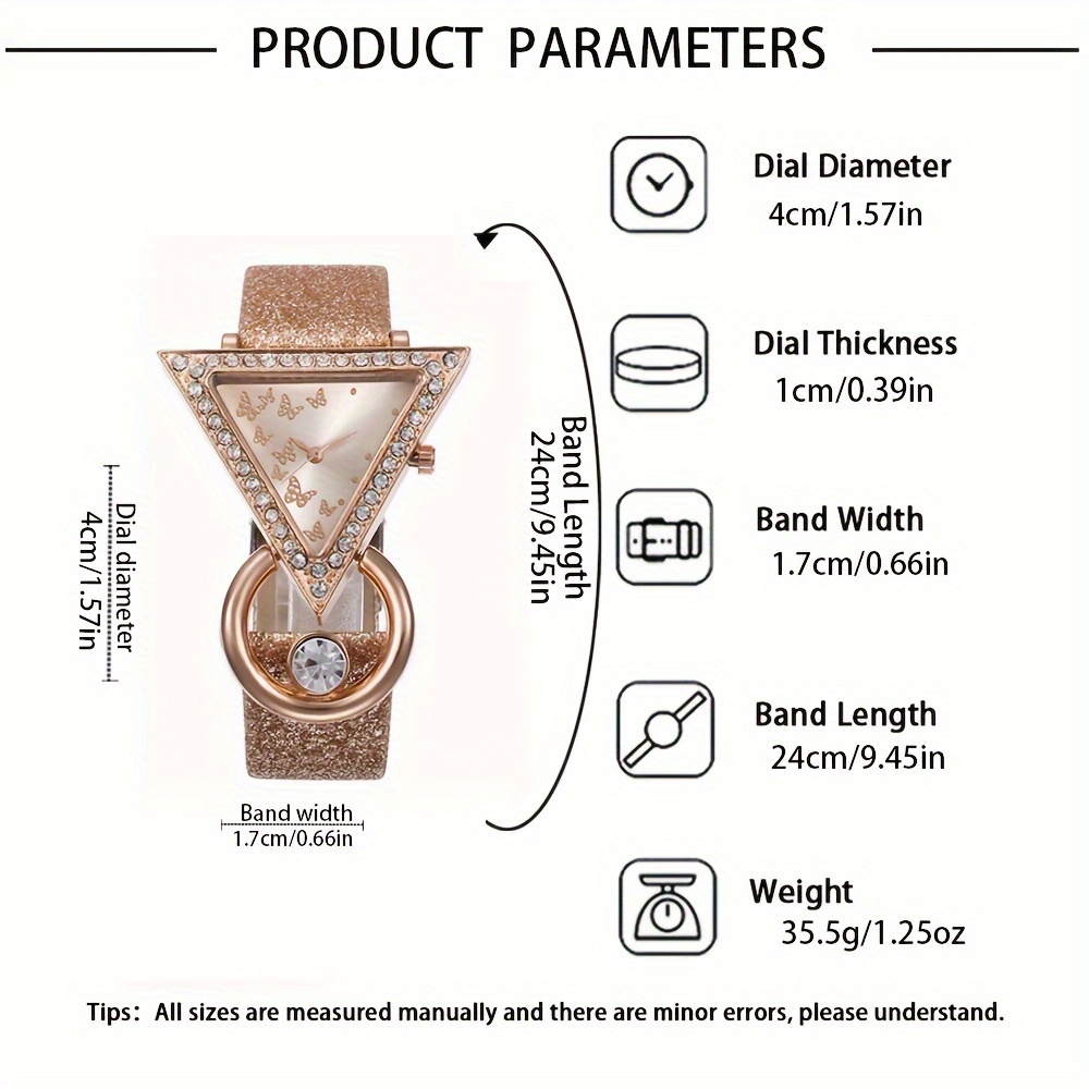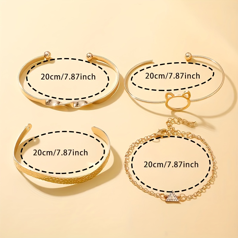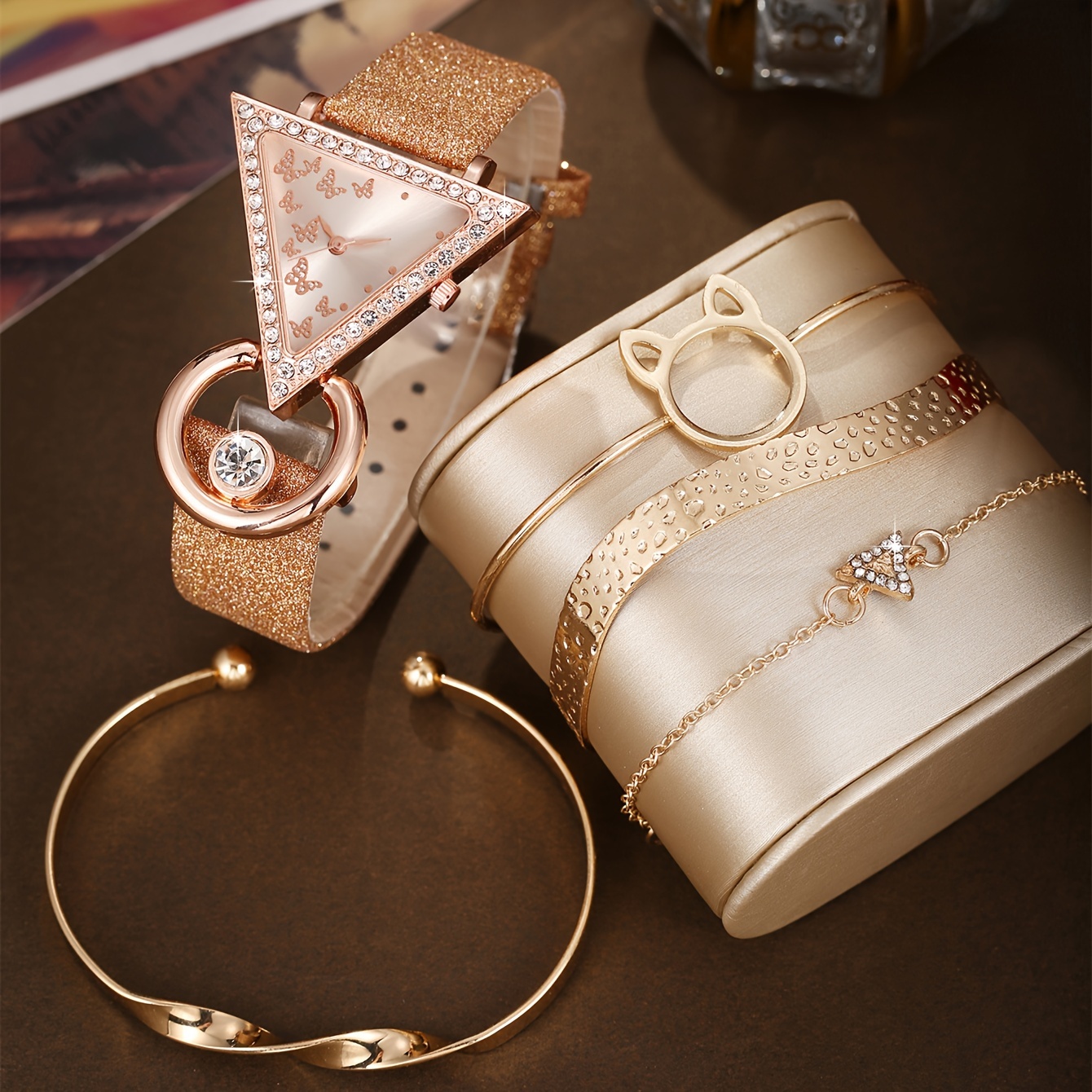 [Cute Quartz Watch] 4-piece Set Of Cute Cat Bracelets + Creative Inverted Triangle Rhine Quartz Watch | Fashionable Fashion Lady’s