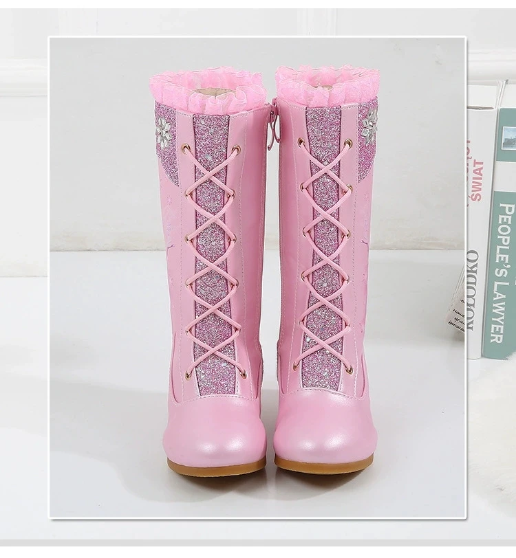 Disney Girls’ Leather Boots Winter Frozen Boots Side Zipper High Plush Princess Elsa Boots Warm Children’s Boots Size 27-37