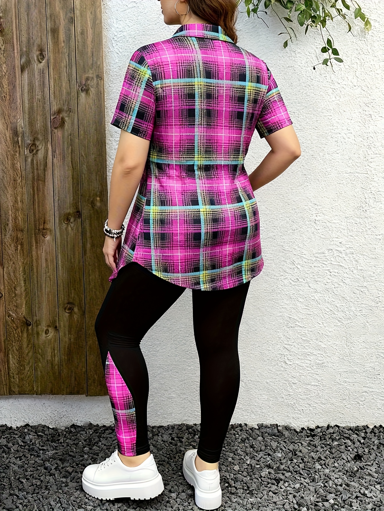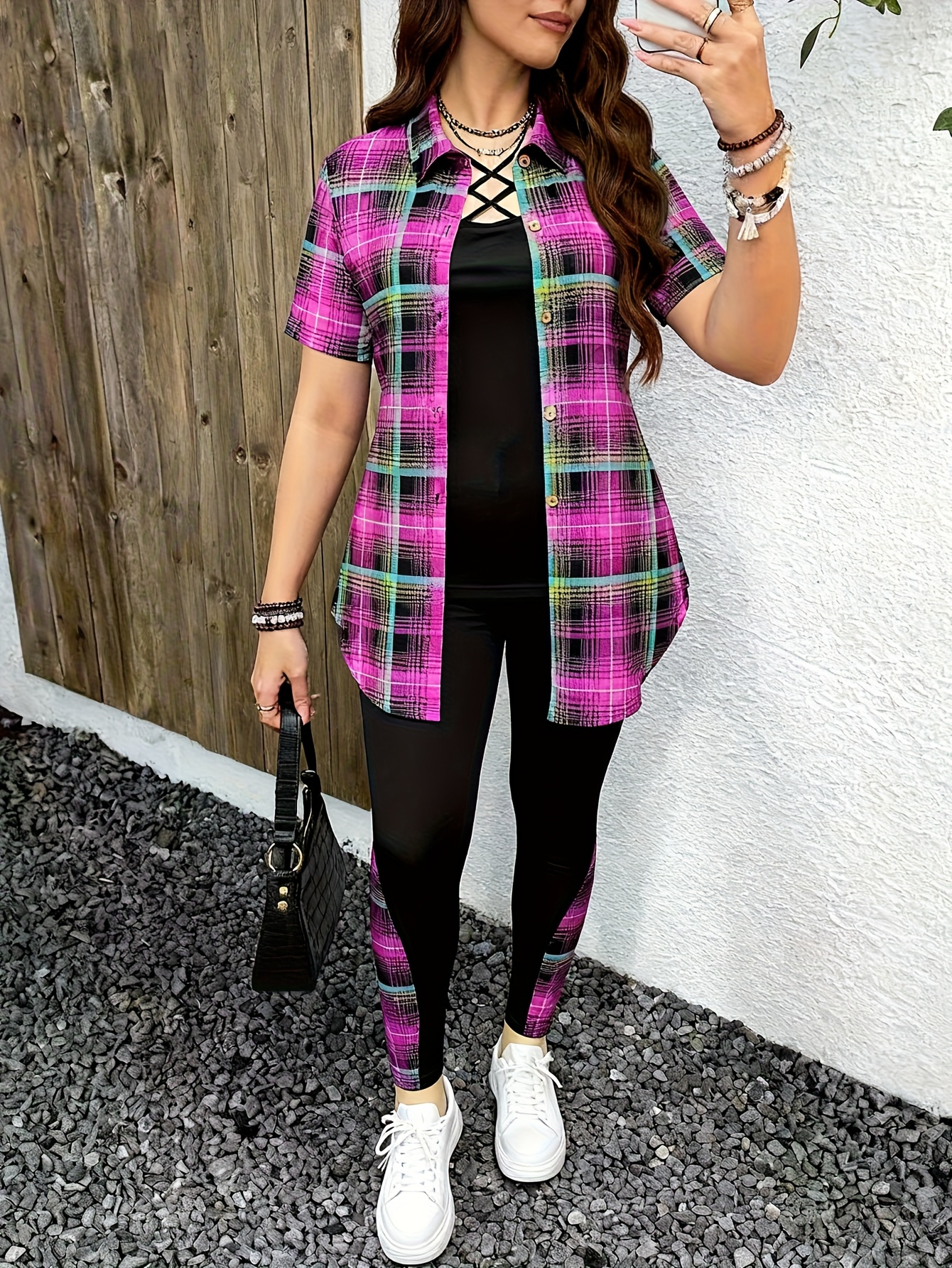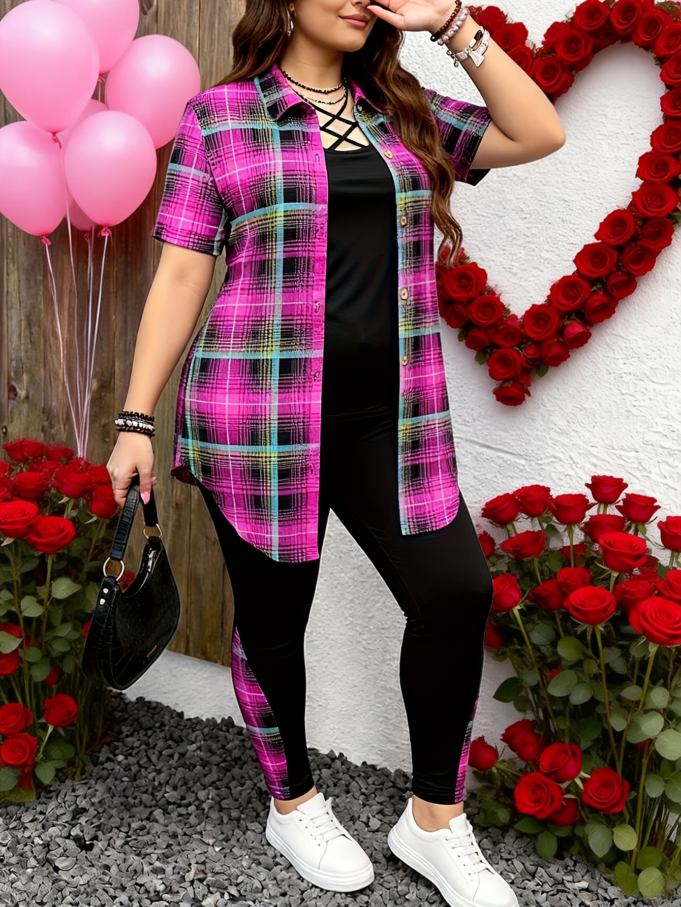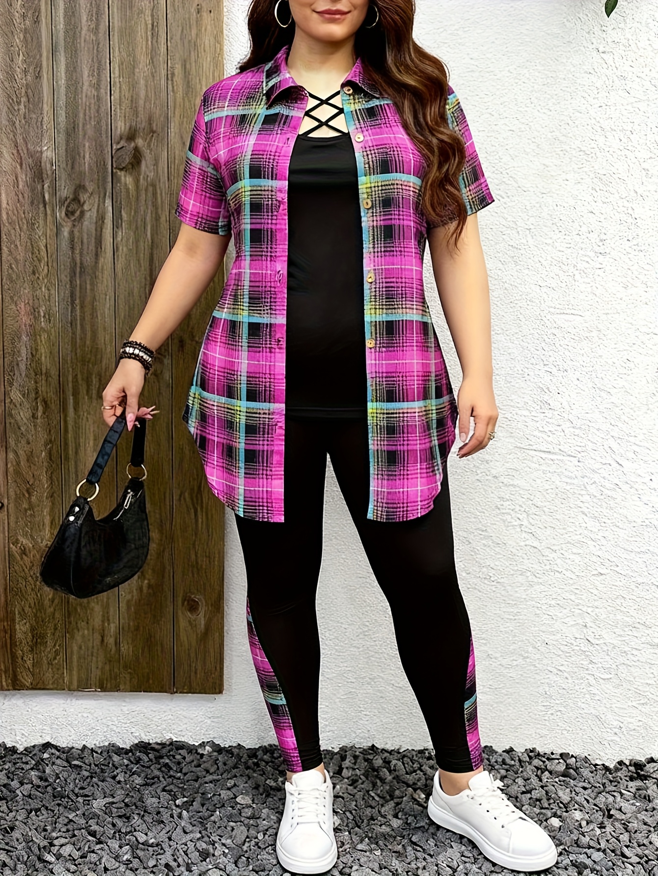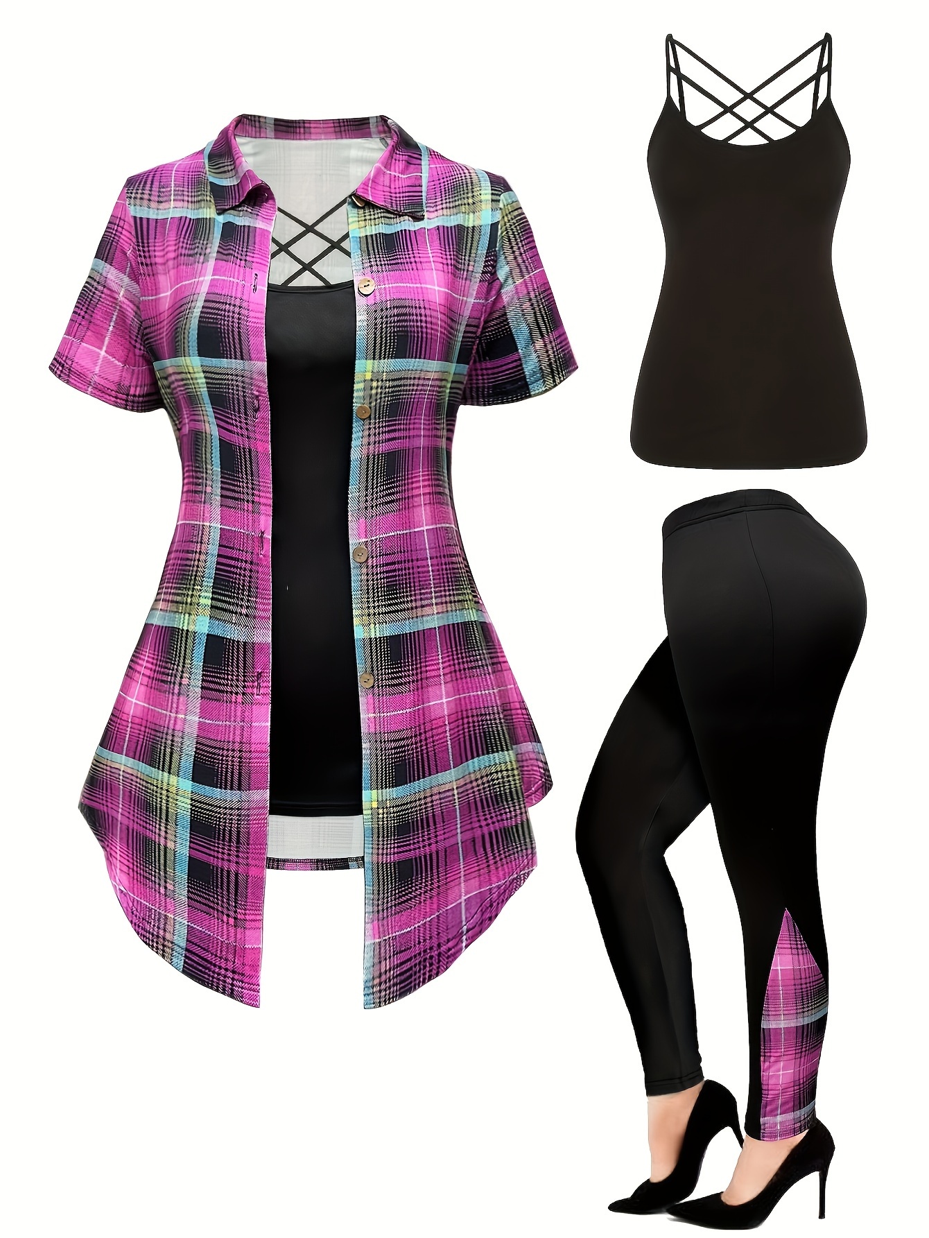 Elegant 3-Piece Set – Plus Size Fashion Printed Polyester Blend – Round Neck, Stretch Knit Fabric, Plaid Pattern with Cross Straps, Casual Outfit