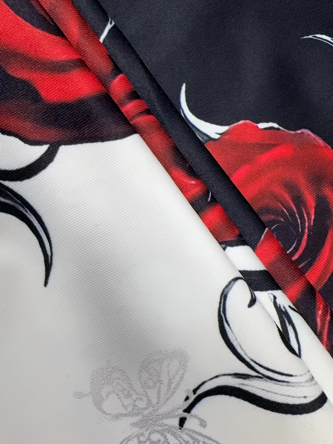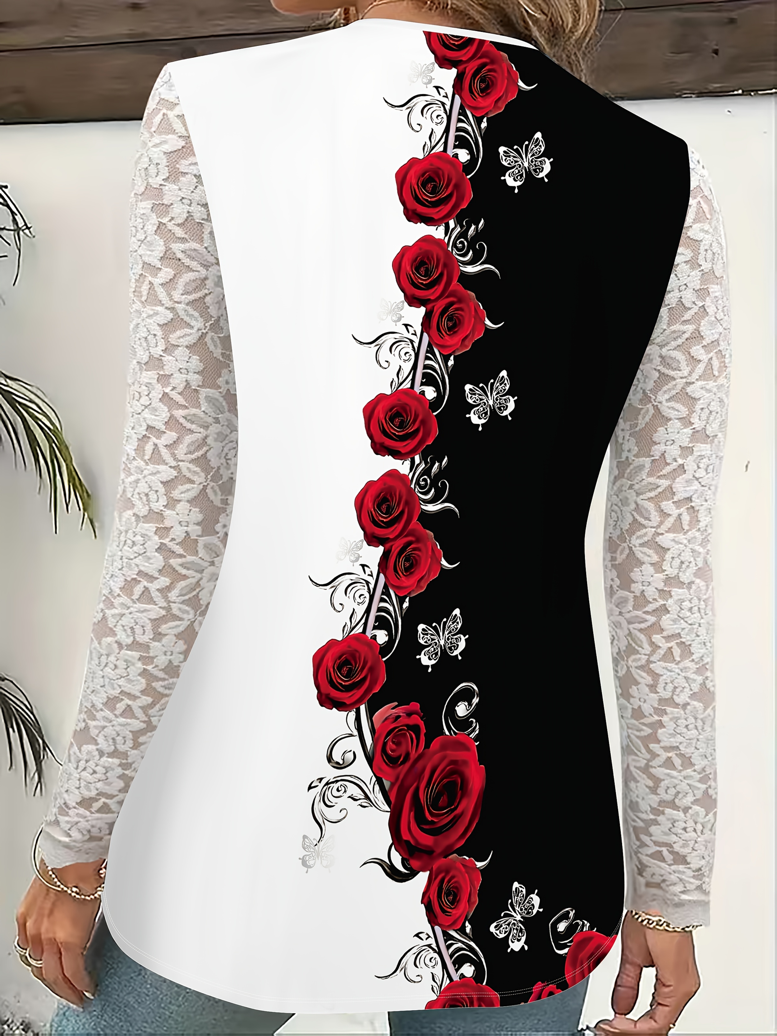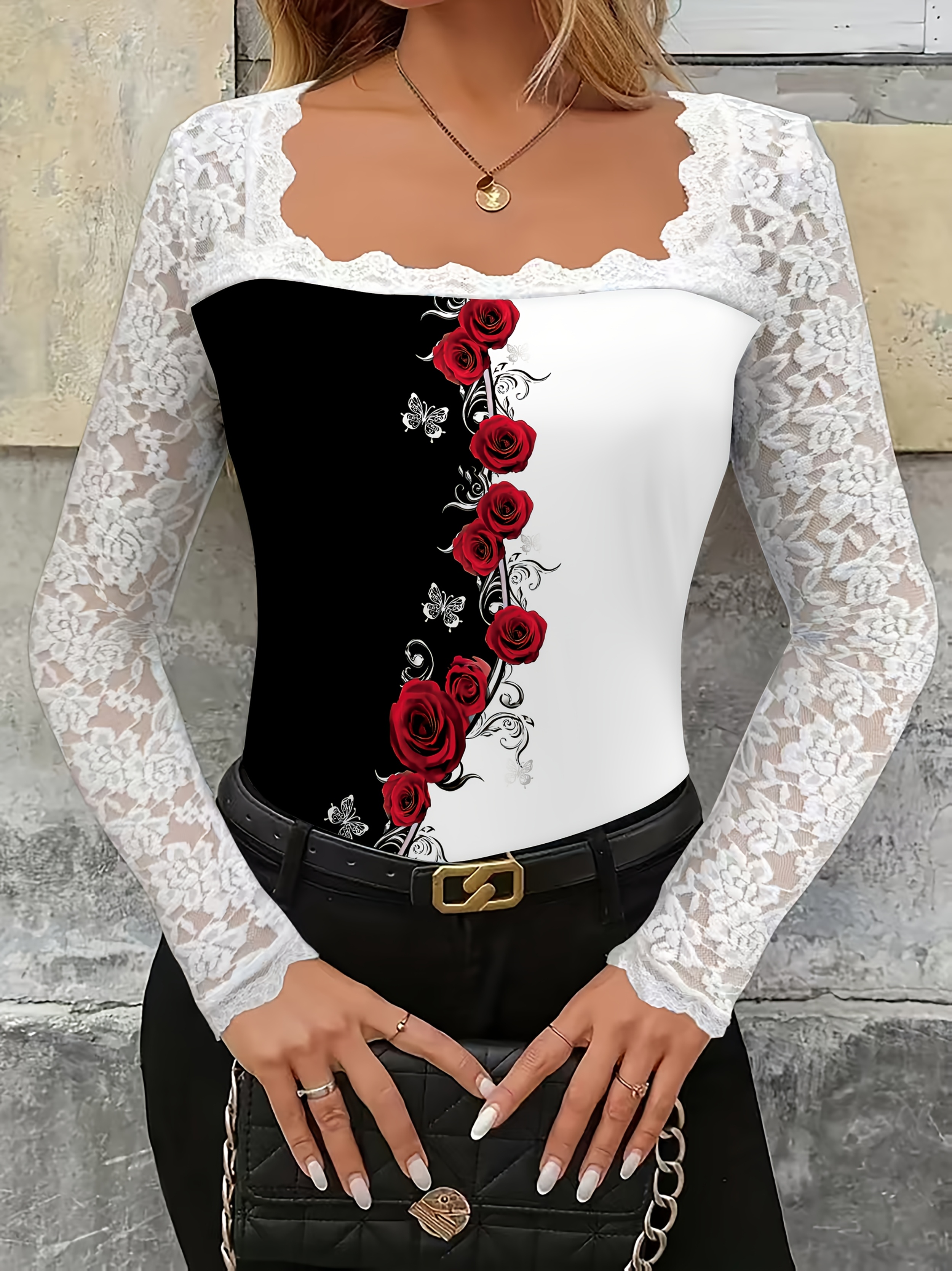 Elegant Directional Long-sleeve Square-neck White Lace Sleeve Patch Print T-shirt, Fashionable Trendy Women’s 3D Rose Flower Print Dye Women’s Top