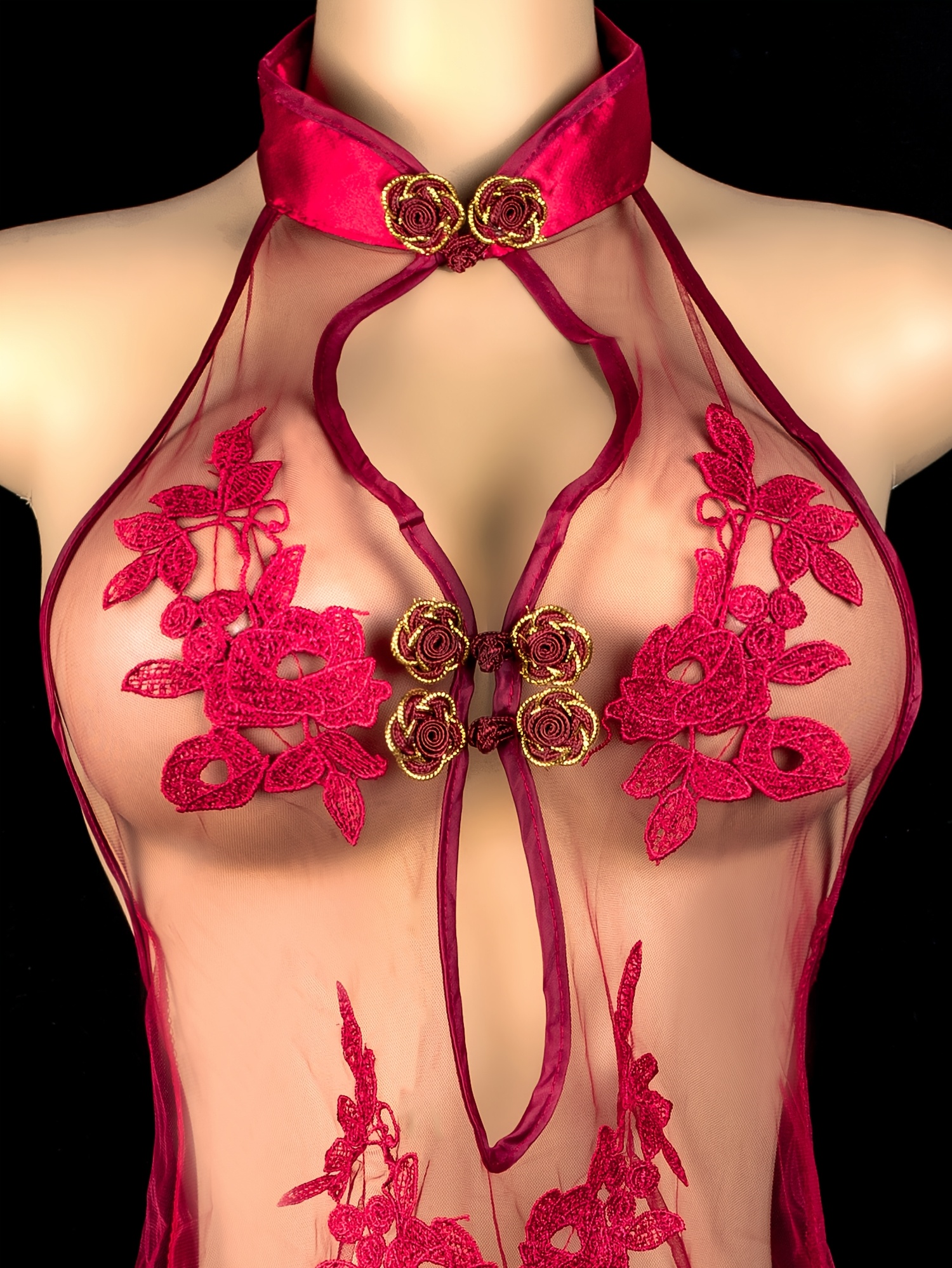 Elegant Red Chinese Cheongsam Dress for Women, Includes Panties, Featuring Ethnic Style Embroidery, Sheer Mesh, And a Backless Design, Suitable As Sleepwear Or a Bodysuit